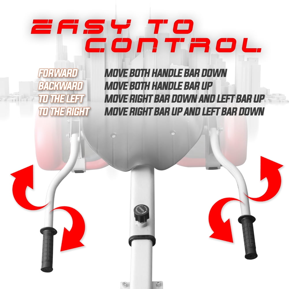 (HOVERCART ONLY. Hoverboard not included). Sit on the cart, keep the handles level, then turn on the power switch Forward: press the two handles back – Backward: put up the two handles Left turn: hold the left handle still, and press down the right handle Right turn: hold the right handle still, and press down the left handle
