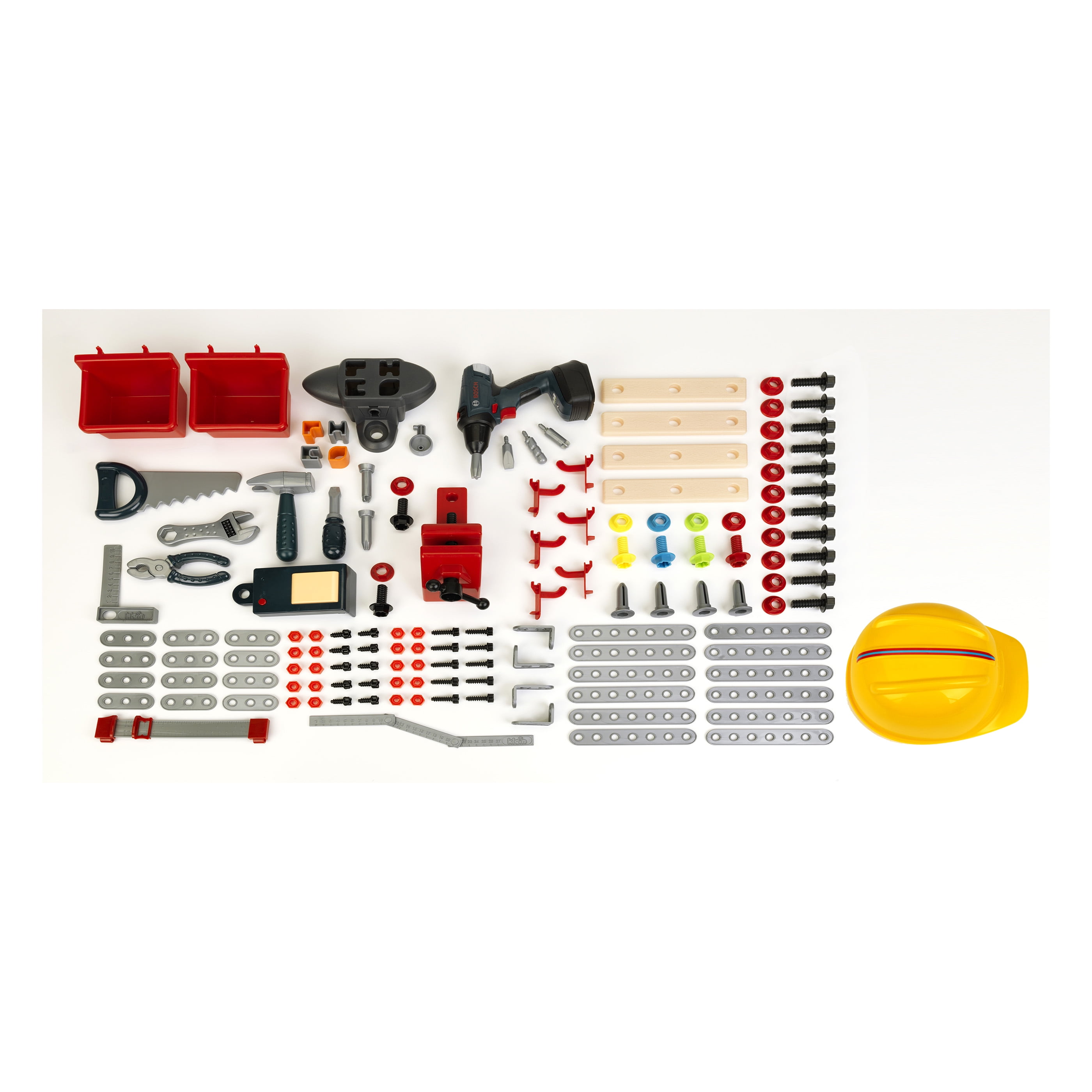 The largest Bosch workbench made! This 40″ tall Jumbo workbench has many different sized nuts and bolts, simulated wood spanners, different sized expanders, tool hangers, level, handscrewdriver, hammer, wrench, pliers, saw, battery operated Bosch screwdrvier/drill with 4 bits , belt sander, anvil and workbench sounds – 138 pcs in all! The Bosch tool bench looks just like Dad’s. Let your little carpenter get to work!