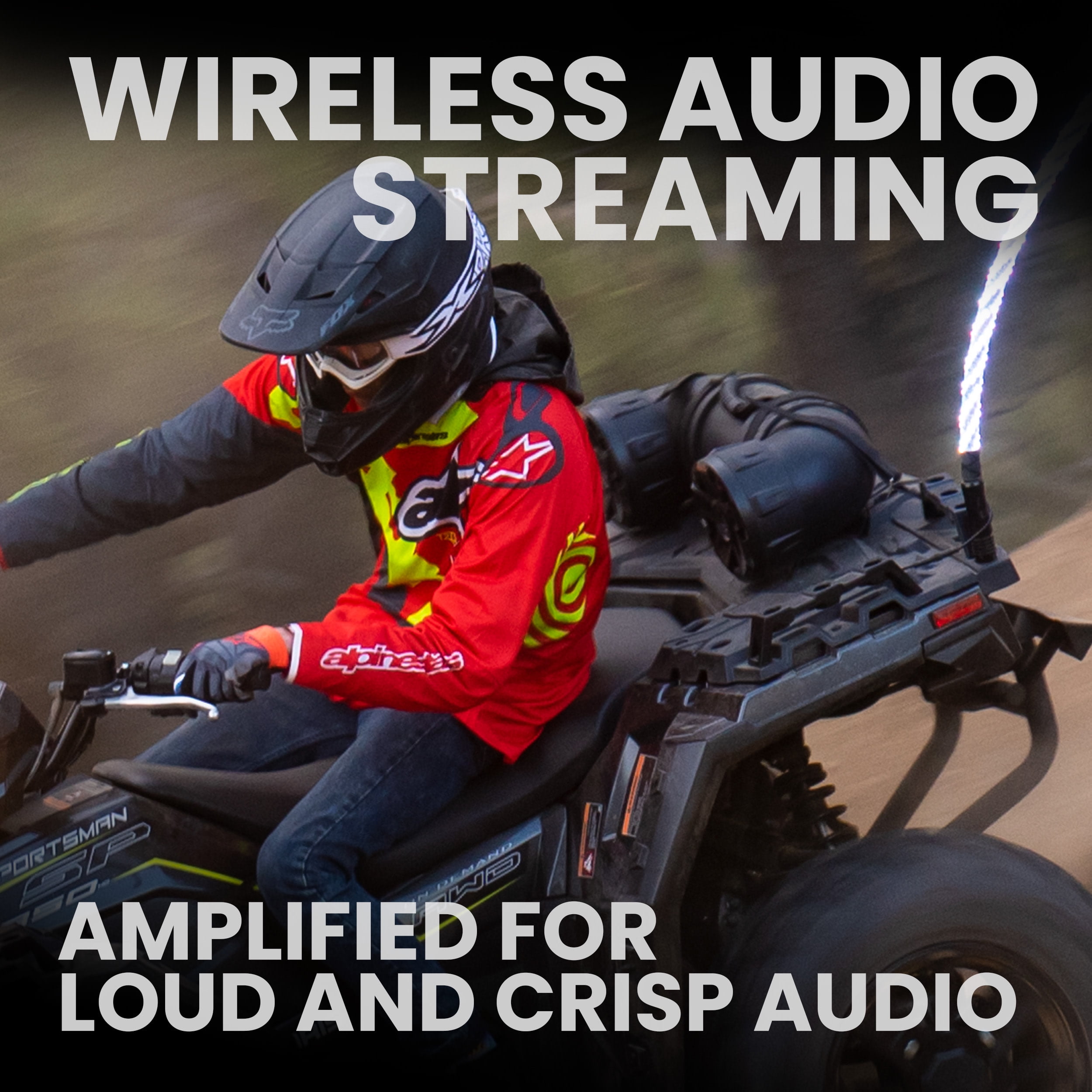 This fully marinized system with RGB LED Lighting and Wireless Remote Control is plug and play, controlled with your Smartphone or MP3 player via Bluetooth. Stream your Favorite Music or Music Service like Spotify or Pandora Wirelessly. Ideal for ATV’s, UTV’s, Side by Sides and Tailgating.