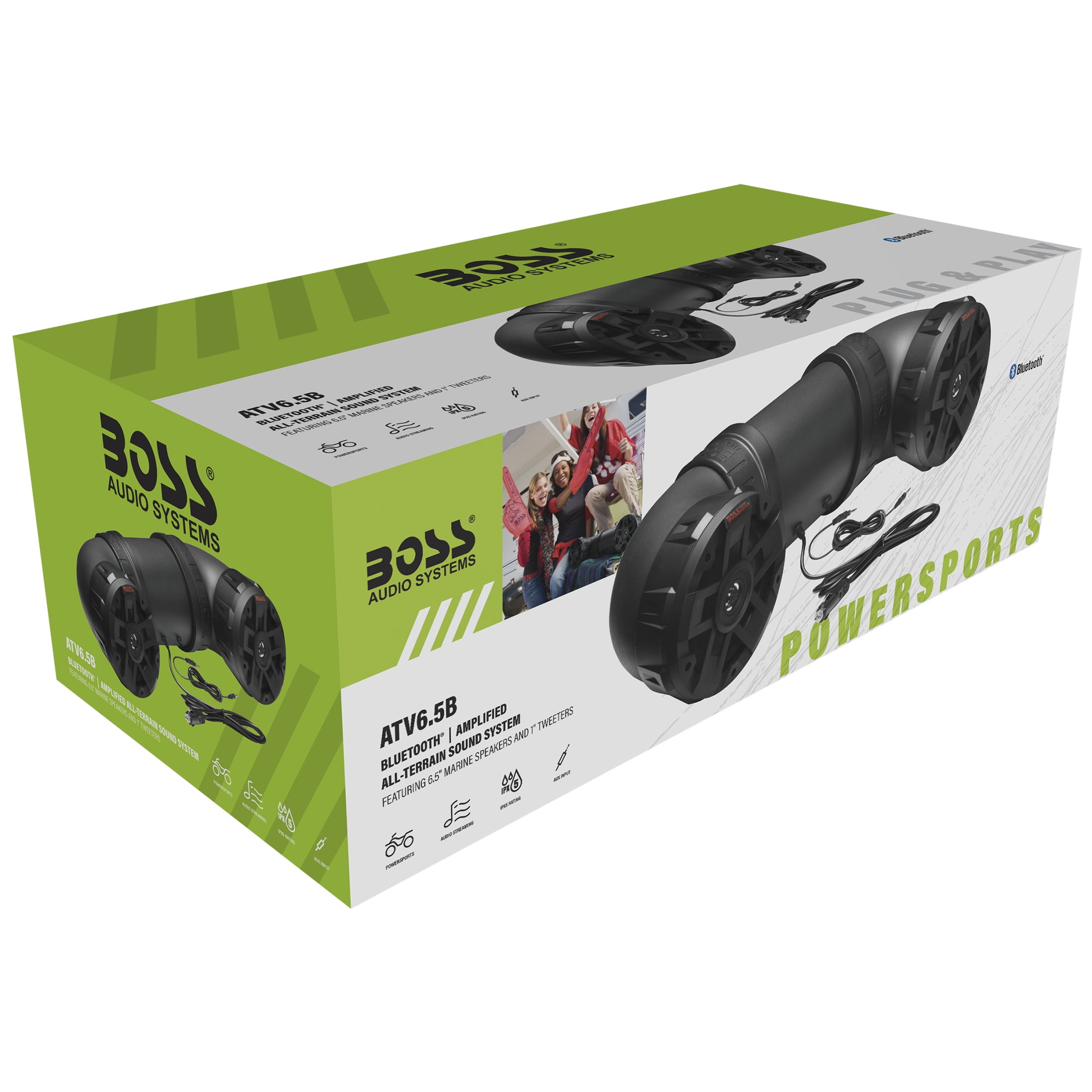 BOSS Audio Systems ATV6.5B ATV UTV Sound System – 6.5 Inch Speakers, 1 Inch Tweeters, Full Range, IPX5 Weatherproof, Bluetooth, Built-in Amplifier, Golf Cart Compatible Enjoy the great outdoors with your favorite tunes while riding your ATV, tailgating or camping with the SSL BTB6 BoomTube Weatherproof Powersports Plug & Play System. Compatible with any 12V power source, this unit features high quality sound with the 450 Watt Max Power Amp, 6.5″ Marine Speakers and 1″ Tweeters. Hook the Audio Output of your Smartphone or MP3 Player to the Auxiliary Input to max out your music options. Bluetooth Audio Streaming lets you wirelessly play your favorite music apps like Spotify and Pandora. Control it all with your Smartphone or MP3 Player. The BTB6 is Weatherproof to provide protection against the elements. Feel your music vibes wherever you go with the SSL BTB6. ATV UTV Weatherproof Sound System – 6.5 Inch Speakers, 1 Inch Tweeters, Built-in Amplifier, Bluetooth Gear up for great music on your next ATV adventure, camping or tailgate party with the BOSS Audio Systems ATV6.5B weatherproof Powersports plug and play system. Compatible with any 12V power source, you can crank out your jams with the 450 watts Max power built-in amplifier, 6.5-inch Poly Injection cone speakers and 1 inch high performance dome tweeters. Hook the audio output of your smartphone or MP3 player to the auxiliary input to play your music. The built-in Bluetooth lets you stream your music through your favorite music apps. The ATV6.5B is fully marinized to help provide protection against the elements.Gear up for great music on your next ATV adventure, camping or tailgate party with the BOSS Audio Systems ATV6.5B weatherproof Powersports plug and play system. Compatible with any 12V power source, you can crank out your jams with the 450 watts Max power built-in amplifier, 6.5-inch Poly Injection cone speakers and 1 inch high performance dome tweeters. Hook the audio output of your smartphone or MP3 player to the auxiliary input to play your music. The built-in Bluetooth lets you stream your music through your favorite music apps. The ATV6.5B is fully marinized to help provide protection against the elements.