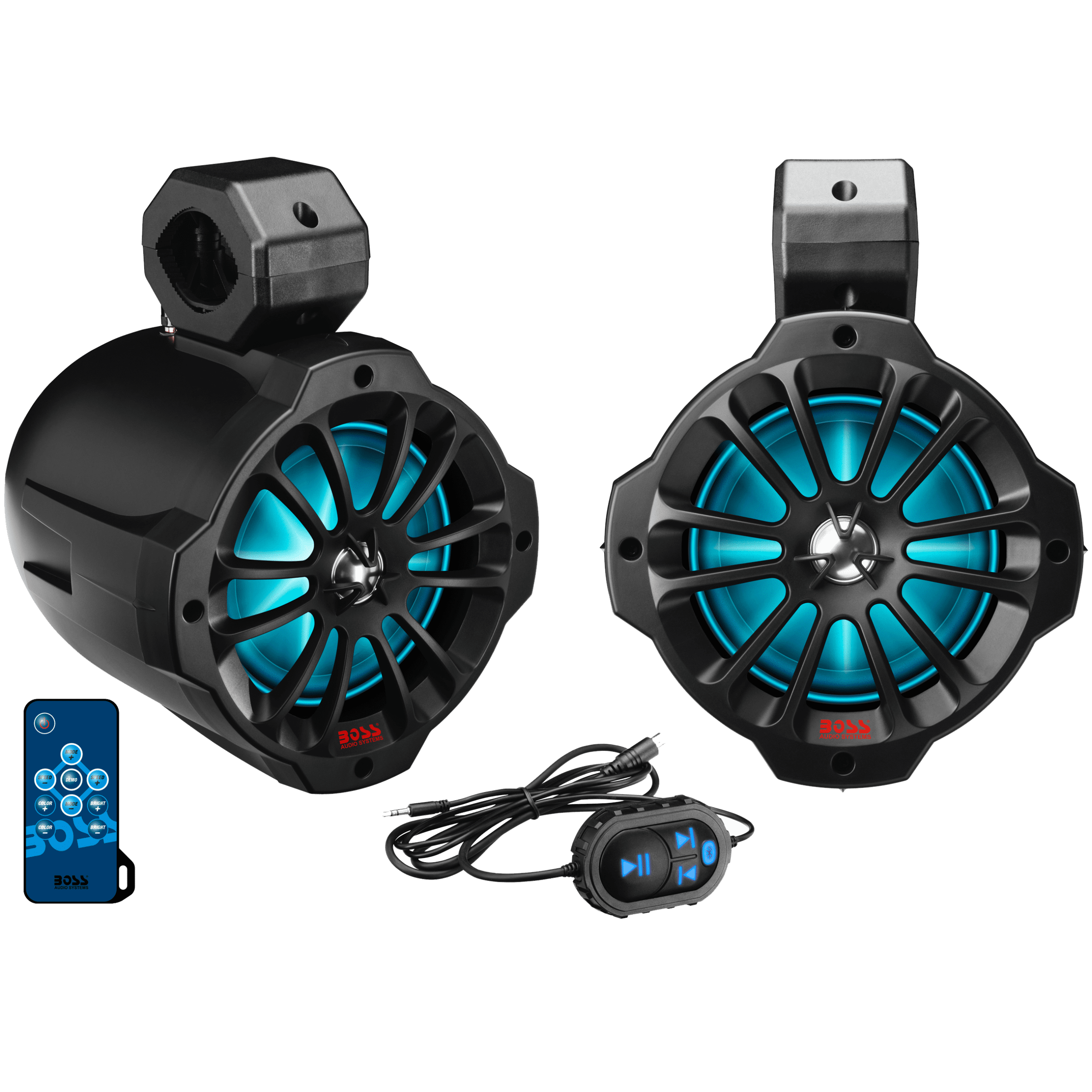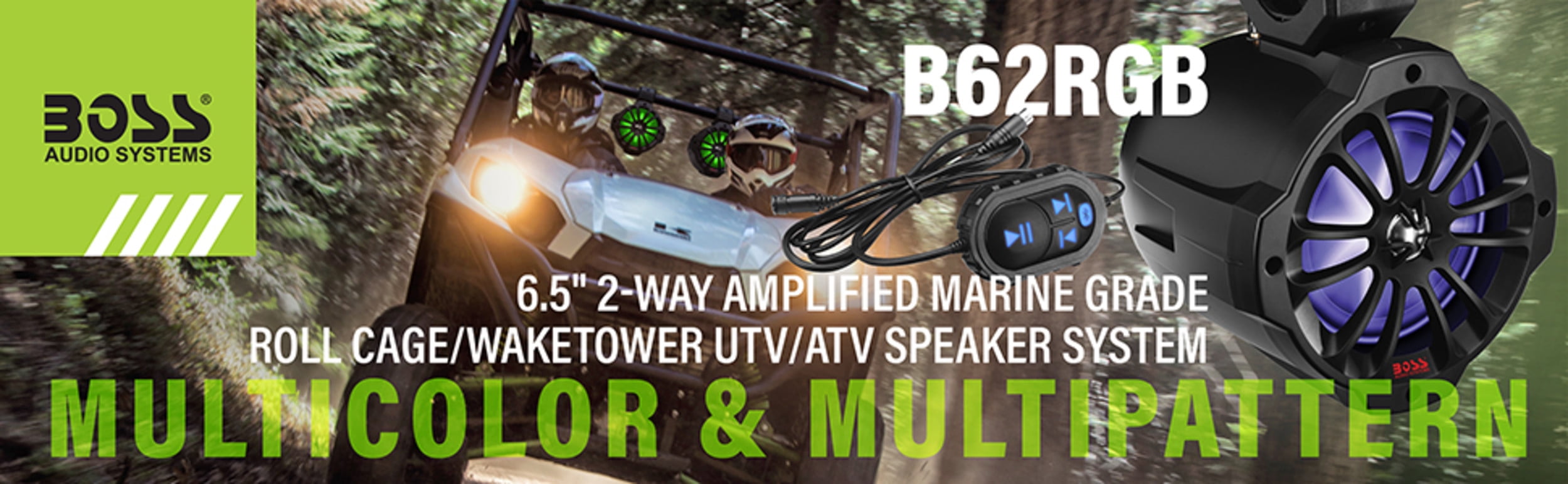 BOSS Audio Systems B62RGB ATV UTV Marine Boat Stereo 6.5 Inch Wake Tower Speakers – Full Range, 2 Way, IPX5 Weatherproof, Bluetooth, Built-in Amplifier, Golf Cart Compatible, Multi Color Illumination ATV UTV Marine Weatherproof Waketower Speaker System – Amplified, 6.5 Inch Speakers, Full Range, 2 Way, Bluetooth, RGB LED Illumination, IPX5 Rated, Sold In Pairs Trail-Mix Take to the trails and express your freedom with the BOSS Audio B62RGB Marine grade, weatherproof waketower speaker system. Easy to install, these 6.5-inch full range speakers with tweeters will keep you and your party jamming to the tunes with no neighbors to worry about. All of the major components have been specially coated and sealed exclusively for the protection against the environment Cone: Polypropylene Polypropylene is a resilient and durable manufactured material that can be used in thousands of applications across virtually all fields. In the specific case of our cones, this material allows for maximum give that produces great sounding speakers lasting you a long time. Surround: Rubber Impermeable to air, rubber has the ability to endure or resist exposure to the many types of weather fronts. Rubber has many different applications. We use it for the surrounds in a many of our speakers to connect the cone to the basket.