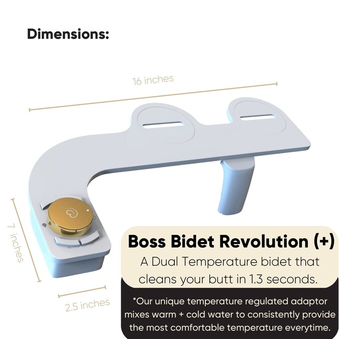 The Boss Bidet revolution + is a dual temperature toilet bidet attachment. It cleans your butt in 1.3 seconds, shuts off automatically, and self sanitizes the nozzle. The revolution+ includes our innovative thermostat adapter which mixes warm and cold water to spray the most optimal temperature.