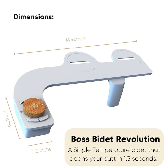 The Boss Bidet revolution is a single temperature toilet bidet attachment. It cleans your butt in 1.3 seconds, shuts off automatically, and self sanitizes the nozzle.