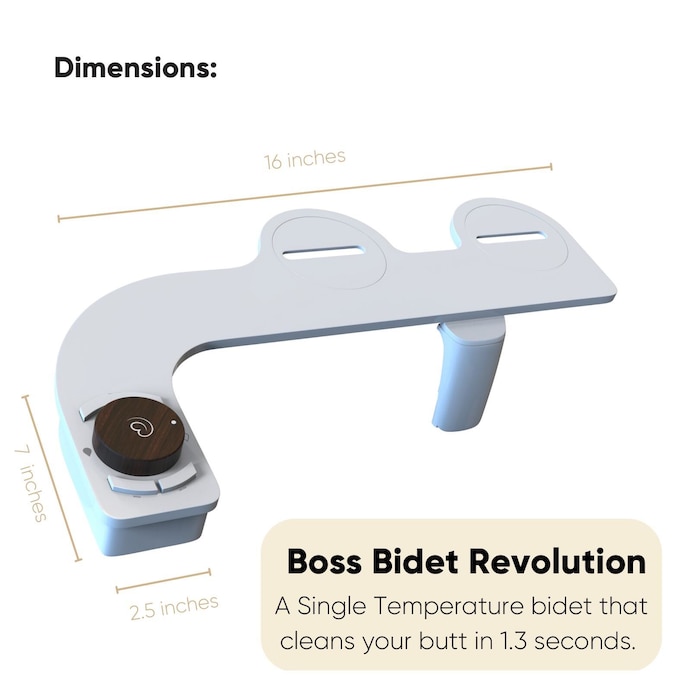 The Boss Bidet revolution is a single temperature toilet bidet attachment. It cleans your butt in 1.3 seconds, shuts off automatically, and self sanitizes the nozzle.
