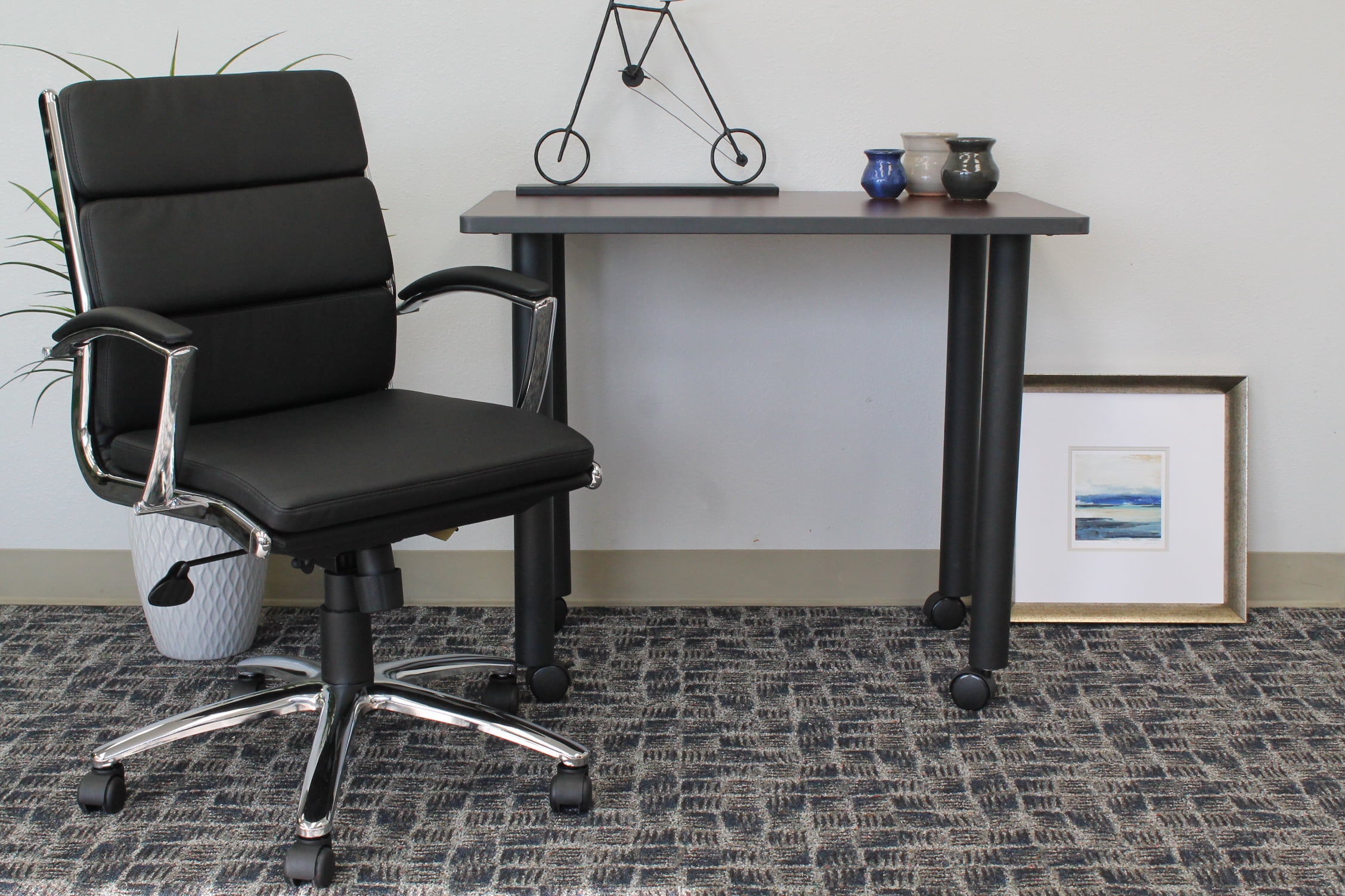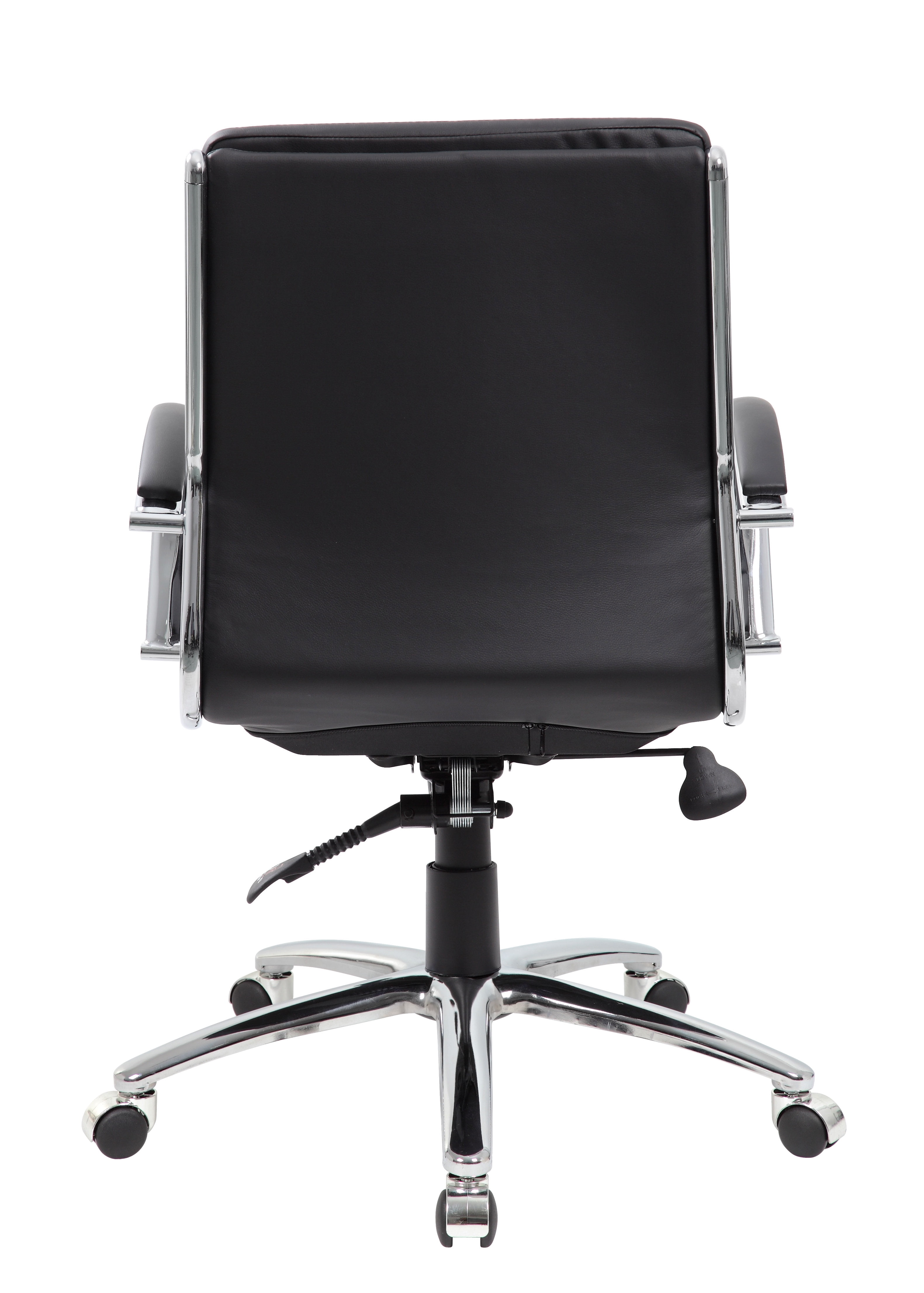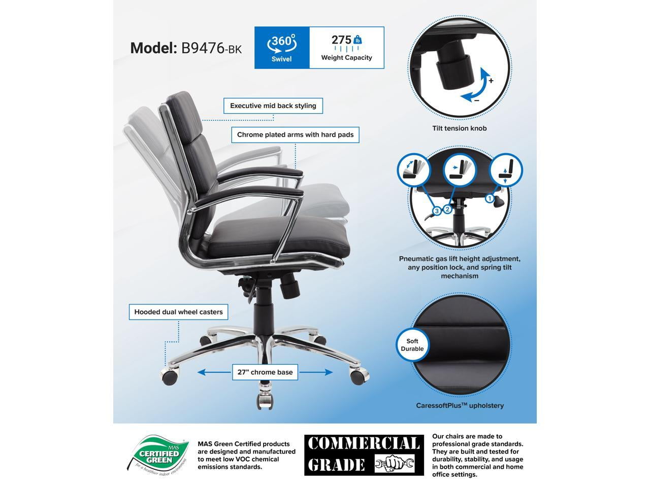 Upholstered with ultra-soft, durable and breathable Black CaressoftPlus™ upholstery. Mid-Back. Metal chrome plated arms topped with soft arm pads. Heavy duty 2 paddle spring tilt mechanism with infinite lock. Upright locking position. Pneumatic gas lift seat height adjustment. Adjustable tilt tension control. Large 27″ chrome base for greater stability. Hooded double wheel casters. Features: Finish: Black Seat Size 19″W x 20″D Material: Fabric Seat Height 20″ – 23″H Upholstered with ultra-soft, durable and breathable Black CaressoftPlus™ upholstery Mid-Back Metal chrome plated arms topped with soft arm pads Heavy duty 2 paddle spring tilt mechanism with infinite lock Upright locking position Pneumatic gas lift seat height adjustment Specifications: Product Dimensions: 37″H x 27″W x 27″D Product Weight: 39 lbs