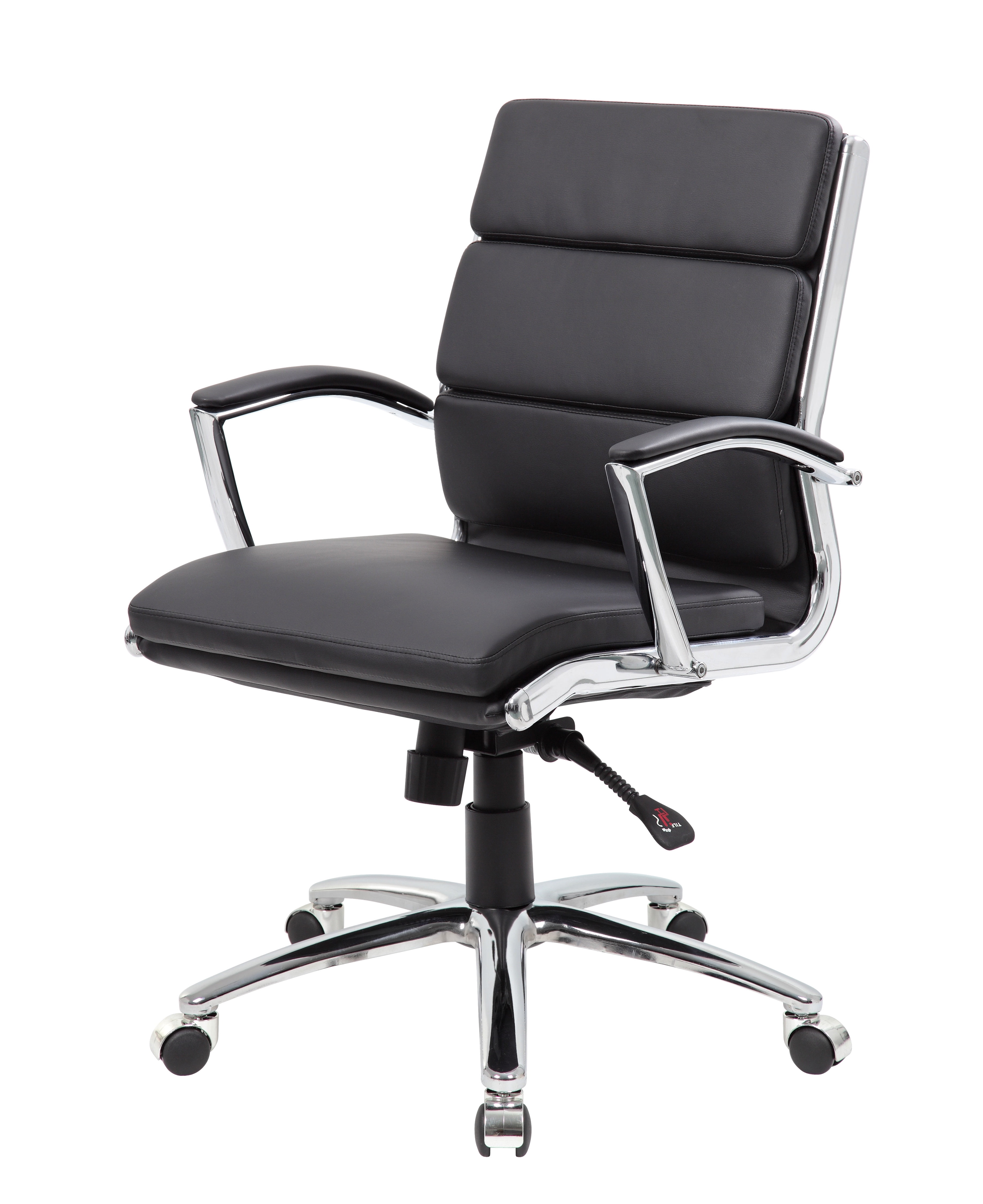 Finish: Black Seat Size 19″W x 20″D Material: Fabric Seat Height 20″ – 23″H Upholstered with ultra-soft, durable and breathable Black CaressoftPlus™ upholstery Mid-Back Metal chrome plated arms topped with soft arm pads Heavy duty 2 paddle spring tilt mechanism with infinite lock Upright locking position Pneumatic gas lift seat height adjustment