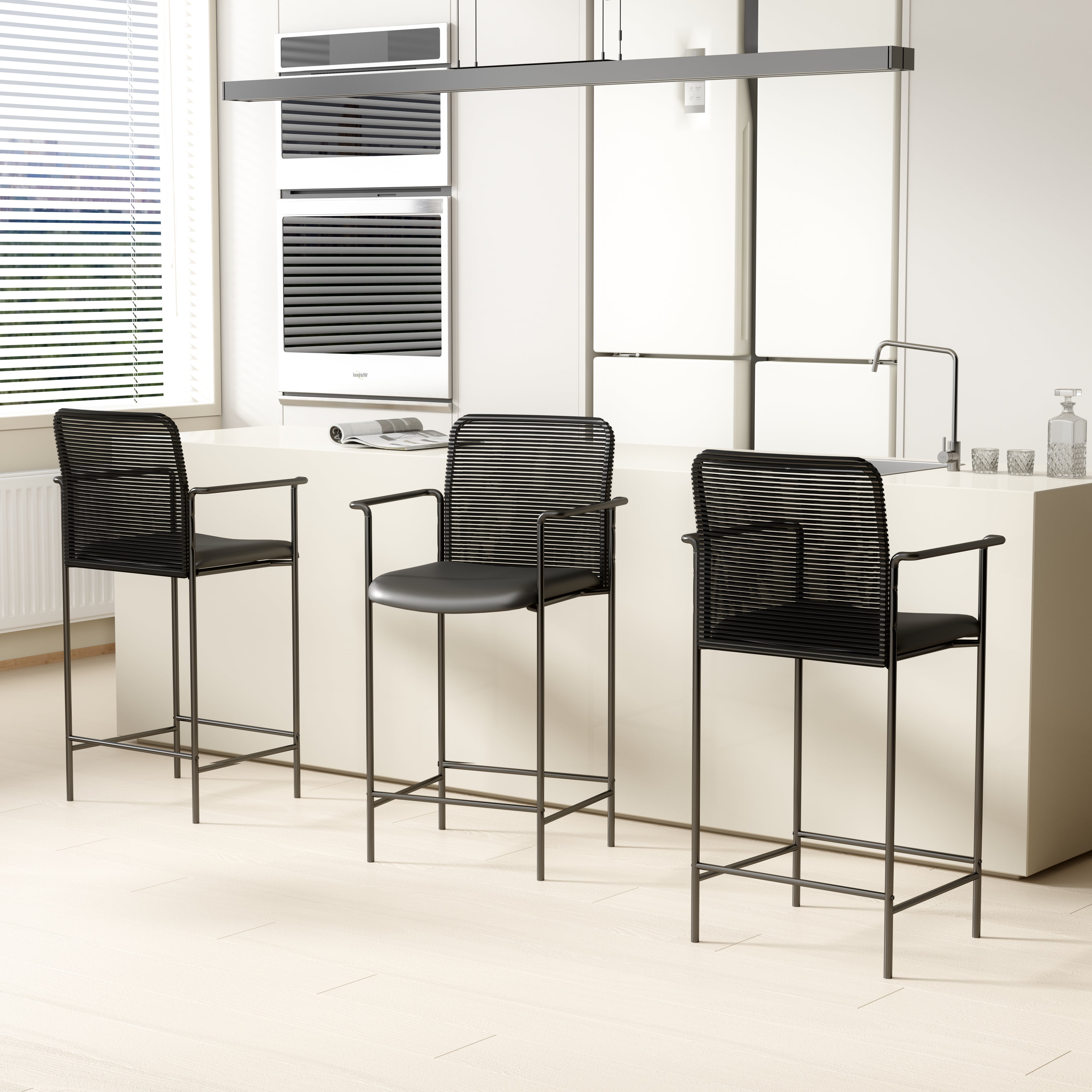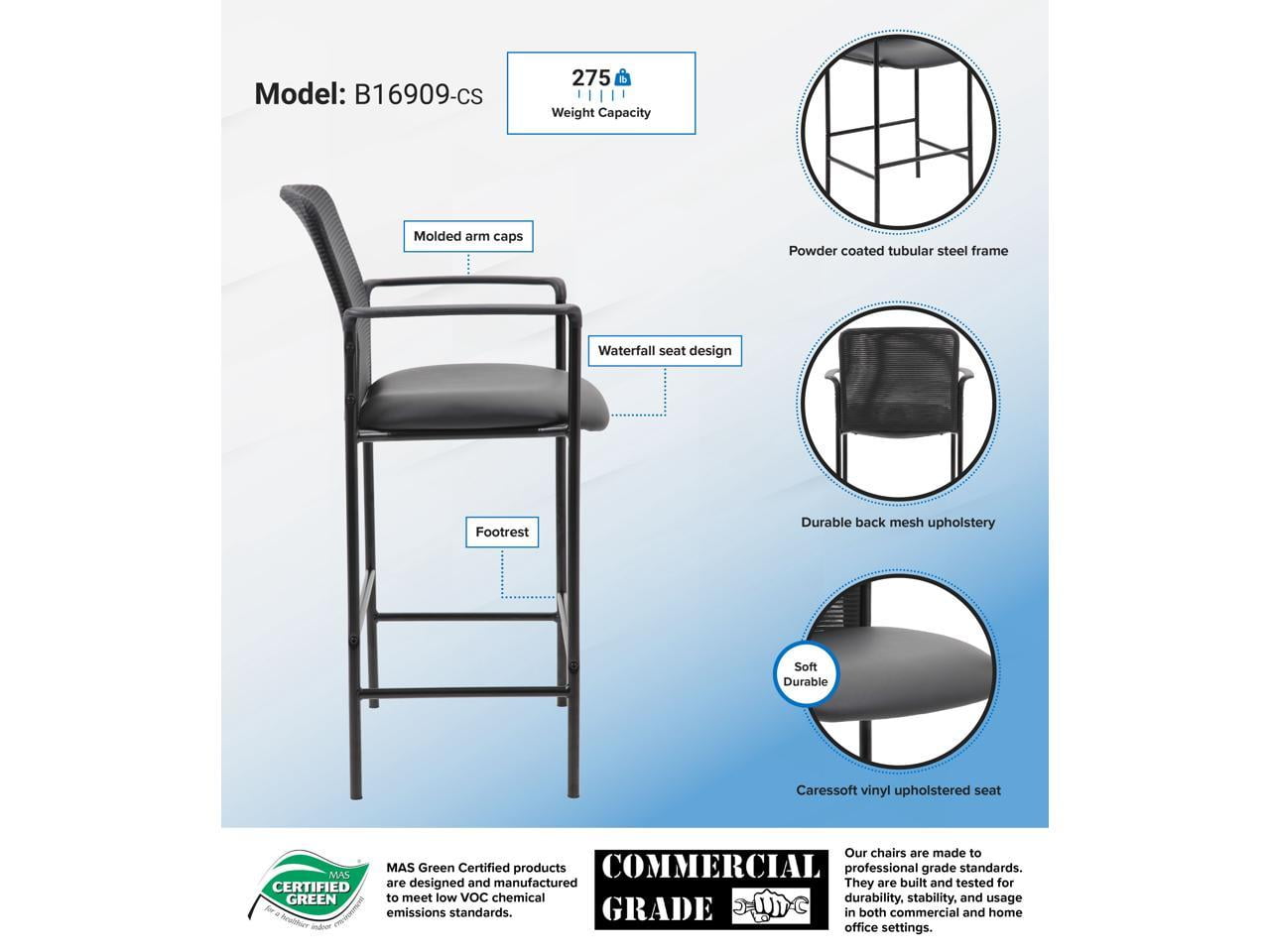 The slender and sleek Contemporary Mesh Back Stool in black is a versatile seat that can be utilized from a drafting stool to guest seating. It is made from sturdy mesh with a Caressoft material on the seat. Caressoft is an upholstery that looks & feels a lot like leather, but is far more durable and can be easily cleaned with a damp cloth. The stool has fixed arms and a 4 leg tubular base made from sturdy black steel which offers a 275 lbs. capacity. Features: Black powder coated tubular steel frames Molded arm caps Foot rest Designer tapered legs Waterfall seat to reduce stress on legs Seat upholstered with Caressoft vinyl Back upholstered in durable mesh Specifications: Weight Capacity: 275 Seat Dimensions: 18.5″ W x 18″ D Seat Height: 28.5″-35.5″h Product Dimensions: 24″W X 23.5″D X 42.5″H Product Weight: 17