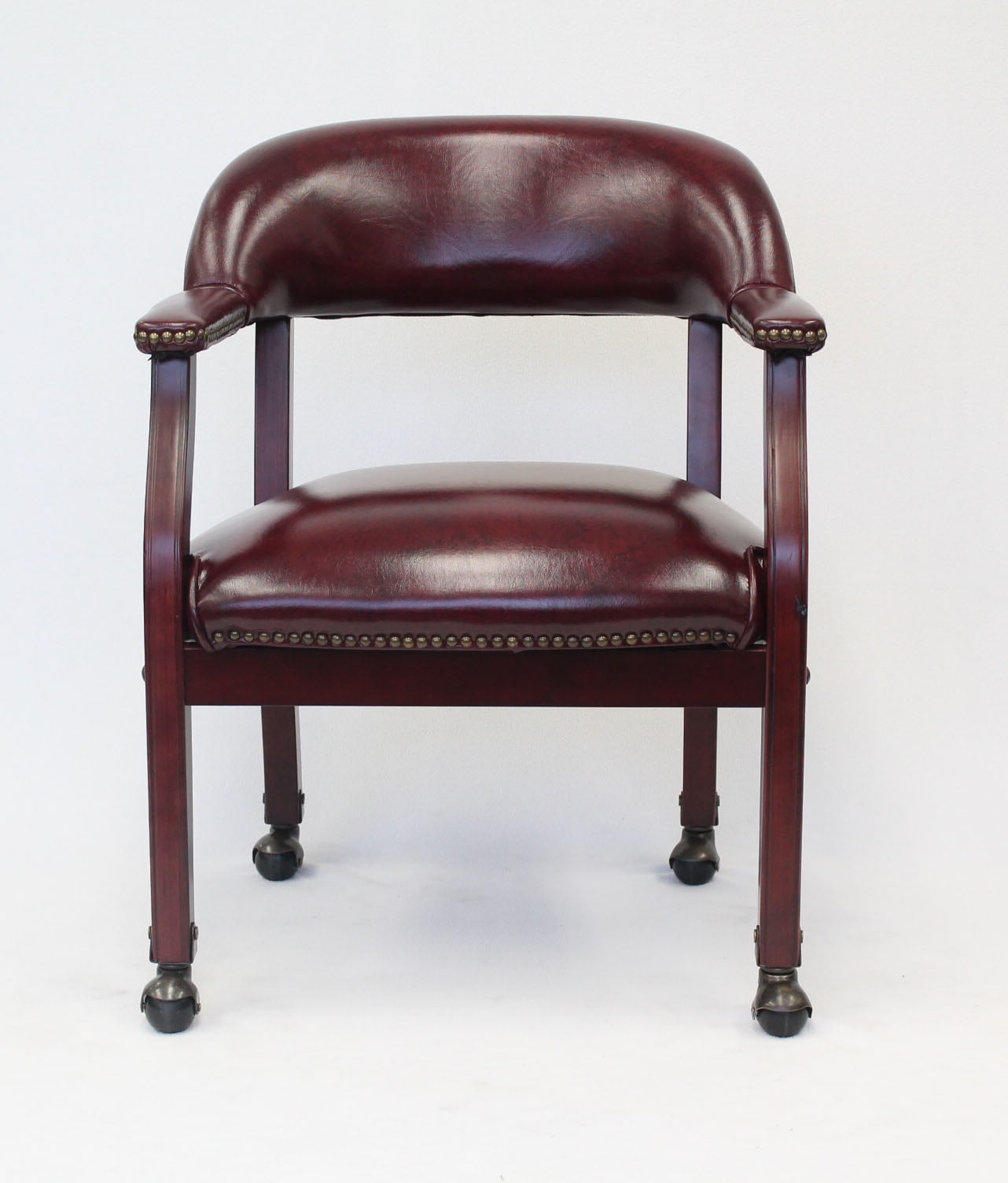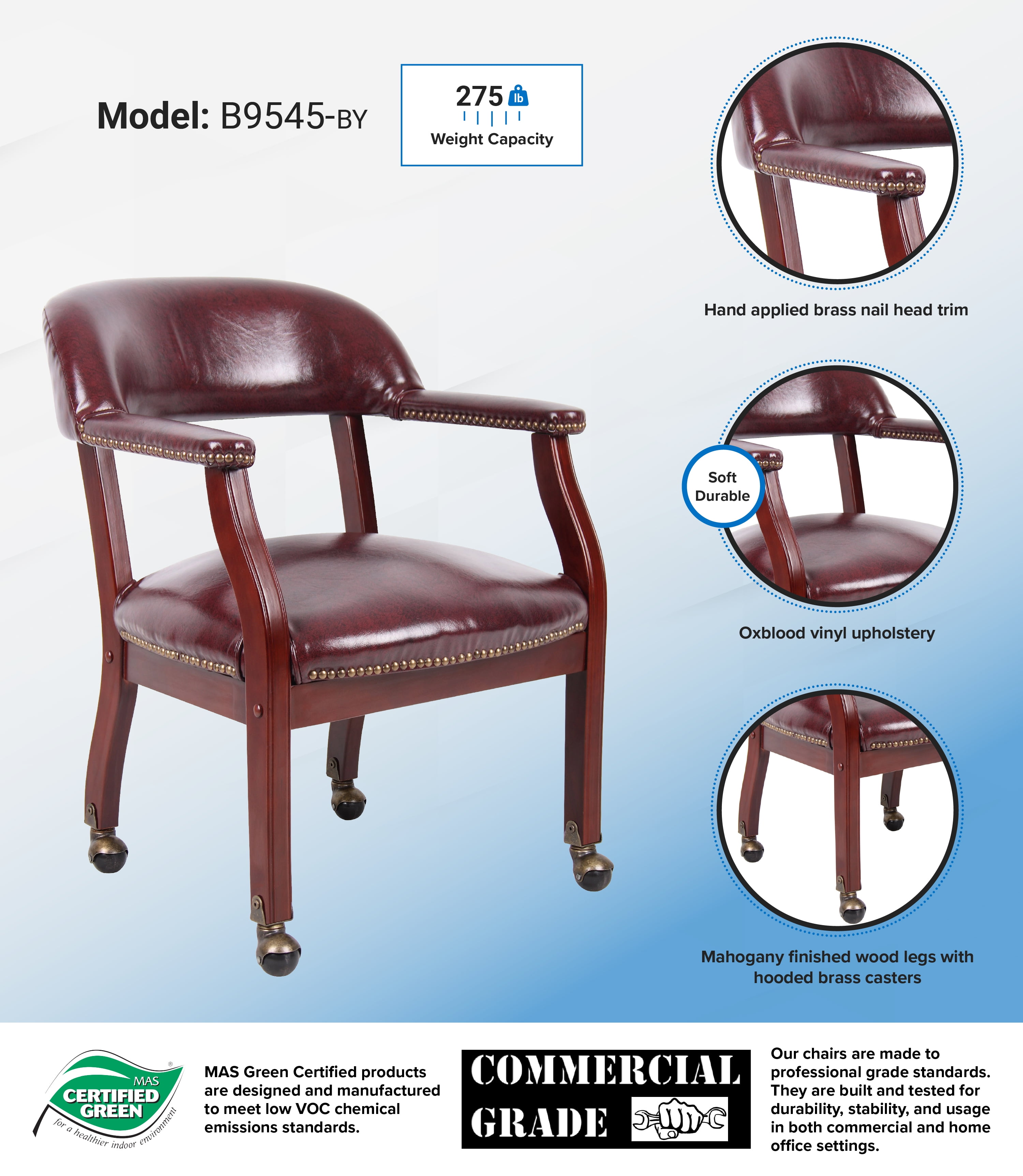 The Boss Captain’s Chair In Burgundy Vinyl W/ Casters features a rich mahogany frame color with an easy to clean black vinyl upholstery. The 24″ W x 26″ D x 31″ H chair is made using a sturdy frame and manufactured by Boss Office Products. Weighing just 31 pounds, the lightweight seat accommodates as much weight at 250 pounds. The spring seat keeps the chair from sagging when sat in and the hand applied individual brass nail head trim adds a decorative touch. This seat is sold with casters; however, users are welcome to get model B9540, which does not have casters. Features: Finish: Red Chair has hand applied individual brass nail head trim Chair has rich mahogany finish Sturdy hardwood frame No-sag spring seat Casters Ships ready to assemble Specifications: Product Dimensions: 31″ H x 24″ W x 26″ D Product Weight: 31 lbs Seat Dimensions: 18.5″ H x 22″ W x 21″ D Arm Height: 25″ Weight Capacity: 250 lbs