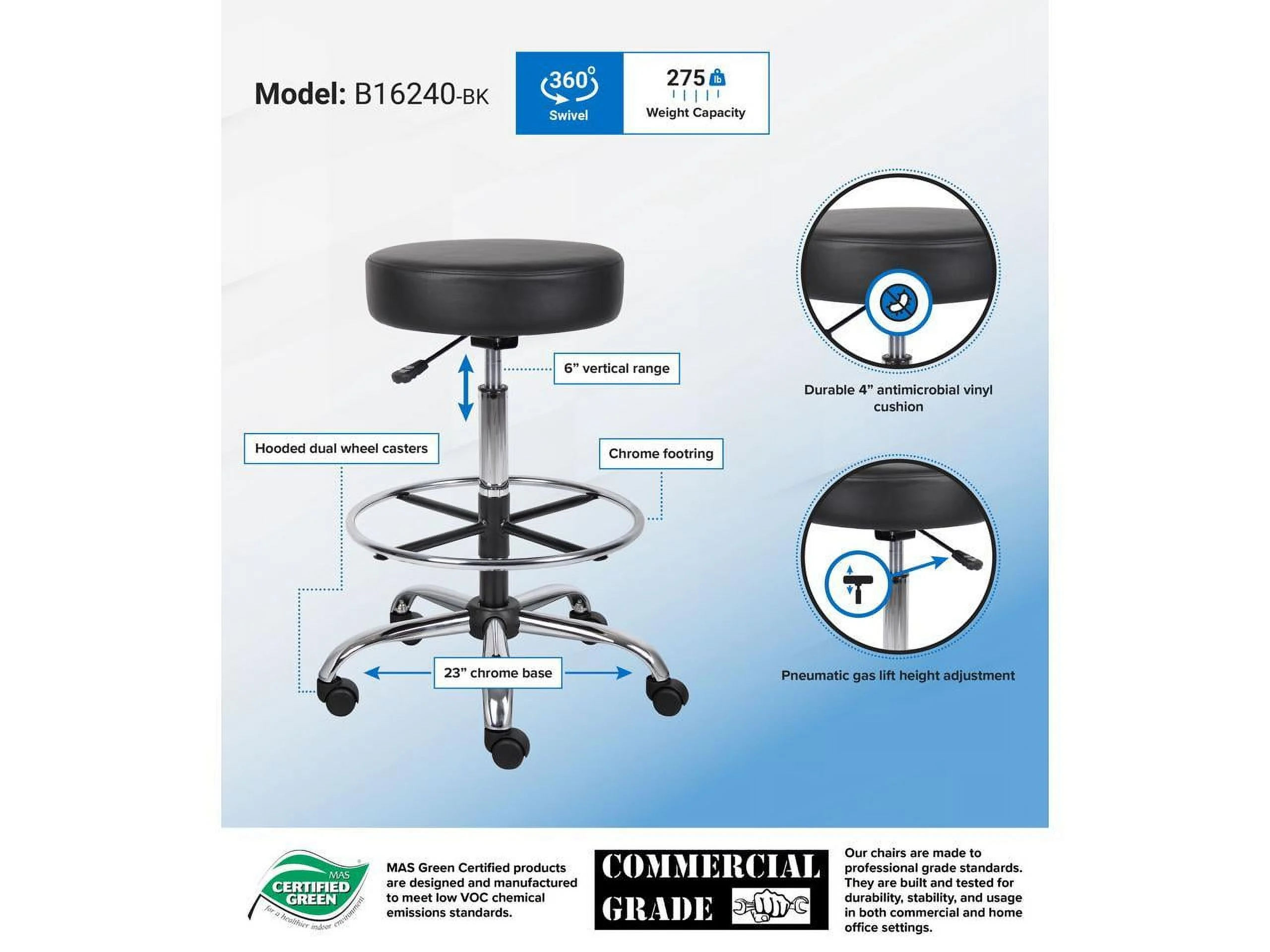 Ergonomic design Upholstered in durable antimicrobial vinyl for easy maintenance and cleaning Adjustable seat height with a 6″ vertical height range Attractive chrome finish on the base, foot ring and gas lift