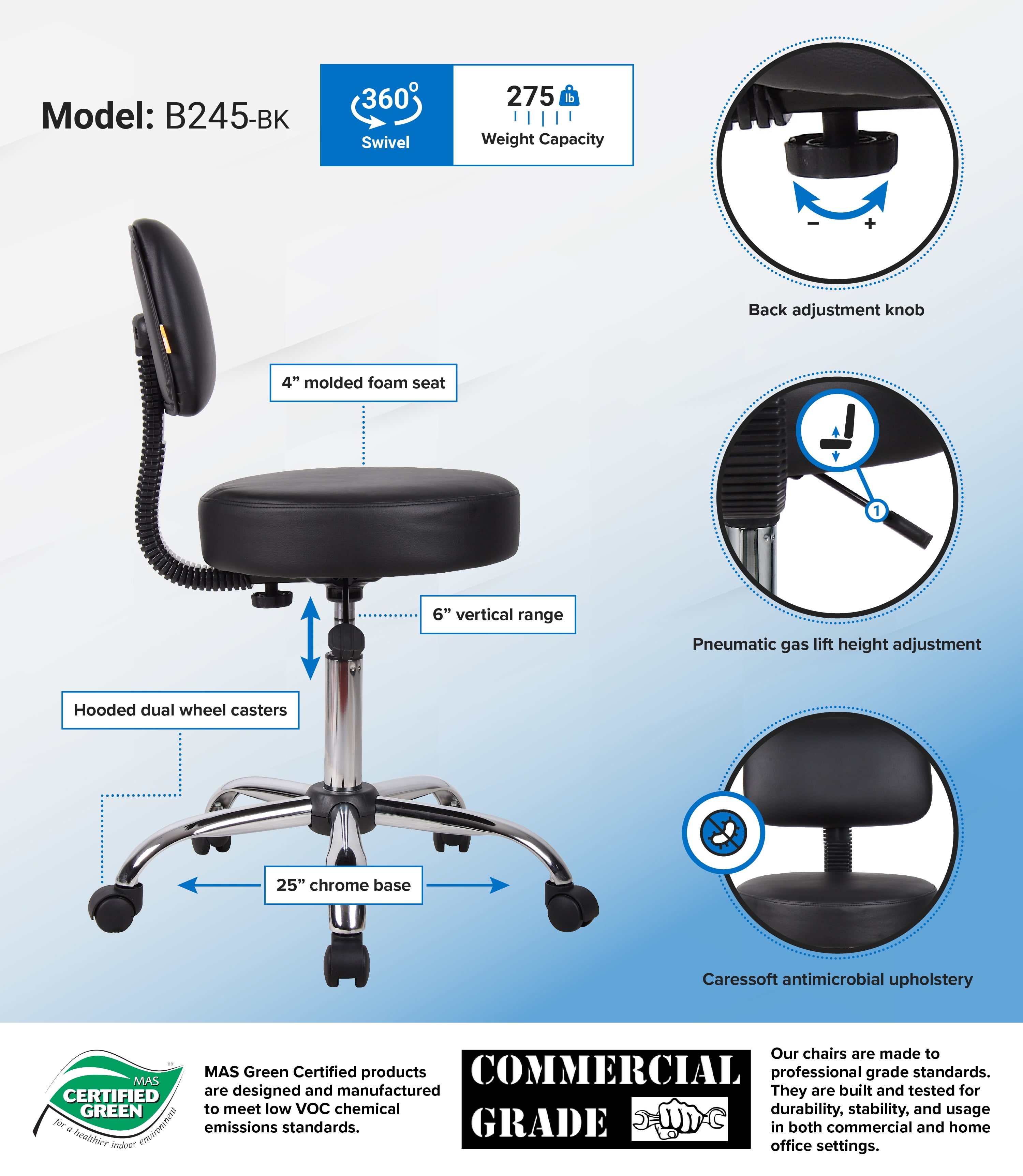 Ergonomic design emulates the natural shape of the spine to increase comfort and productivity Upholstered in durable antimicrobial vinyl for easy maintenance and cleaning Adjustable seat height with a 6″ vertical height range Attractive chrome finish on the base and gas lift Dual wheel casters allow for easy movement Assembly required MAS Certified Green Overall dimensions: 24″ W x 24″ D x 33.5-39.5″ H Seat height: 20.5″-26.5″ H