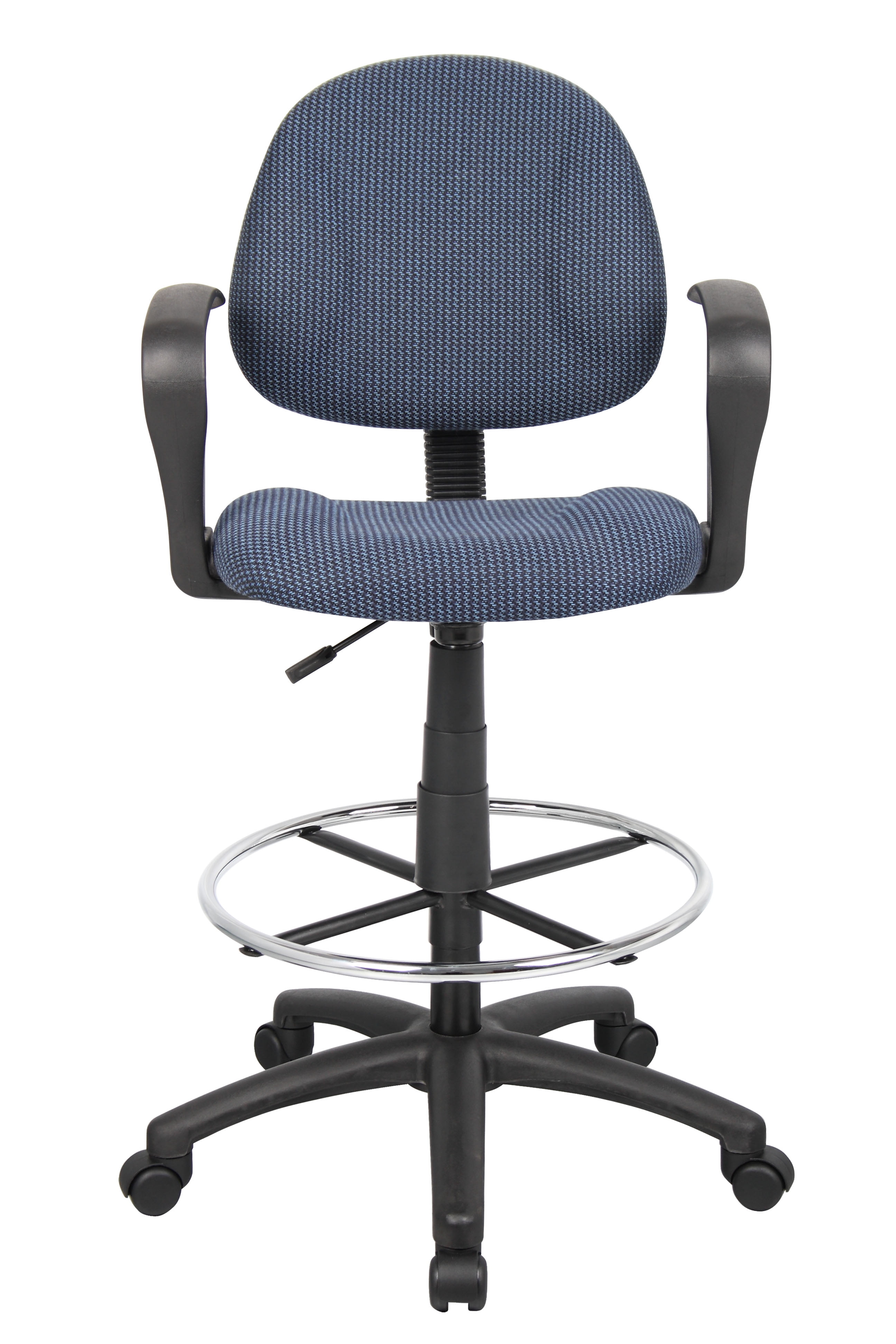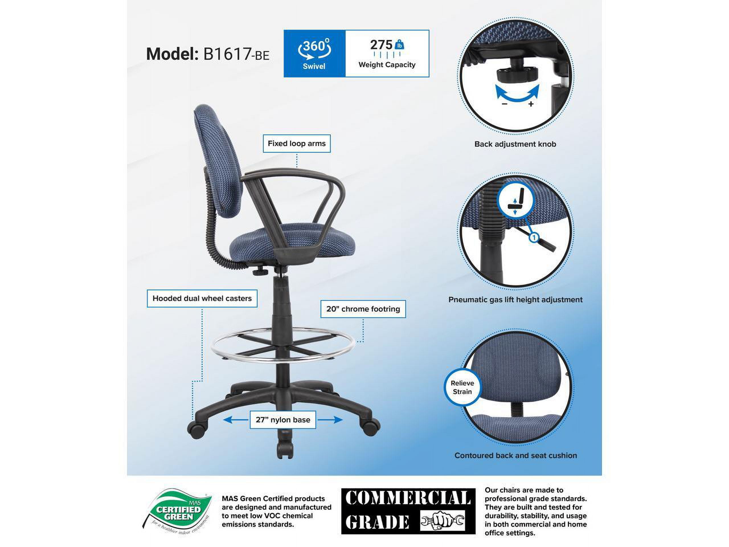 The Boss Drafting Stool (B315-BE) with footring and loop arms is an ergonomic office chair with a seat size of 17.5” W by 16.5” D and 26.5” to 31.5” H. Features of the chair include a weight capacity of 250 pounds and easy and smooth height adjustment with its pneumatic gas lift handle. The large 27” nylon base offers increased stability and the hooded double wheel casters makes moving from one part of your office to another easy. The seat is upholstered blue tweed, making the chair both functional and aesthetically appealing. Adjustable arms and a removable footrest make this chair comfortable for long periods of work. Features: Finish: Blue Chair has contoured back and seat help to relieve back-strain Chair has pneumatic gas lift seat height adjustment Loop arms Euro-style nylon base with heavy duty dual wheel casters Strong 20″ diameter chrome foot Assembly required Specifications: Product Dimensions: 44.5″ -49″ H x 25″ W x 25″ D Product Weight: 36 lbs Seat Dimensions: 26.5″ – 31.5″ x 17.5″ W x 16.5″ D Weight Capacity: 250 lbs