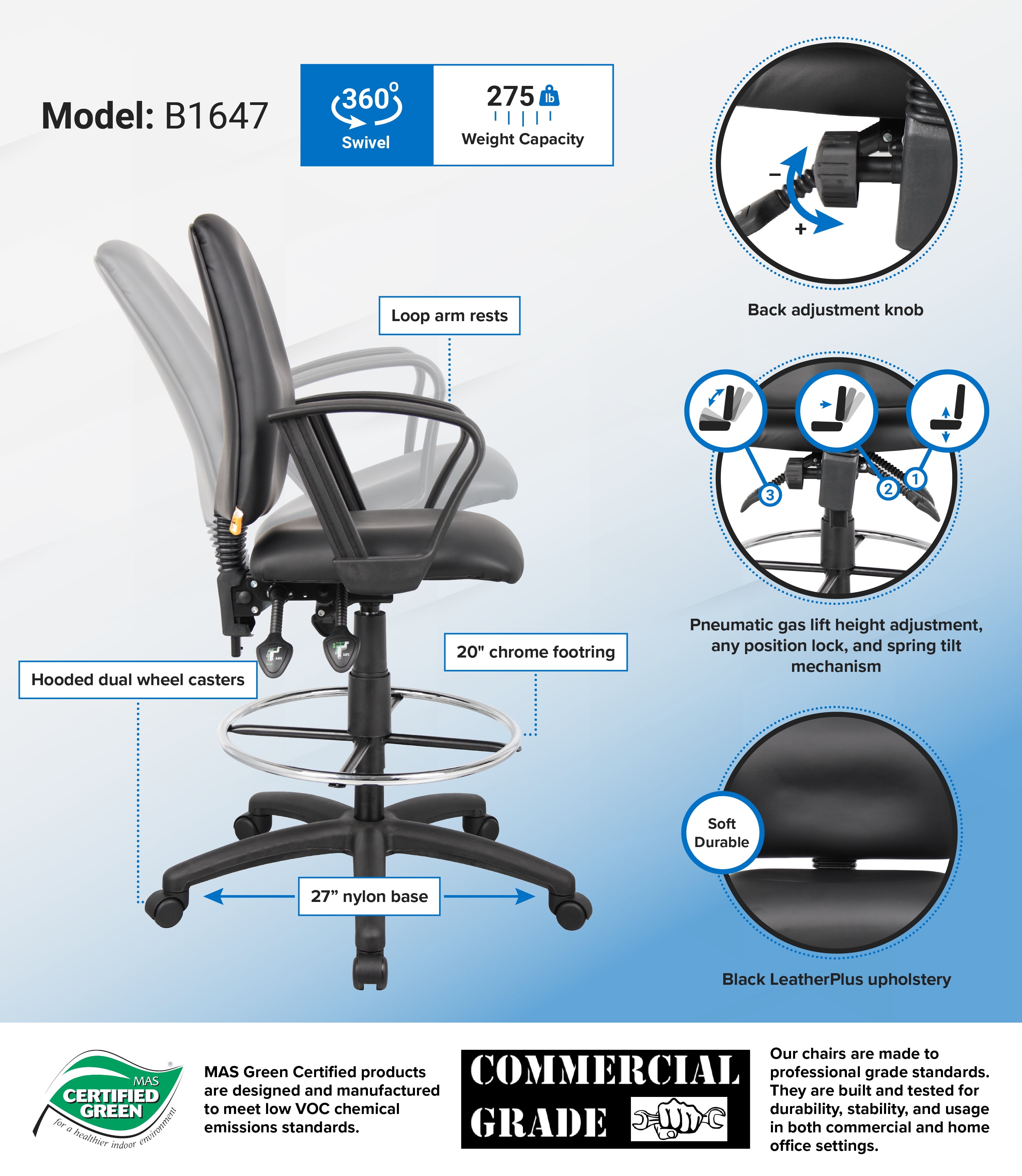 Durable LeatherPlus Upholstery – Combines leather and polyurethane for a soft, long-lasting finish. Pneumatic Gas Lift – Easily adjust seat height to match your workspace. 20-Inch Chrome Footring – Provides leg and foot support for added comfort. 27-Inch Black Nylon Base – Ensures stability and balance while you work. Hooded Double Wheel Casters – Allow smooth movement across most floor types. Loop Arms – Offer comfortable, natural support for your arms. MAS Certified Green for low VOC emissions Assembly required Overall dimensions: 27″W x 35.5″D x 43.5 – 48″H Seat height: 26″ – 29.5″ Seat size: 19.5″W x 17.5″D Back size: 17.5″W X 18.5″H Arm height: 33.5-37″ H Weight capacity: 275 lbs.