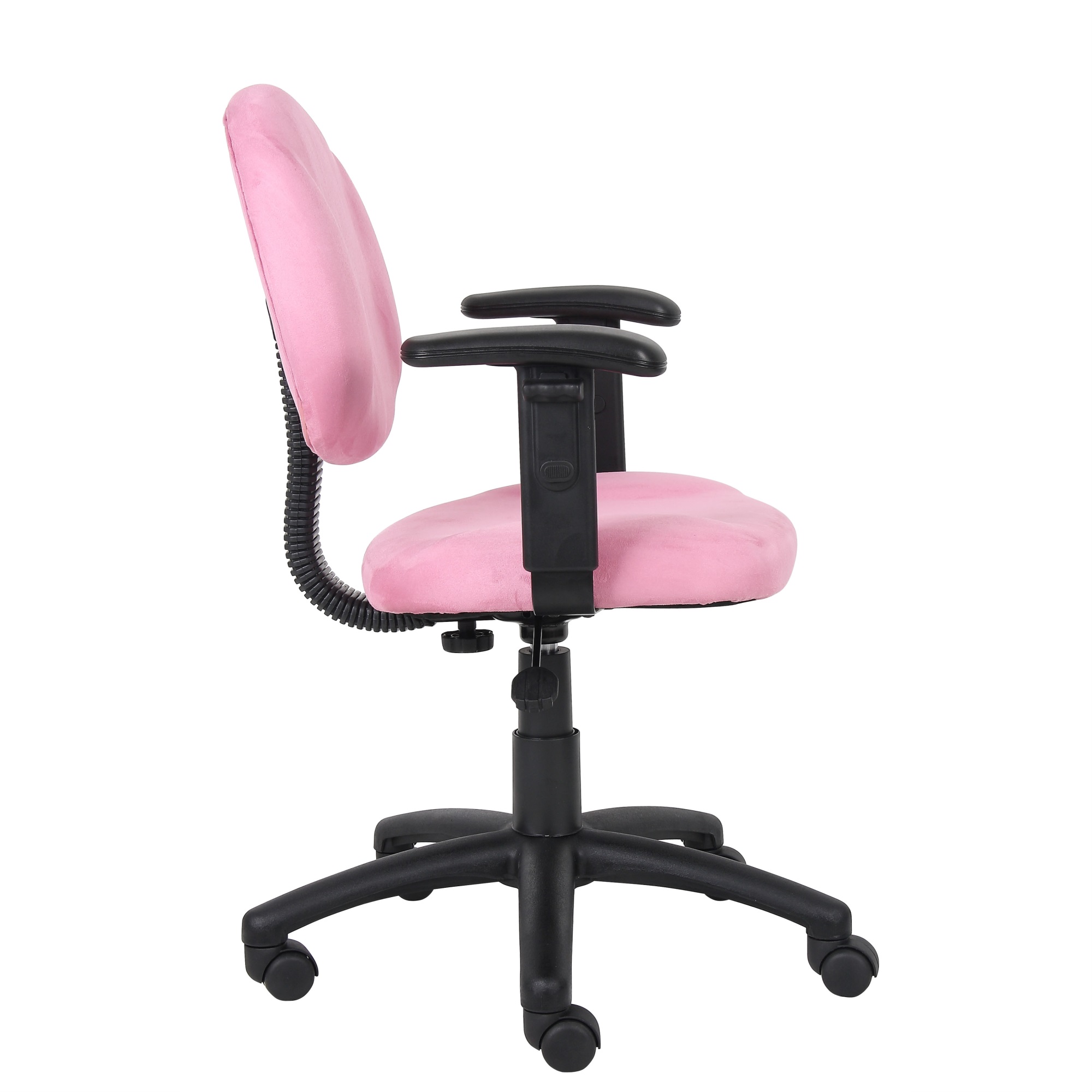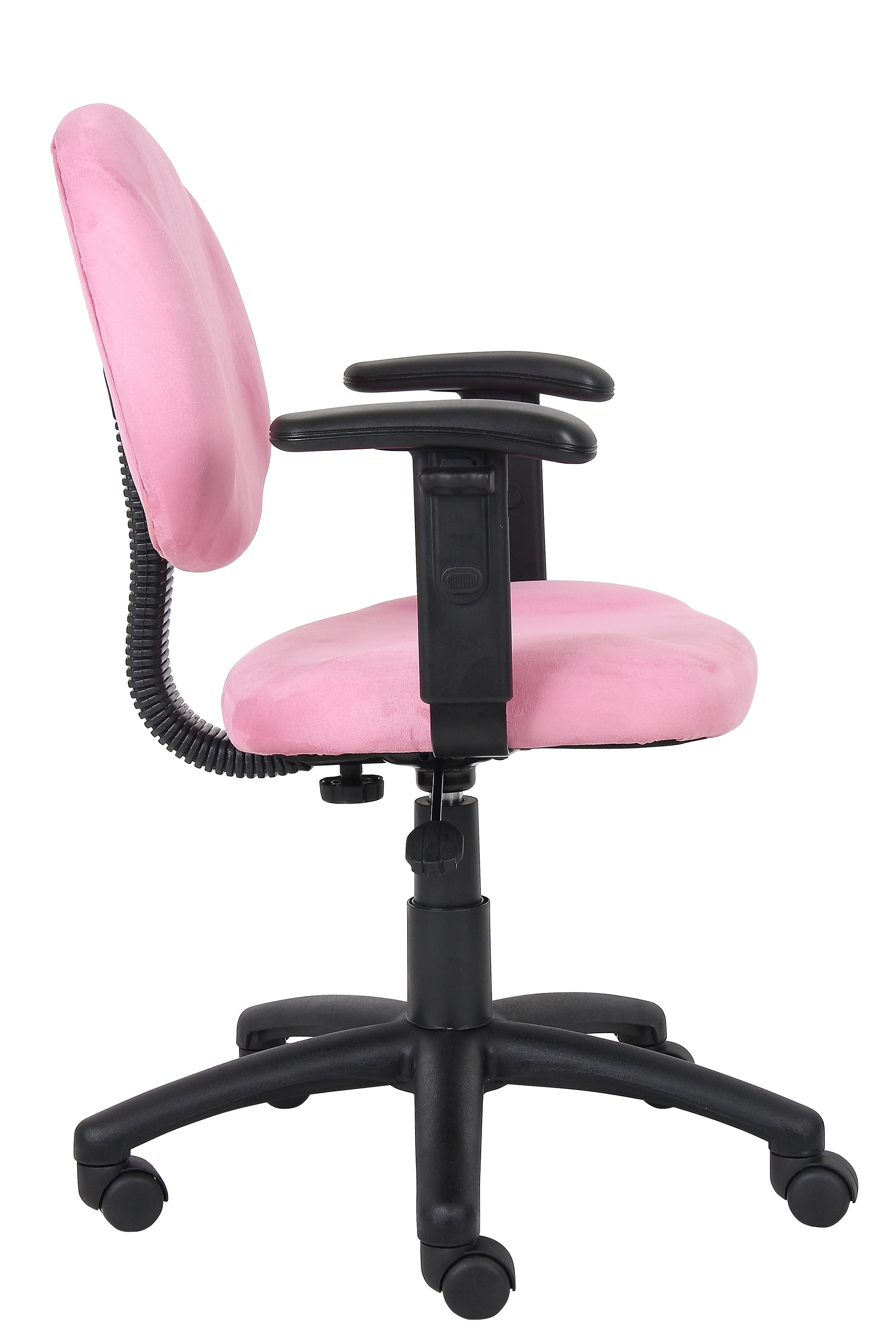 Upholstered in Pink Microfiber Waterfall seat reduces stress to legs Adjustable back depth; With adjustable arms Pneumatic seat height adjustment Comes in durable easy to clean microfiber Hooded double wheel casters 5 star nylon base allows smooth movement and stability Adjustable arms Assembly required MAS Certified Green Overall dimensions: 25″W X 25″D X 35″-40″H; Seat height: 18.5″-23.5″ H