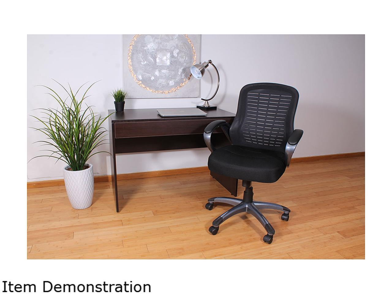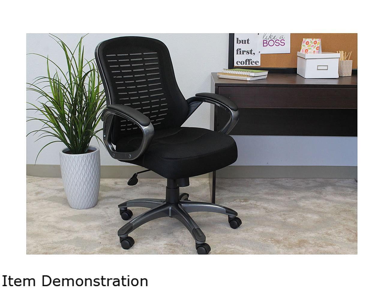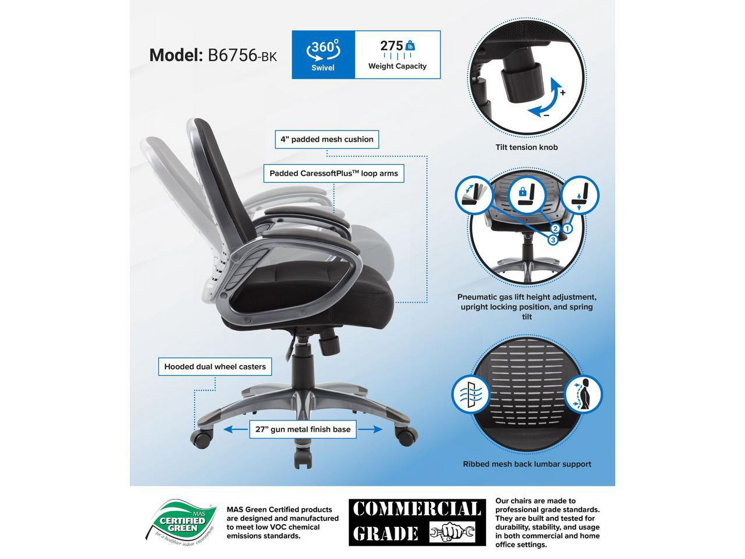 Breathable Ribbed Mesh Back – Supports airflow and is ergonomically curved for lumbar support. 4-Inch Padded Mesh Seat – Delivers cushioned comfort for long hours of sitting. Upright Locking Position – Locks securely for proper posture and back support. Adjustable Tilt Tension Control – Personalizes recline resistance for a tailored sitting experience. Pneumatic Gas Lift – Allows easy seat height adjustment to suit your workstation. Padded Loop Arms – Covered in durable Black Caressoftplus Vinyl for added comfort and style. 27-Inch Gun Metal Base – With black caps and hooded double wheel casters for stability and smooth movement. MAS Certified Green for low VOC emissions Assembly required Overall dimensions: 25″W x 29″D x 39.5 – 41″H Seat height: 19″ – 22″