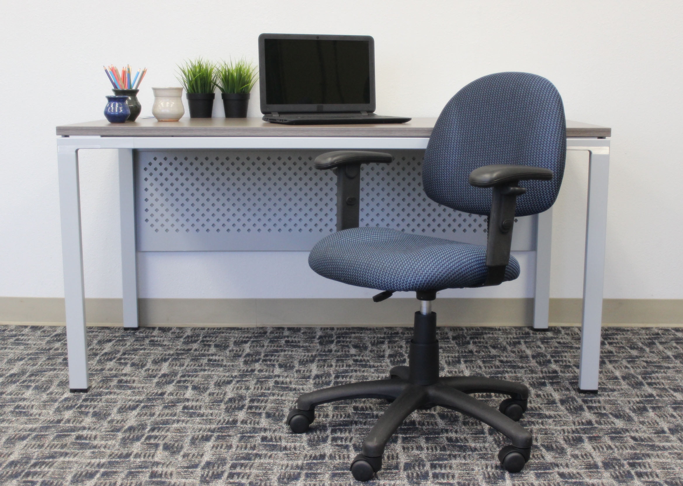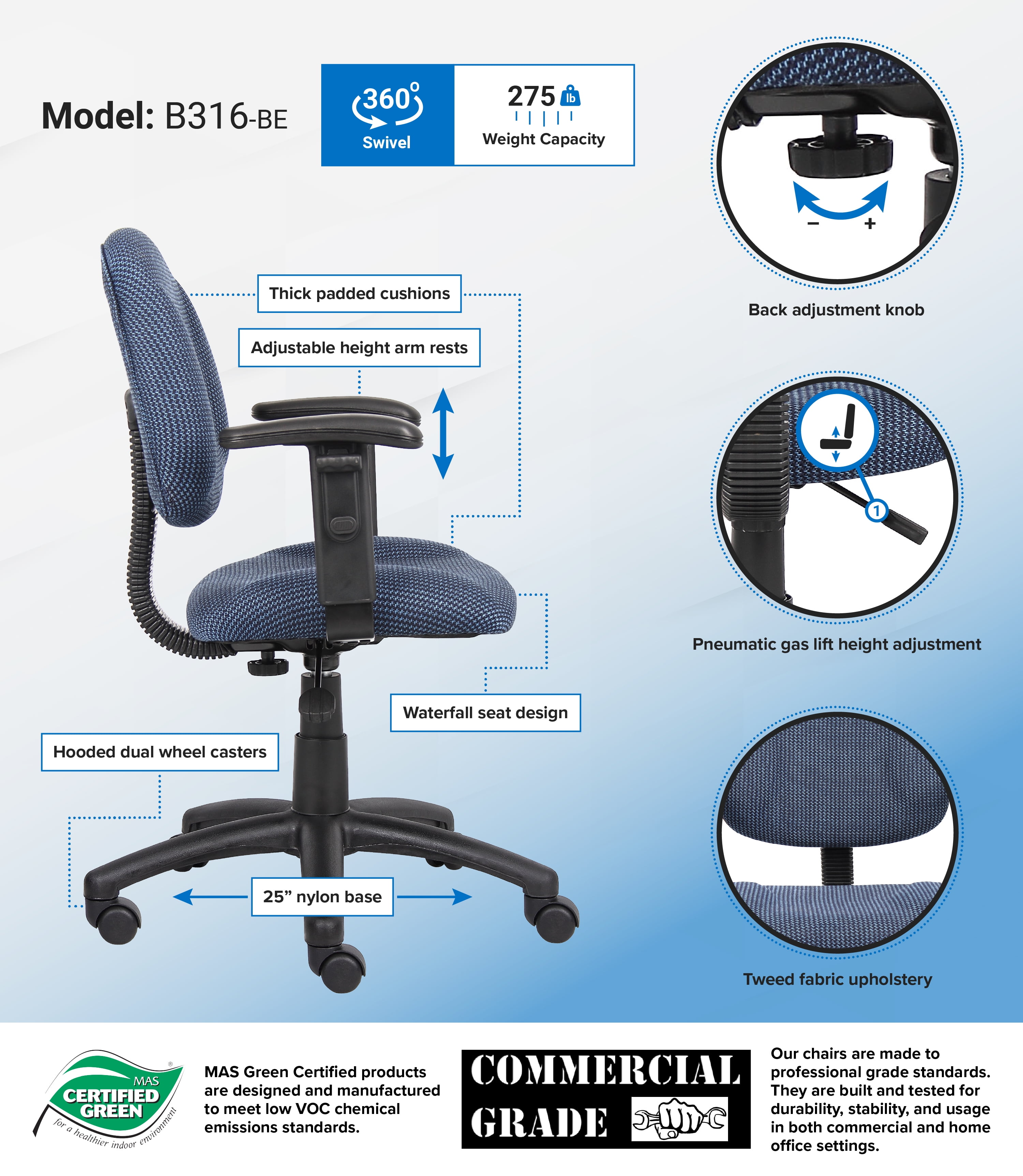 Thick Padded Seat and Back – Provides cushioned support for lasting comfort throughout the day. Built-In Lumbar Support – Encourages proper posture and reduces strain on the lower back. Adjustable Back Depth – Easily adapts to your body for a more personalized fit and improved support. Pneumatic Gas Lift Seat Height Adjustment – Enables quick and smooth seat height changes to match your workspace. Height Adjustable Arms – Offers ergonomic arm positioning for added comfort and flexibility. Five-Star Nylon Base – Ensures stability and durability with smooth movement. Hooded Double Wheel Casters – Glide easily across most surfaces while protecting flooring. MAS Certified Green for low VOC emissions Assembly required Overall dimensions: 25.5″W x 25″D x 34.5 – 40″H Seat height: 18″ – 23.5″ Seat size: 18.5″W x 17″D Back size: 17.5″W X 14.5″H Arm height: 26-34.5″ H