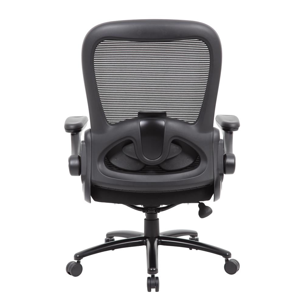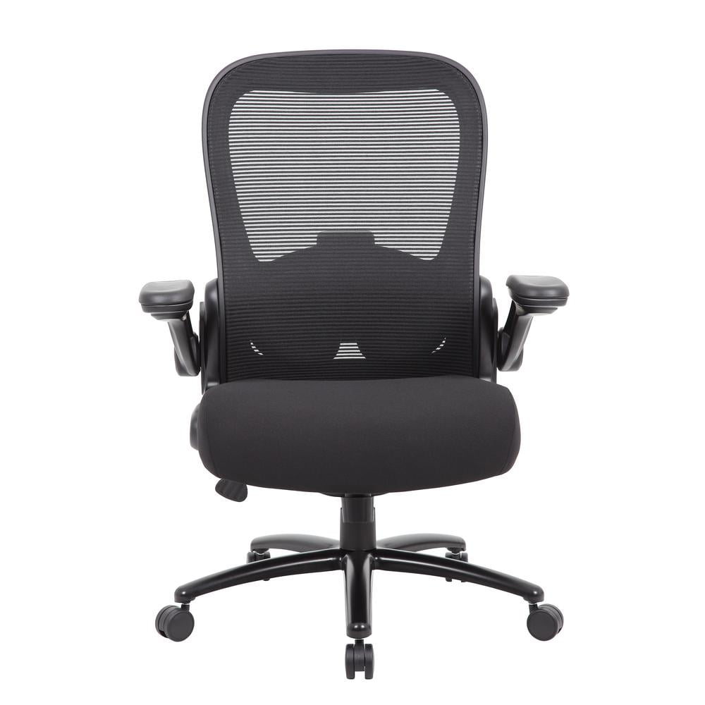 Boss Office Products Big and Tall Mesh Heavy Duty Chair, 400 lb weight capacity Our heavy duty flip arm mesh chair makes the perfect companion to any office, board room, or study. Its 400 pound weight capacity ensures a comfortable sitting experience with a broad range of body types. It’s seat is elegantly upholstered in black fabric and features high density foam and springpack construction for added comfort. The mesh back features adjustable lumbar and allows the cushion to breath with no moisture build up. It has height adjustable flip up arms. The chair features a pneumatic gas lift seat height adjustment, a heavy duty spring tilt mechanism, and tilt tension control. All of this sits atop a large 27” steel base with five large heavy duty casters. Black breathable mesh back cushion. Black upholstered seat cushion. Heavy duty spring tilt mechanism. Adjustable tilt tenson control. Flip up arms. Black steel base. Hooded double wheel casters.