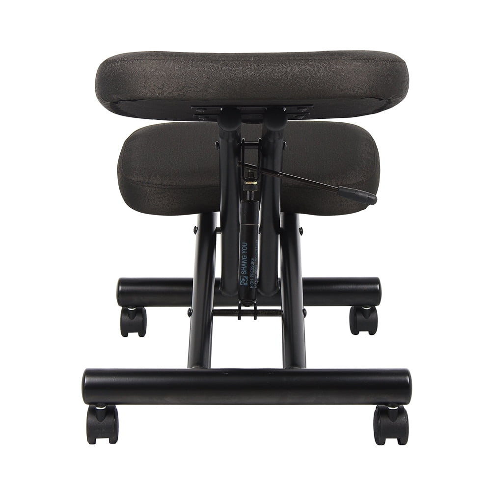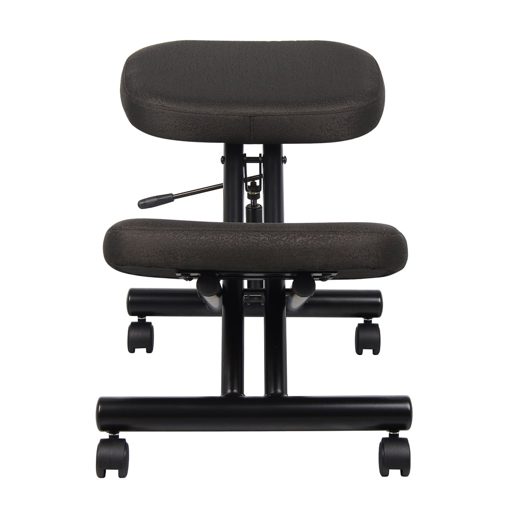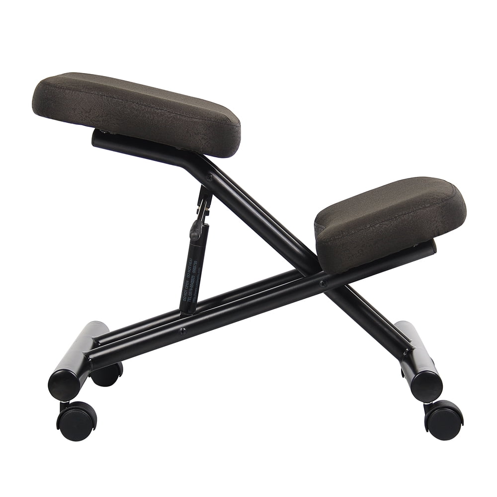 Stool has black stained metal frame and black fabric Seat size: 16.5″ W x 13″ D Stool has kneeling stool offers excellent ergonomic support and ease of use Stool has adjustable knee height allows for multiple users Our design eases the hips forward and encourages an upright posture by aligning the back, shoulders and neck to relieve strain on lumbar muscles Black fabric seat and knee platform provides comfort for long periods of time Large 27″ nylon base for greater stability Hooded double wheel casters Assembly required
