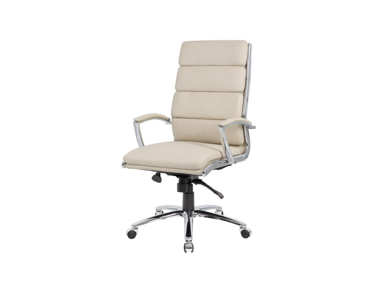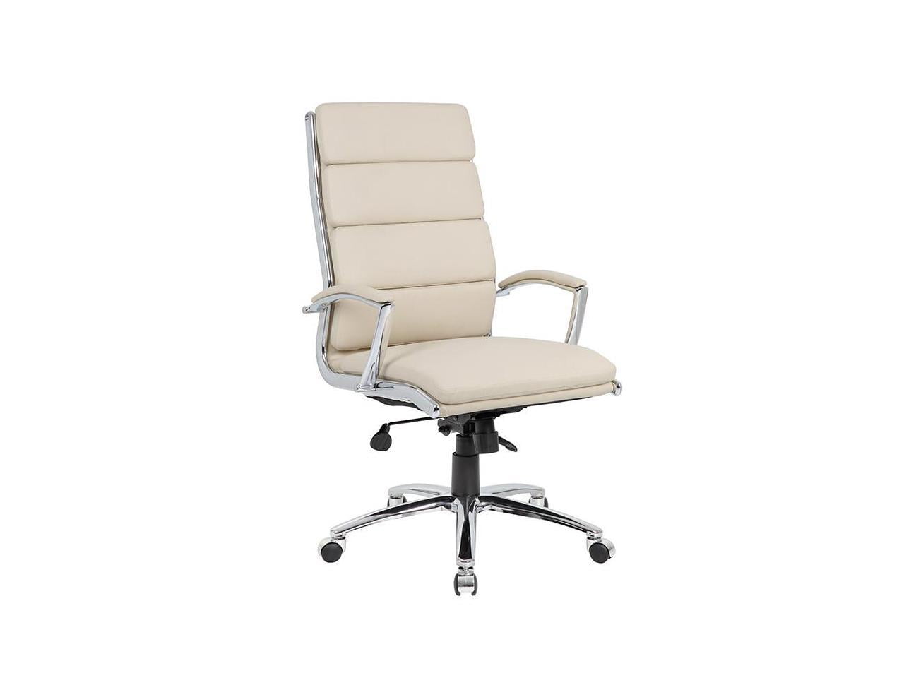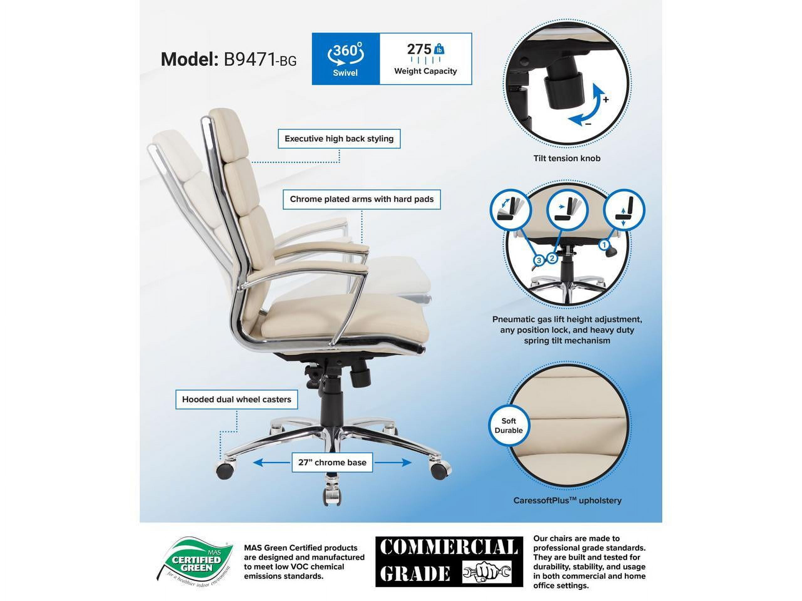 The executive CaressoftPlus chair in beige with the metal chrome finish is as comfortable as it is handsome. The chair utilizes a two paddle mechanism which designates one paddle for lift and one paddle to release spring tilt or lock; it is very heavy duty. The chair is made with a material called CaressoftPlus which is a trademarked vinyl that is an ultra-soft upholstery that looks & feels like leather, but more durable & easy to clean. The chair also offers tilt tension, a pneumatic gas lift and an upright lock. It has been designed with a sturdy 27 inch chrome base with 2 inch nylon dual castor wheels. Features: Material: Vinyl, metal Finish: Beige, chrome Upholstered with ultra soft, durable Beige CaressoftPlus upholstery Executive high back styling Metal chrome plated arms topped with hard arm pads Heavy duty 2 paddle spring tilt mechanism with infinite lock Pneumatic gas lift seat height adjustment Large chrome base for greater stability Upright locking position Specifications: Product Dimensions: 43.5″-47″H x 27″W x 28″D Product Weight: 42 lbs Seat Dimensions: 20″W x 21.5″D Seat Height: 20″-23″H Arm Height: 27″-30.5″H Weight Capacity: 275 lbs Product Dimensions: (Chrome base) 27″