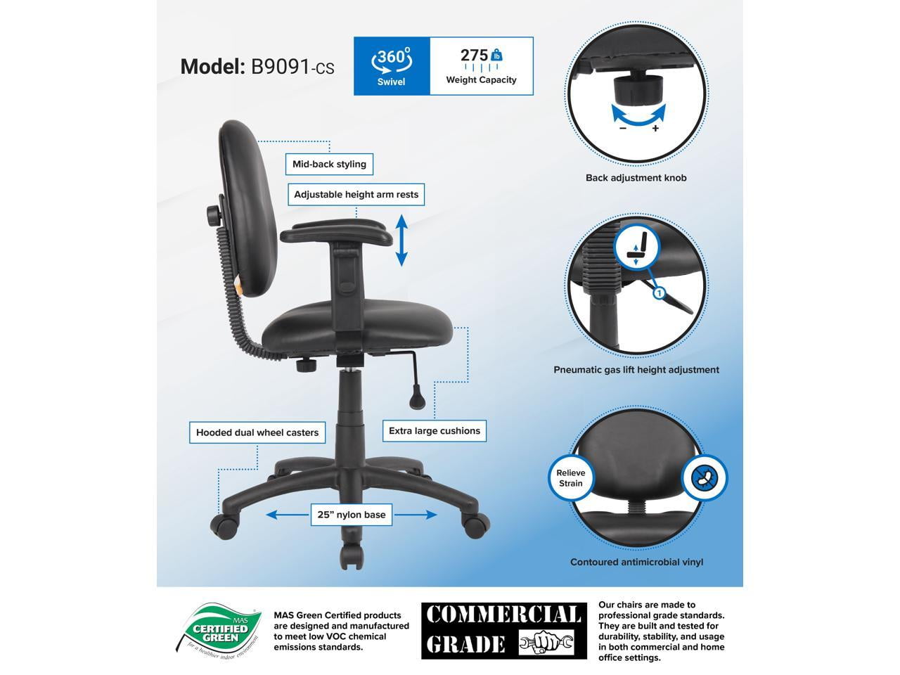 Mid back ergonomic task chair ideal for home and office Upholstered in black antimicrobial vinyl Contoured back and seat provides support and helps relieve back strain Extra large seat and back cushions Pneumatic gas lift seat height adjustment Hooded double wheel casters Black nylon base Adjustable arms MAS Certified Green Weight capacity: 275 lbs. Back size: 17.5″W X 16.5″H Arm height: 24″-32″ H Seat dimensions: 20″ W x 18″ D x 17-22″ Overall dimensions: 25″W x 25″D x 32-40″H Assembly required