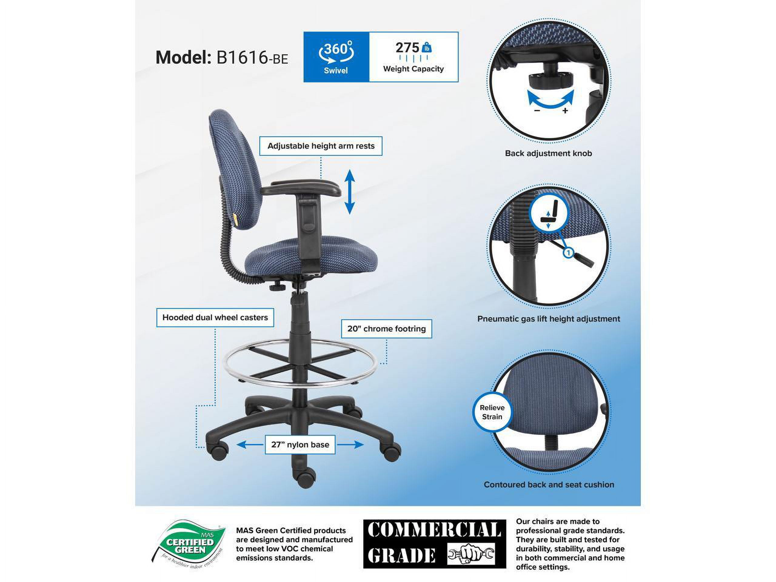 Boss Office Products Ergonomic Adjustable Drafting Chair with Adjustable Arms and Removable Foot Rest, Blue