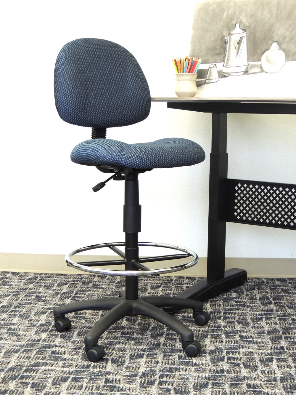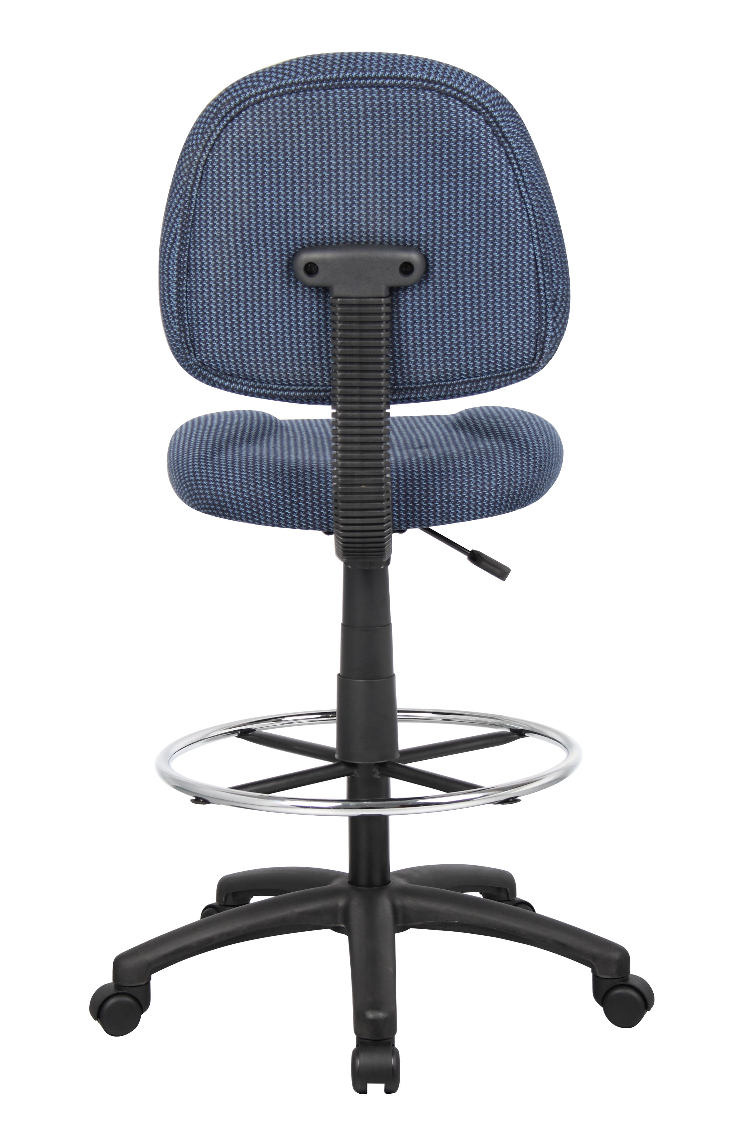 This blue tweed drafting stool comes with an easily adjustable pneumatic gas lift seat height adjustment, to help you find the personalized sitting style that suits you and your work environment. The contoured back and seat can help relieve back strain through extended periods of work. The 20-inch diameter chrome foot ring provides added foot and leg support. The Euro-style nylon base provides greater stability to the stool by spreading the load over a larger surface area, and the heavy duty dual wheel casters make it easy to move and shift directions.