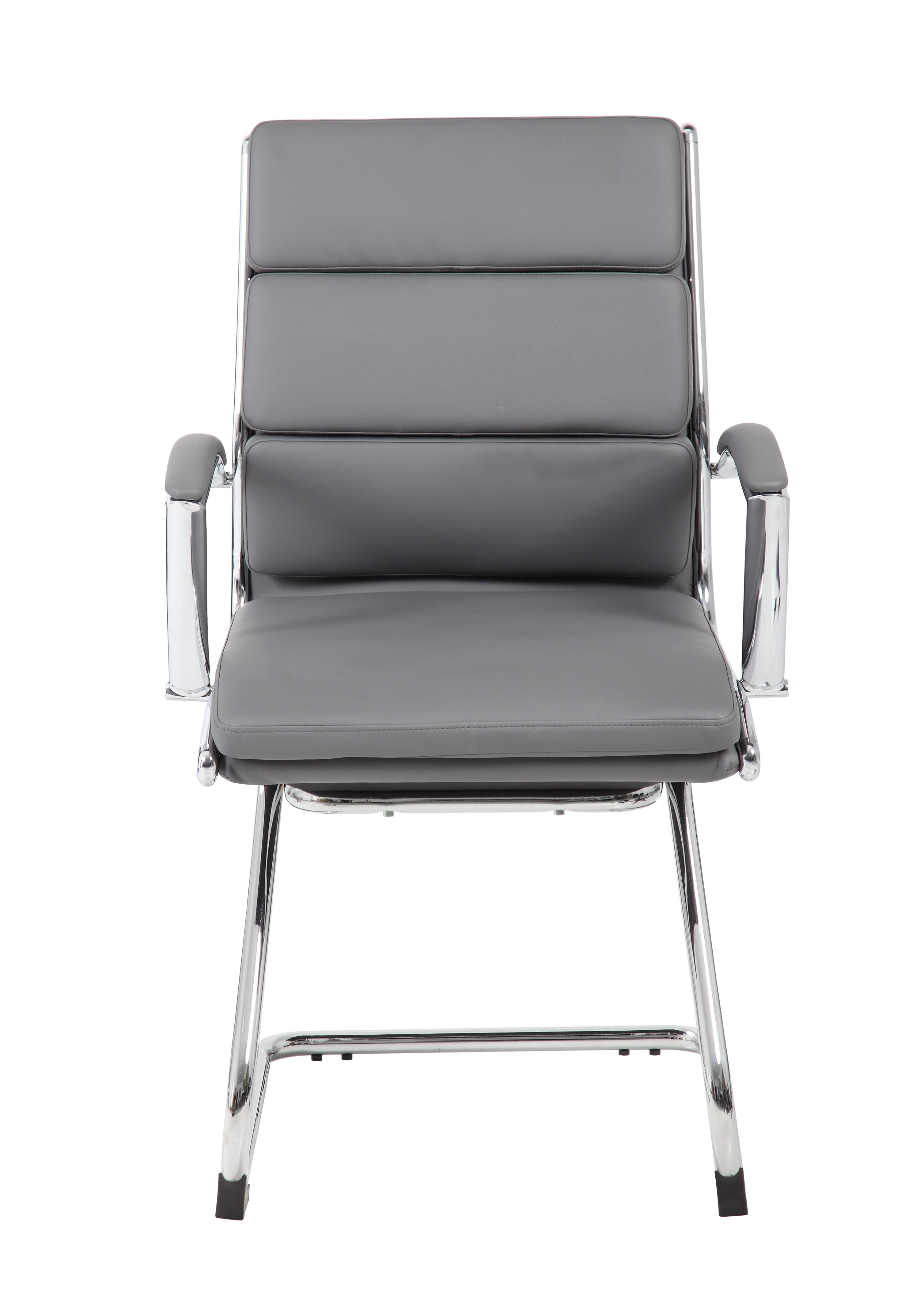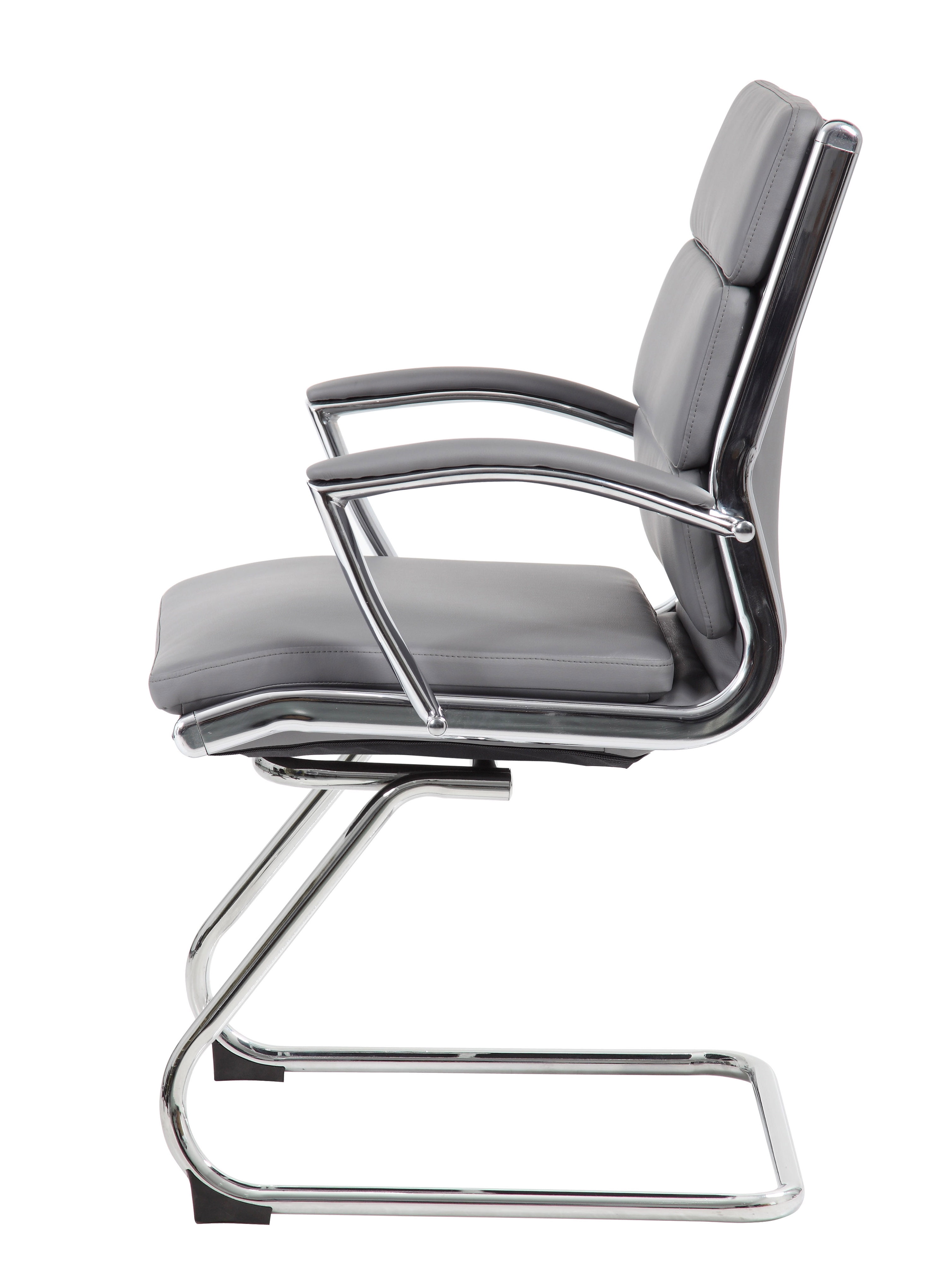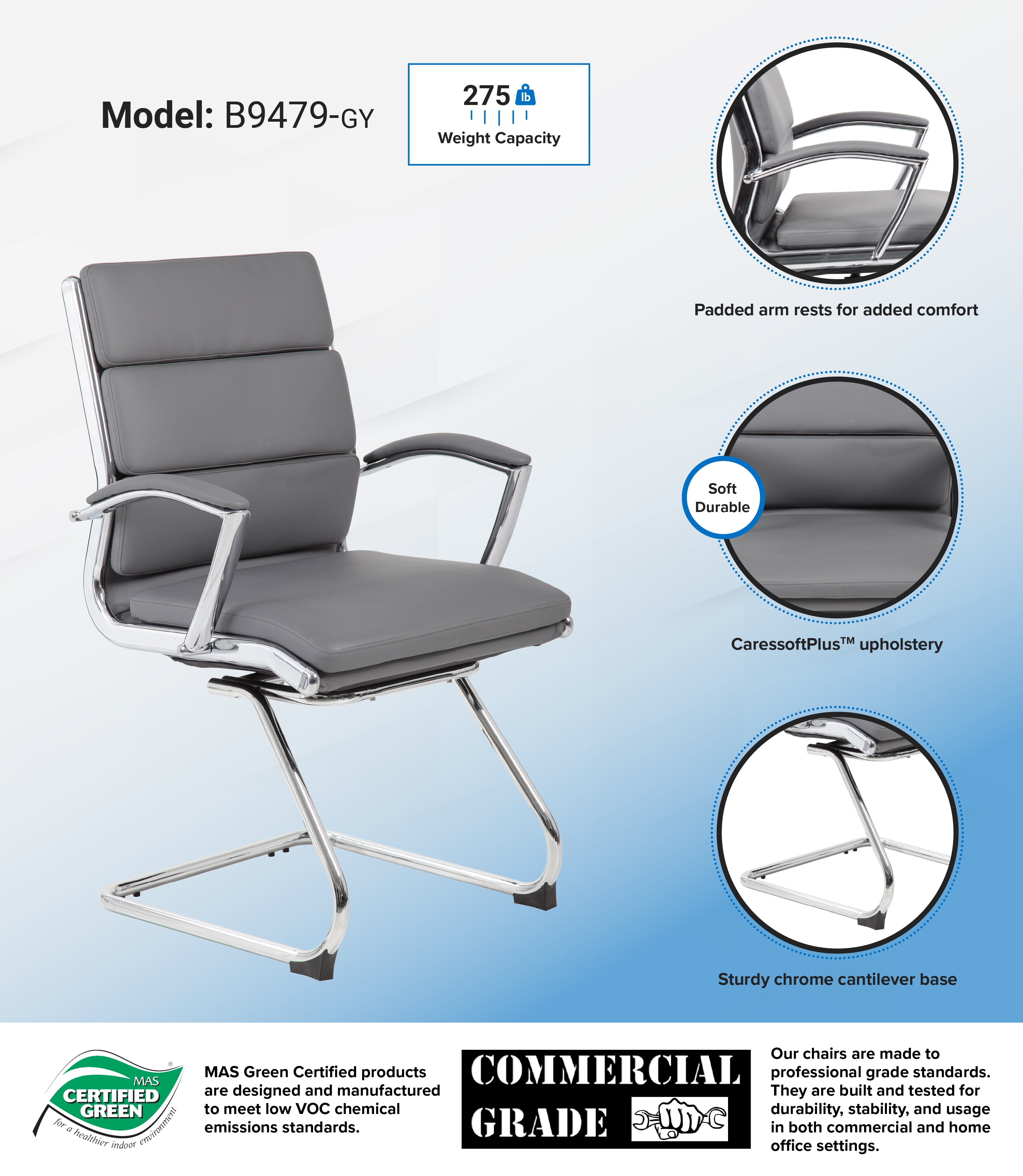 The ideal chair for conference rooms and offices, the Boss CaressoftPlus Guest Chair provides comfort and style to any business environment. Its soft, CaressoftPlus vinyl upholstery is exceptionally durable and breathable while also being easy to clean so they always look great. The waterfall seat edge is designed to relieve pressure to the legs while the padded arm rests provide excellent forearm support. Its chrome cantilever base finishes the look, and perfectly complements the black upholstery, giving you a look that is sleek and modern. Features: Finish: Gray Material: CaressoftPlus™ Upholstered with ultra soft, durable and breathable Gray CaressoftPlus™ upholstery Metal chrome plated arms topped with firm arm pads Style and durability with the chrome cantilever base Easy movement for reception or conference with sled base Commercial Office Grade Specifications: Product Dimensions: 39″ H x 23″ W x 23″ D Product Weight: 33 lbs.