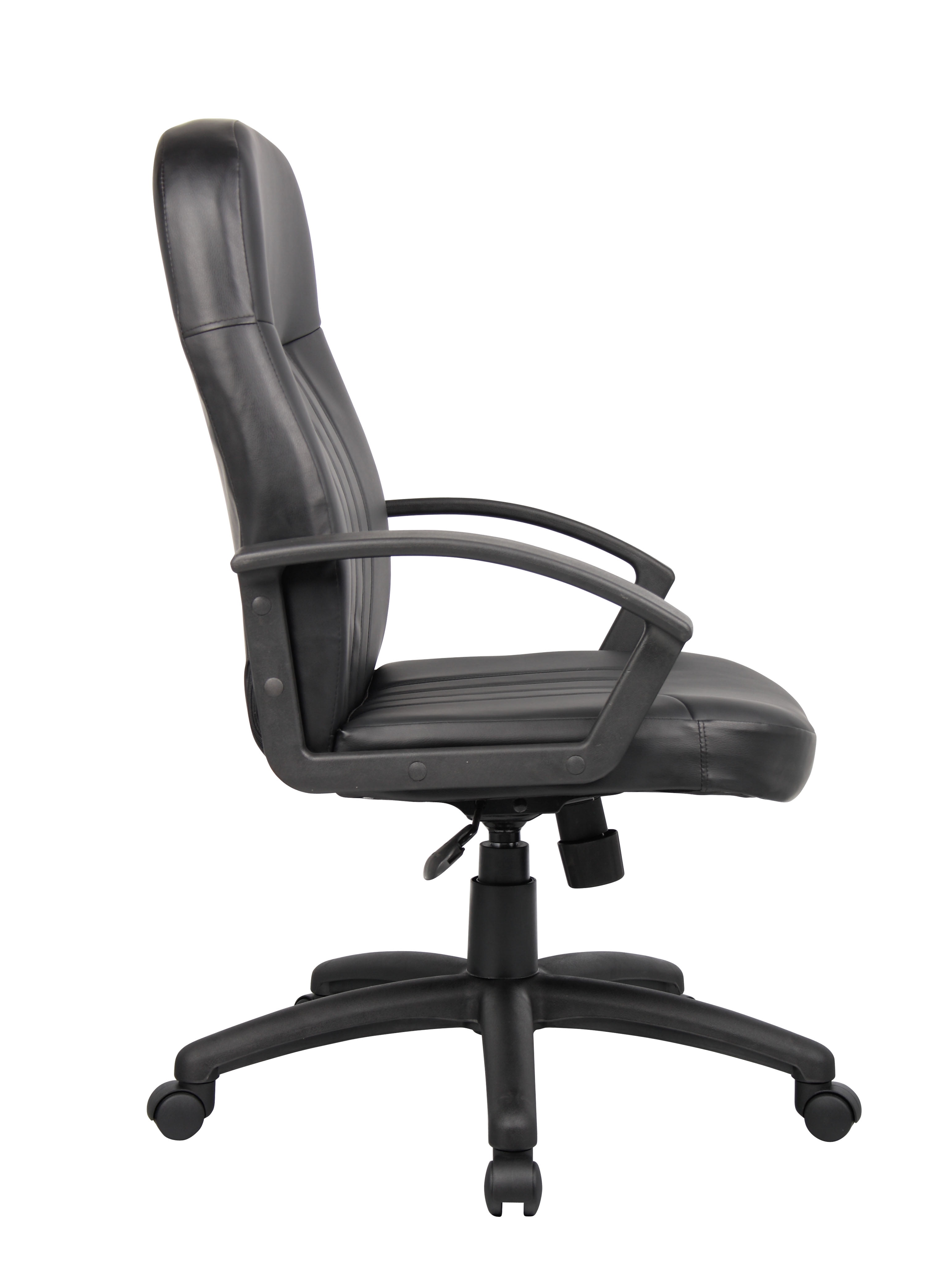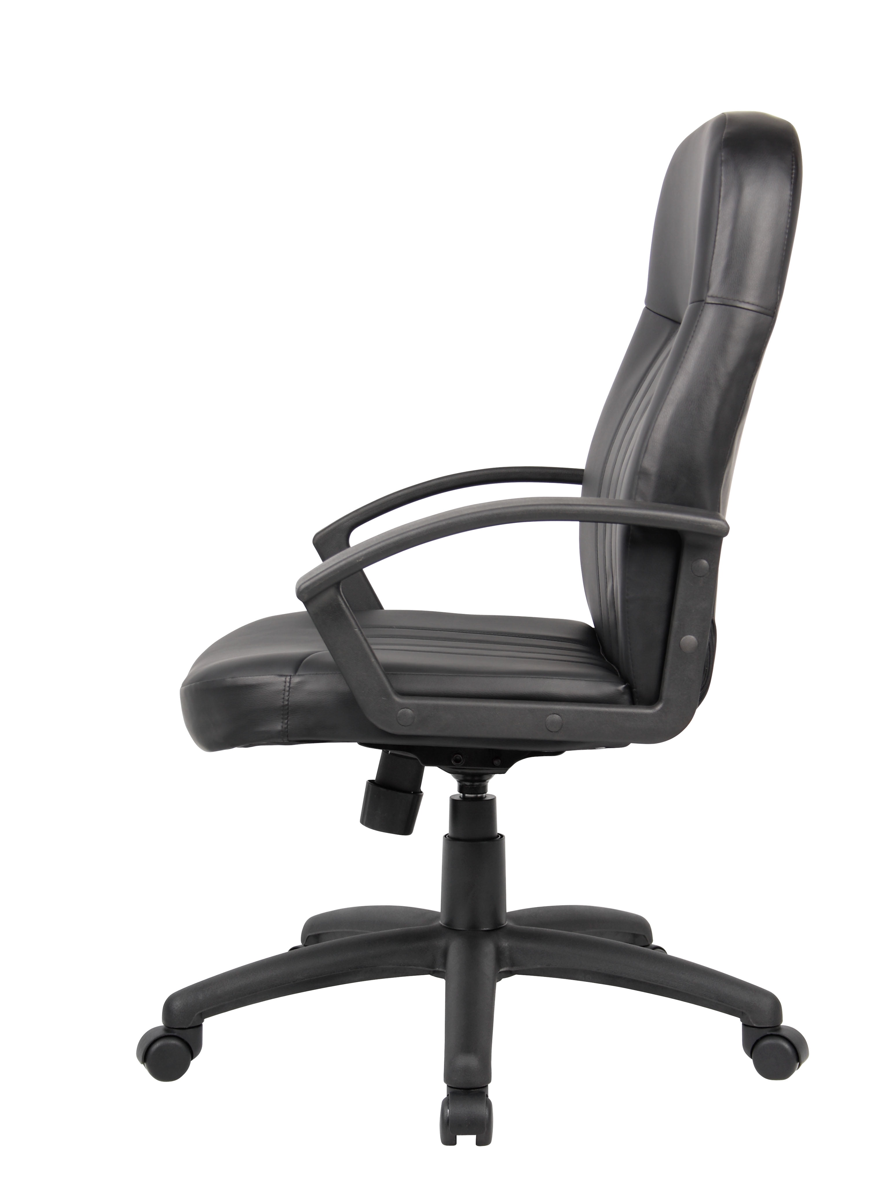 The smoothly designed Contemporary Executive Office Chair brings professionalism and comfort your office. The variety of ergonomic features on this seat ensure the best in comfort and back support. Contoured arms and a high back ensure the highest standard of stability. The black leather seat and back are chic and stylish, sure to complement any desk set. The adjustable pneumatic height and tilt ensures that this chair will be a perfect fit in the home office or professional workspace. Relax and take care of the job with the Contemporary Office Chair.