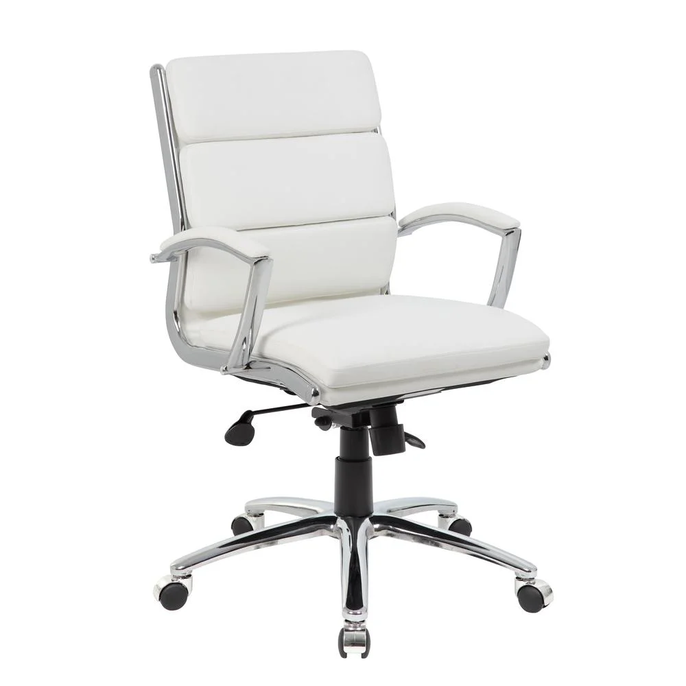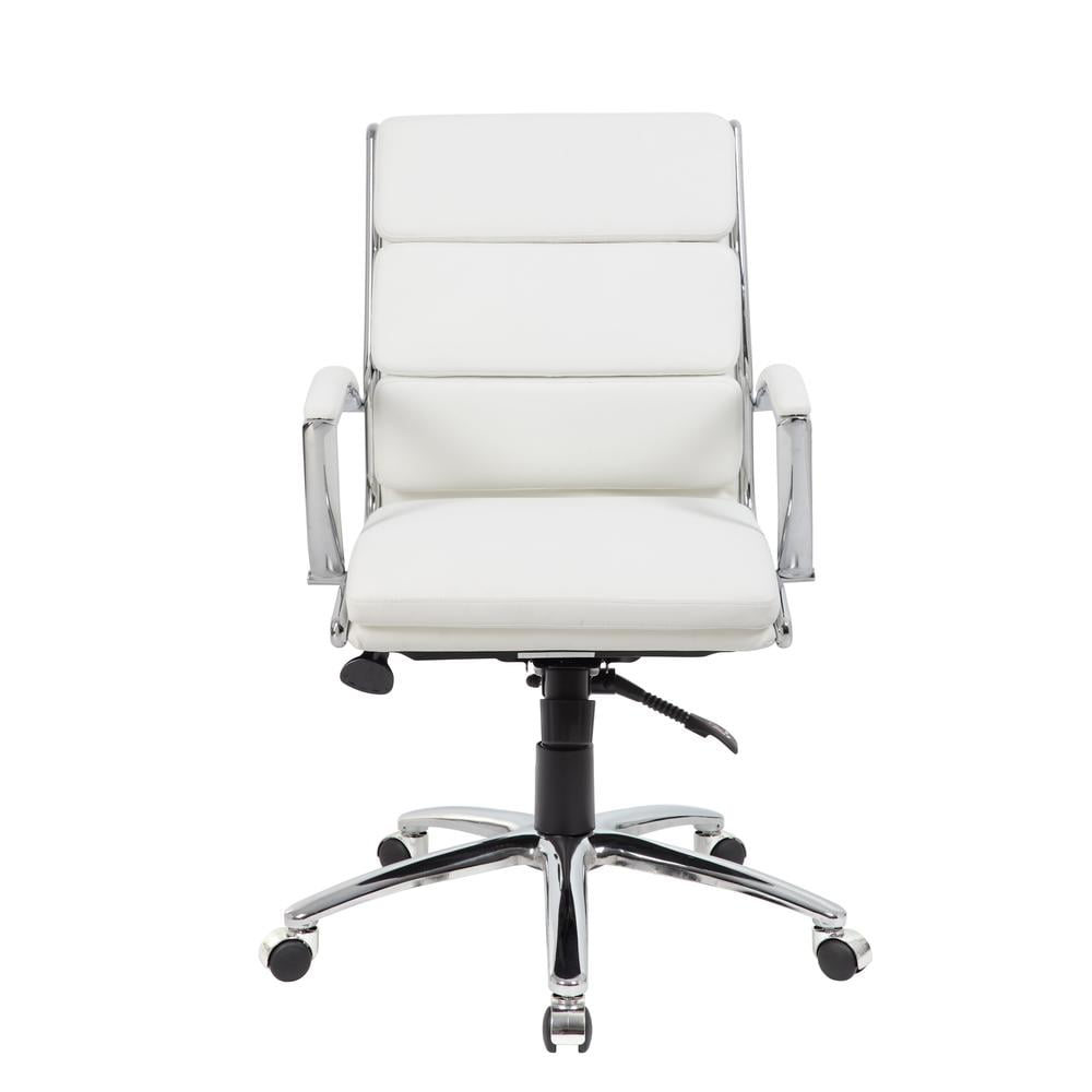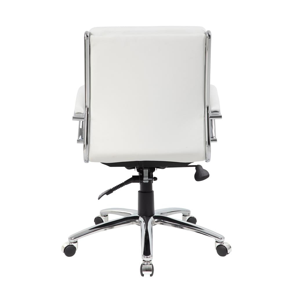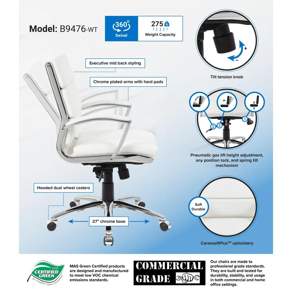 The modern Boss mid-back executive chair in white Caressoftplus Vinyl is the perfect combination of modern sophistication and ergonomic support. Upholstered in ultra-soft, breathable Caressoftplus Vinyl, this chair delivers the luxurious look and feel of leather with enhanced durability and easy maintenance—ideal for high-use office environments. Built for performance and style, it features a two-paddle mechanism: one paddle controls seat height via pneumatic gas lift, while the other releases or locks the spring tilt function. The chair also includes tilt tension adjustment and an upright lock for personalized comfort during long work hours. Its sleek chrome metal finish is matched with a heavy-duty 27-inch chrome base and 2-inch nylon dual wheel casters, offering smooth mobility and strong support. With a weight capacity of up to 275 lbs., this chair is a durable and elegant seating solution for executive settings.