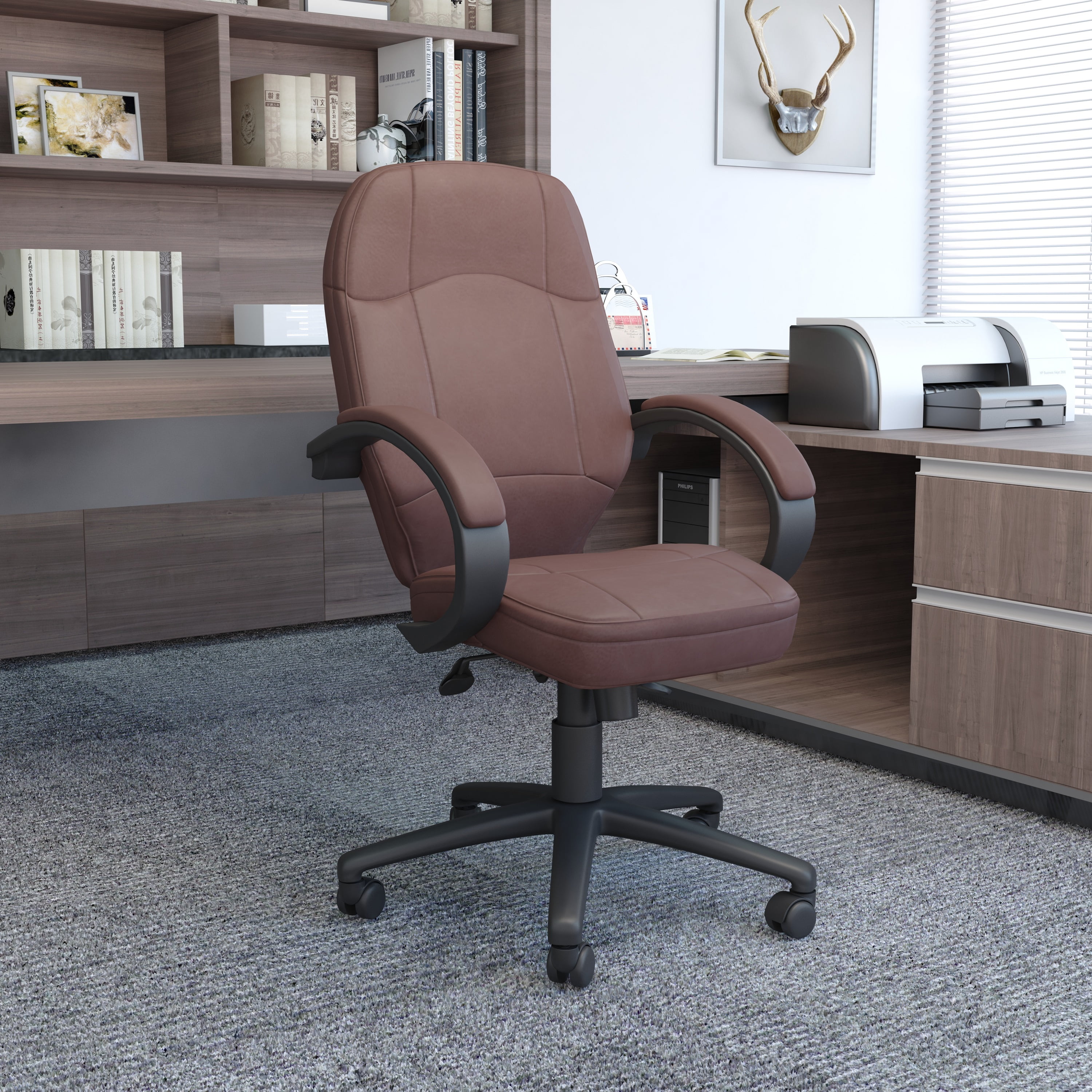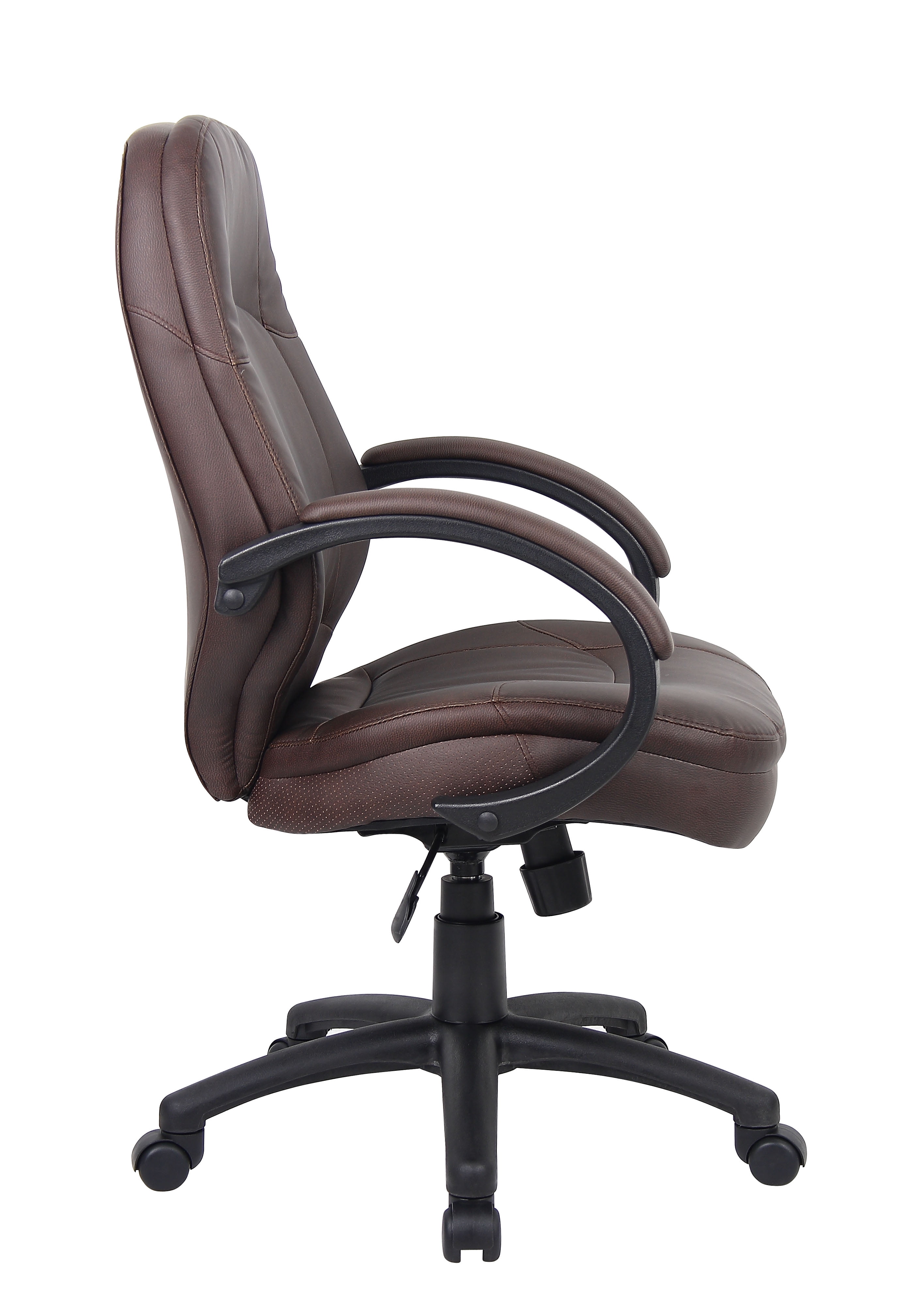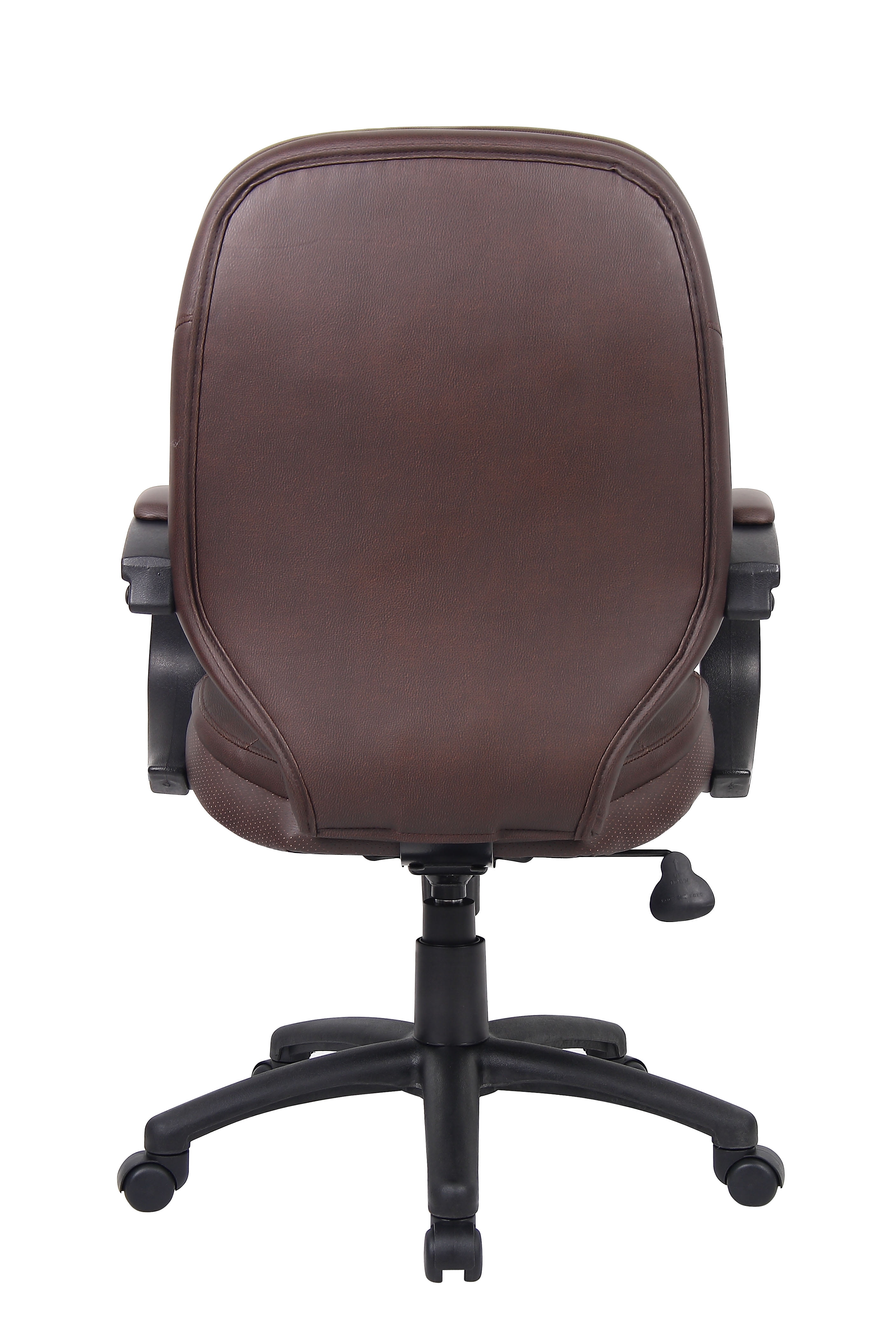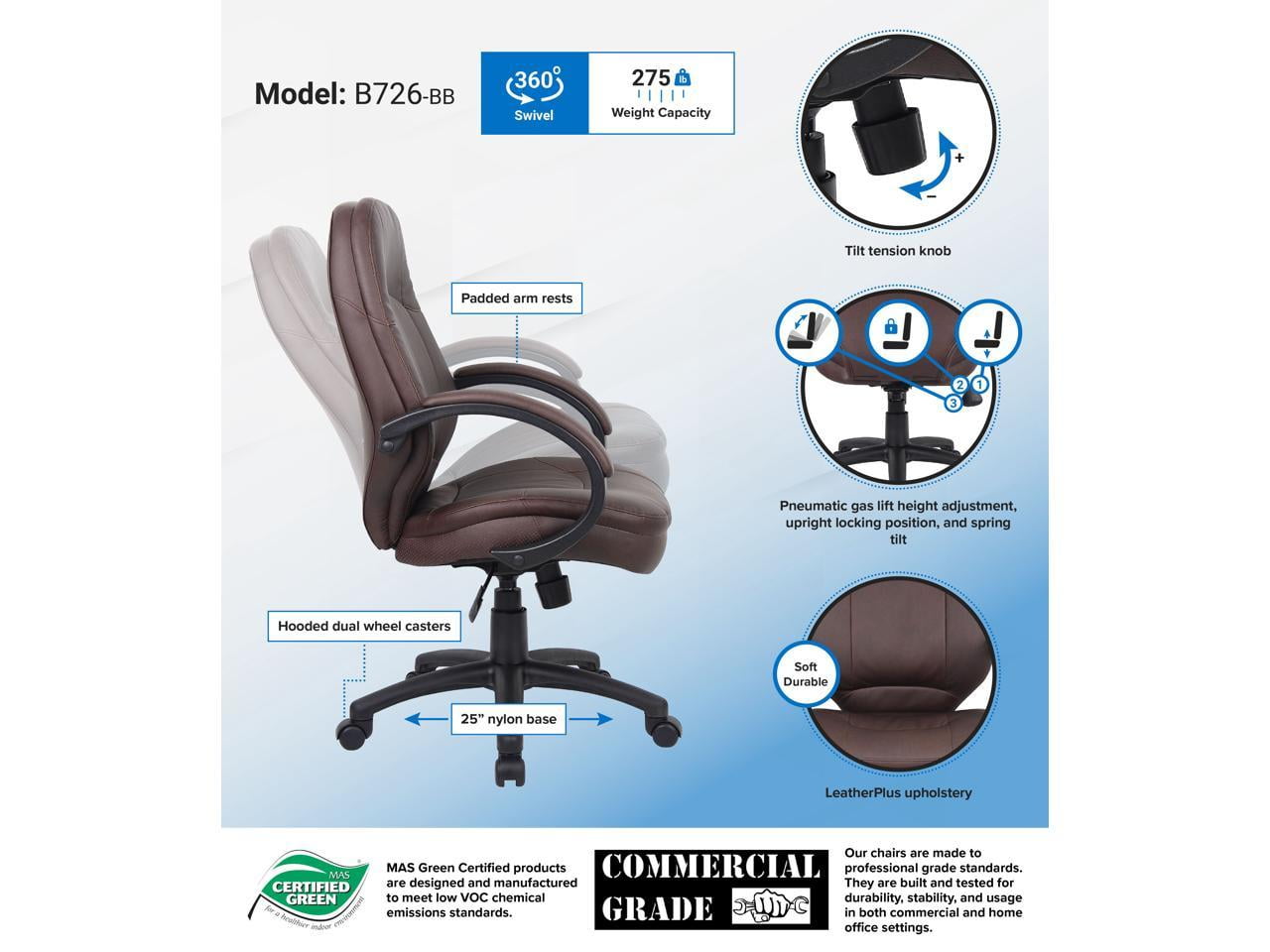 Boss LeatherPlus Executive Chair Our LeatherPlus executive chair is a perfect addition to any office. As its name indicates, it is beautifully upholstered in Bomber Brown LeatherPlus, a combination of leather and polyurethane that promotes softness and durability. Additional features include padded armrests, pneumatic gas lift seat height adjustment, an upright locking position, and adjustable tilt tension control. Its black nylon base has a 25” circumference and sits atop five hooded double wheel casters. Its overall seat size is 20” W x 19” D. Beautifully upholstered in Bomber Brown LeatherPlus LeatherPlus is leather that has been infused with polyurethane for added softness and durability Black arms with padded arm rests 25″ nylon base Gas lift seat height adjustment Hooded double wheel casters Adjustable tilt tension control – Back Width: 19.5 – Color: Bomber Brown – Depth: 28.5 – Height: 40 – Seat Depth: 19 – Seat Width: 20 – Width: 27 – Casters: Dual Wheel Nylon 2 Inch – Seat Size: 20″W X 19″D – Back Size: 19.5″W X 25.5″H – Seat Height: 19″-22.5″H – Arm Height: 27.5″-31″H – Back Height: 25.5 – Frame Color, Base Color, or Wood Finish: Black – Primary Material: LeatherPlus – Chair Base: Nylon 25 Inch – MAX HEIGHT: 43.5