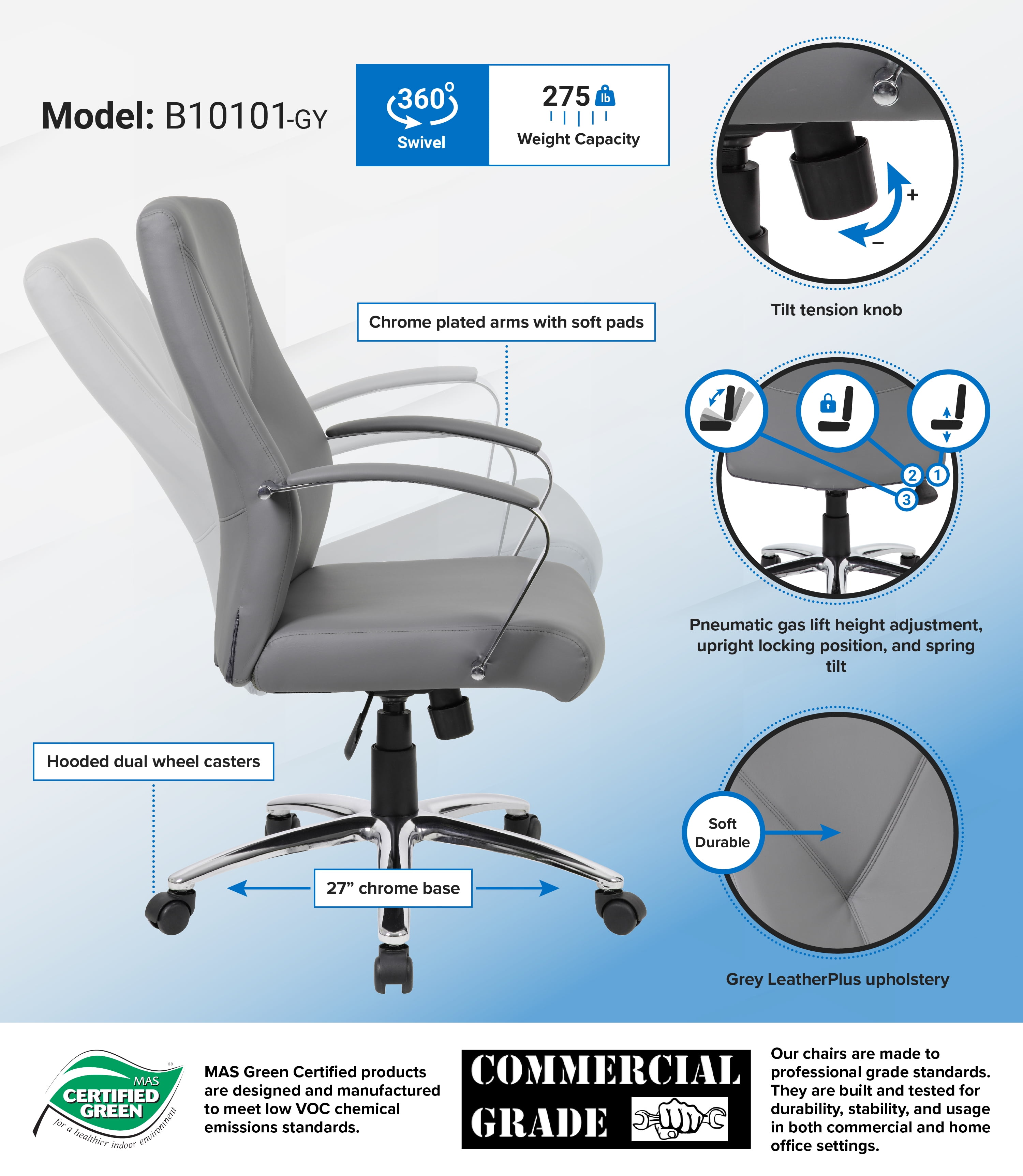 Beautifully upholstered in Grey LeatherPlus (leather and polyurethane for added softness and durability) Metal chrome plated arms topped with soft arm pads Upright locking position Adjustable tilt tension control Hooded double wheel casters Pneumatic gas lift seat height adjustment Large 27″ chrome base Assembly required MAS Certified Green Overall dimensions: 27″W x 29″D x 41″ – 44″H Seat height: 19″ – 22″H