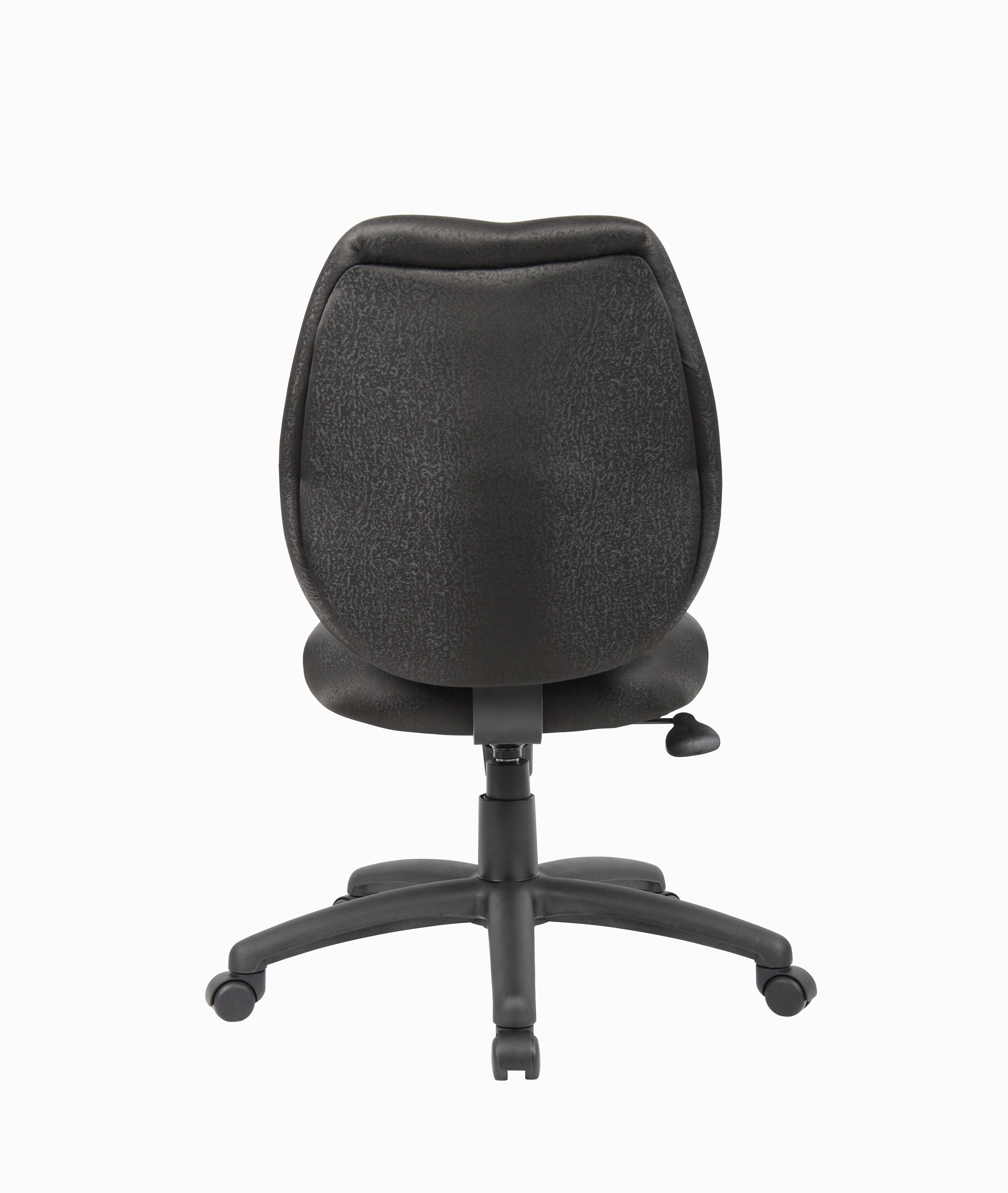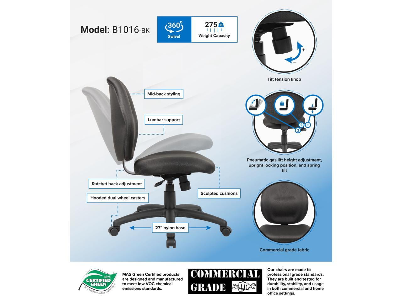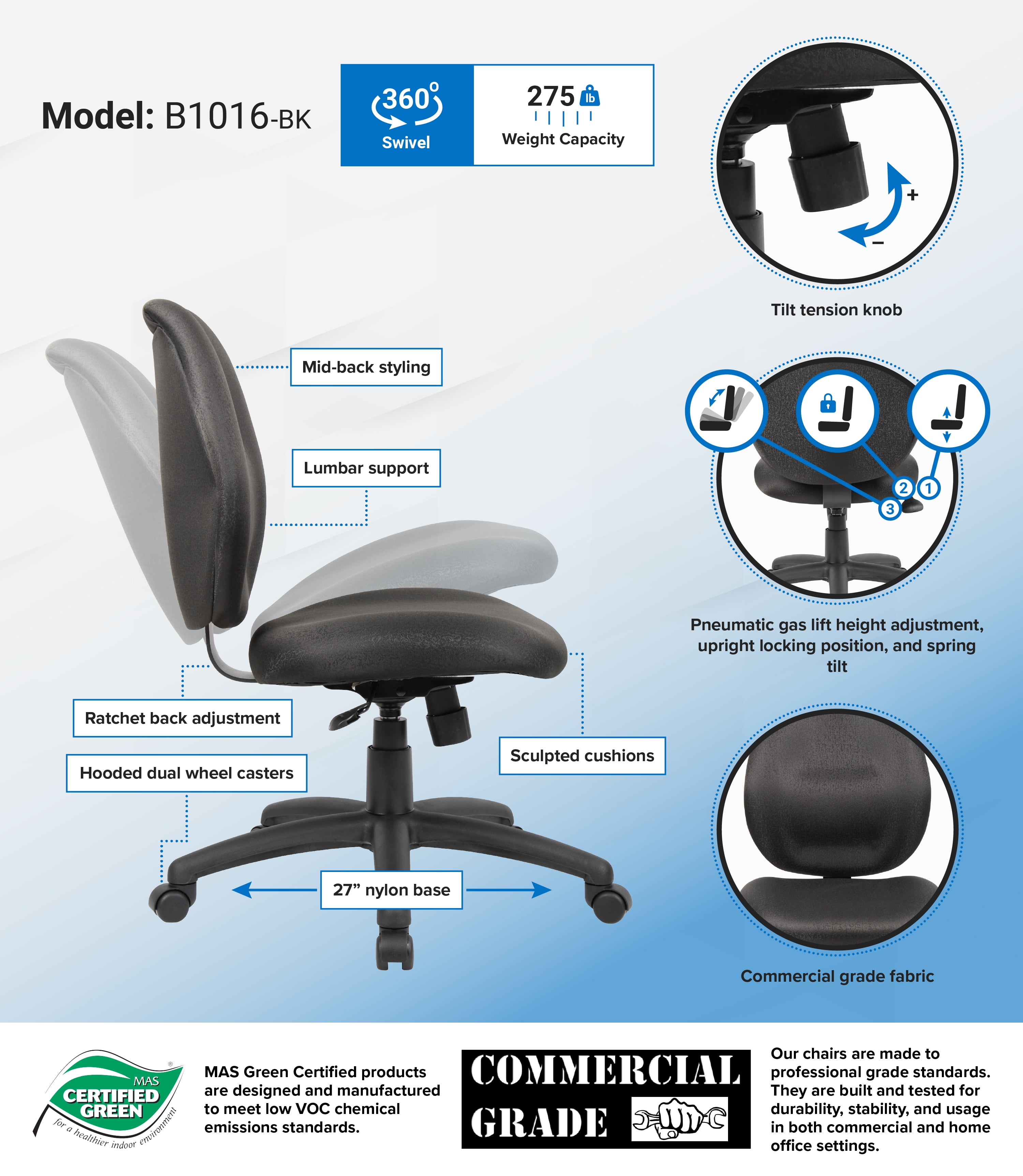 Mid-back styling with firm lumbar support Sculptured seat cushion made from molded foam that contours to the shape of your body Ratchet back height adjustment mechanism Large 27″ nylon base for greater stability Adjustable tilt tension Elegant styling upholstered with commercial grade fabric Pneumatic gas lift provides instant height adjustment of the seat Hooded double wheel casters Upright locking position MAS Certified Green for low VOC emissions 6-year limited manufacturer warranty Assembly required Product Dimensions: 20″ W x 27″ D x 36.5-41″ H Product Weight: 27 lbs. Seat Dimensions: 20″ W x 19″ D x 18.5″-23″ H Weight Capacity: 275 lbs.