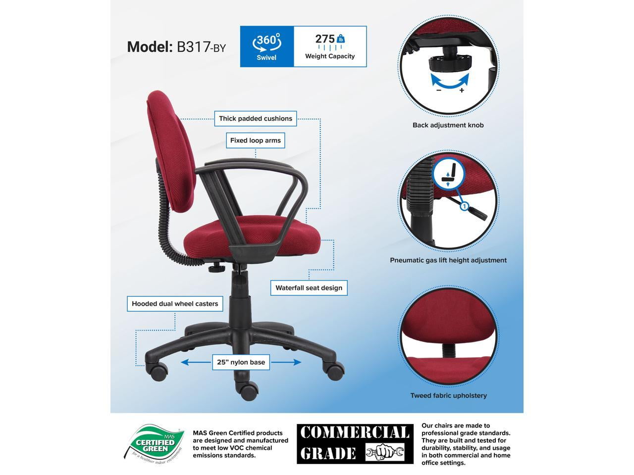 Thick Padded Seat and Back – Delivers cushioned comfort for long hours of focused work. Built-In Lumbar Support – Encourages proper posture and reduces lower back strain. Adjustable Back Depth – Customize the chair to better support your spine and sitting style. Pneumatic Seat Height Adjustment – Quickly adjust seat height to suit your desk and preferences. Loop Arm Design – Provides relaxed, ergonomic support for arms and shoulders. Durable Five-Star Nylon Base – Ensures reliable strength and balanced stability. Hooded Double-Wheel Casters – Glide easily across floors and shift directions effortlessly. MAS Certified Green for low VOC emissions Assembly required Overall dimensions: 25.5″W x 25″D x 34.5 – 40″H Seat height: 18″ – 23.5″ Seat size: 15.2″W x 17″D Arm height: 26.5-31.5″ H Back size: 17.25″W X 14.5″H