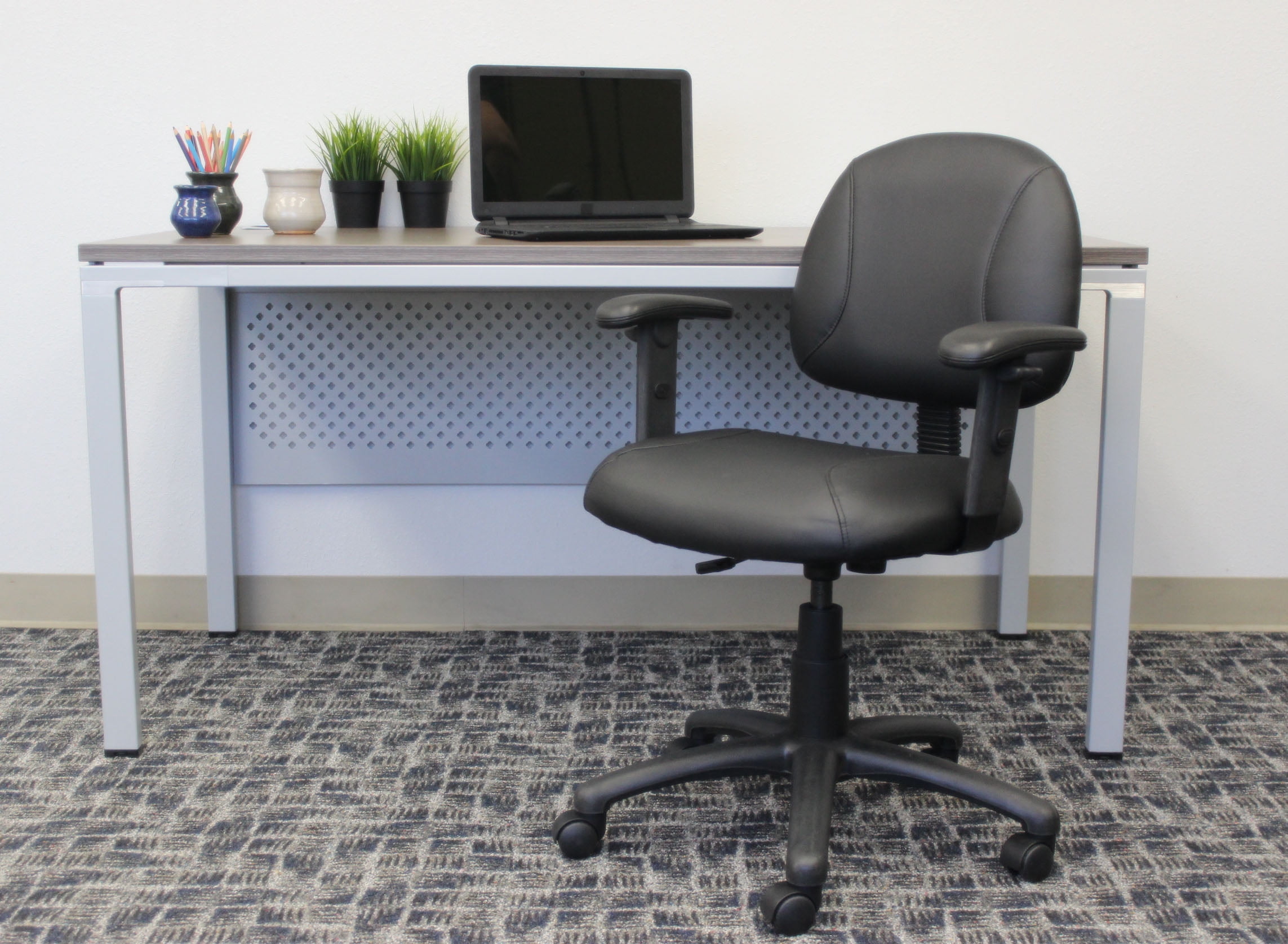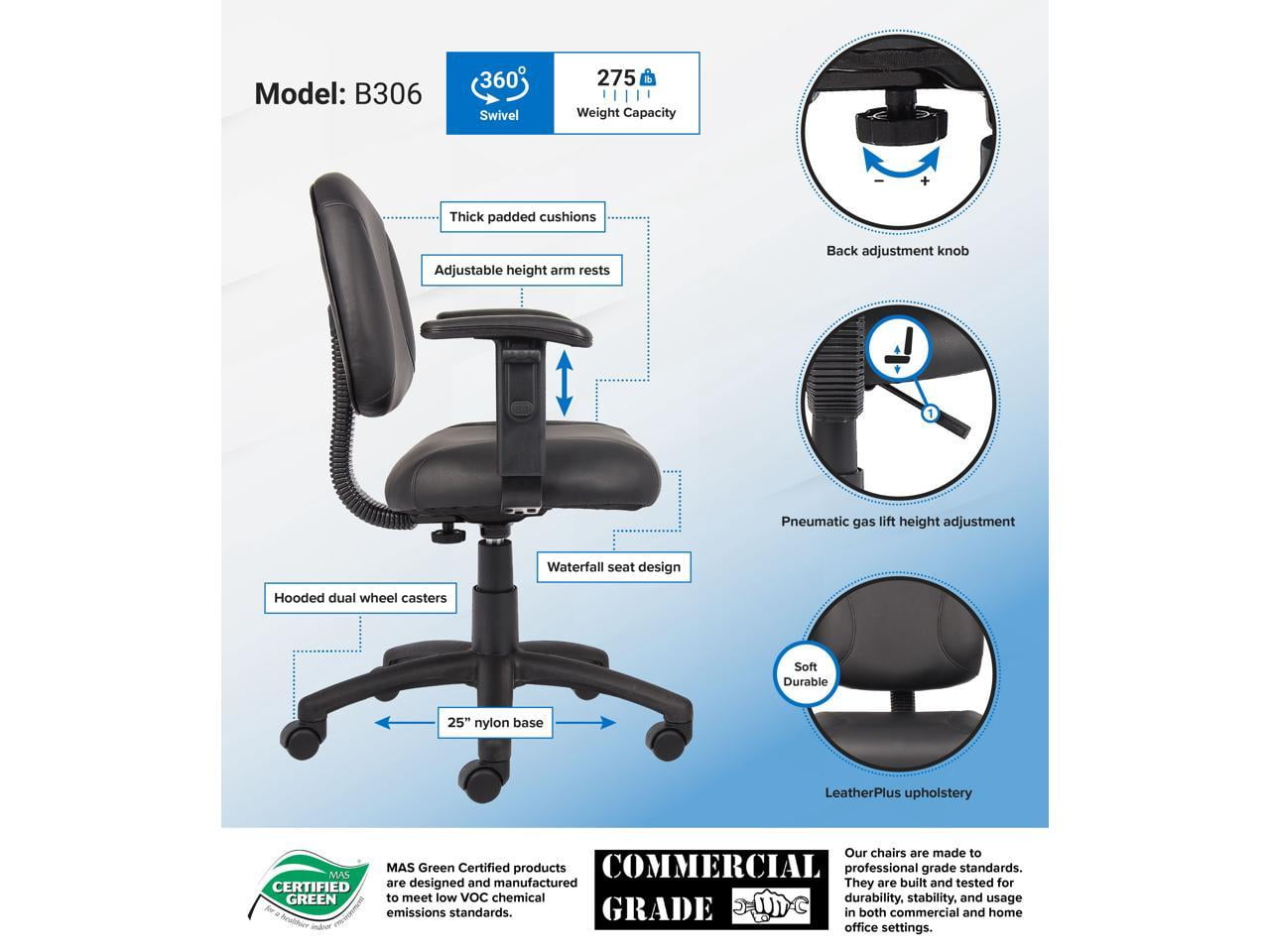 Beautifully upholstered in LeatherPlus Pneumatic seat height adjustment Thick padded seat and back with built-in lumbar support Waterfall seat reduces stress to your legs 5 star nylon base allows smooth movement and stability Adjustable depth back Hooded double wheel casters Adjustable arms Assembly required MAS Certified Green Overall dimensions: 25″ W x 25″ D x 34.5-39.5″ H; Seat height: 19″-24″ H