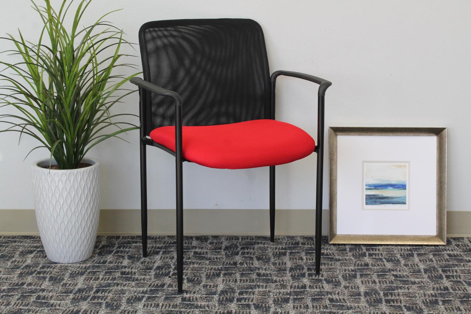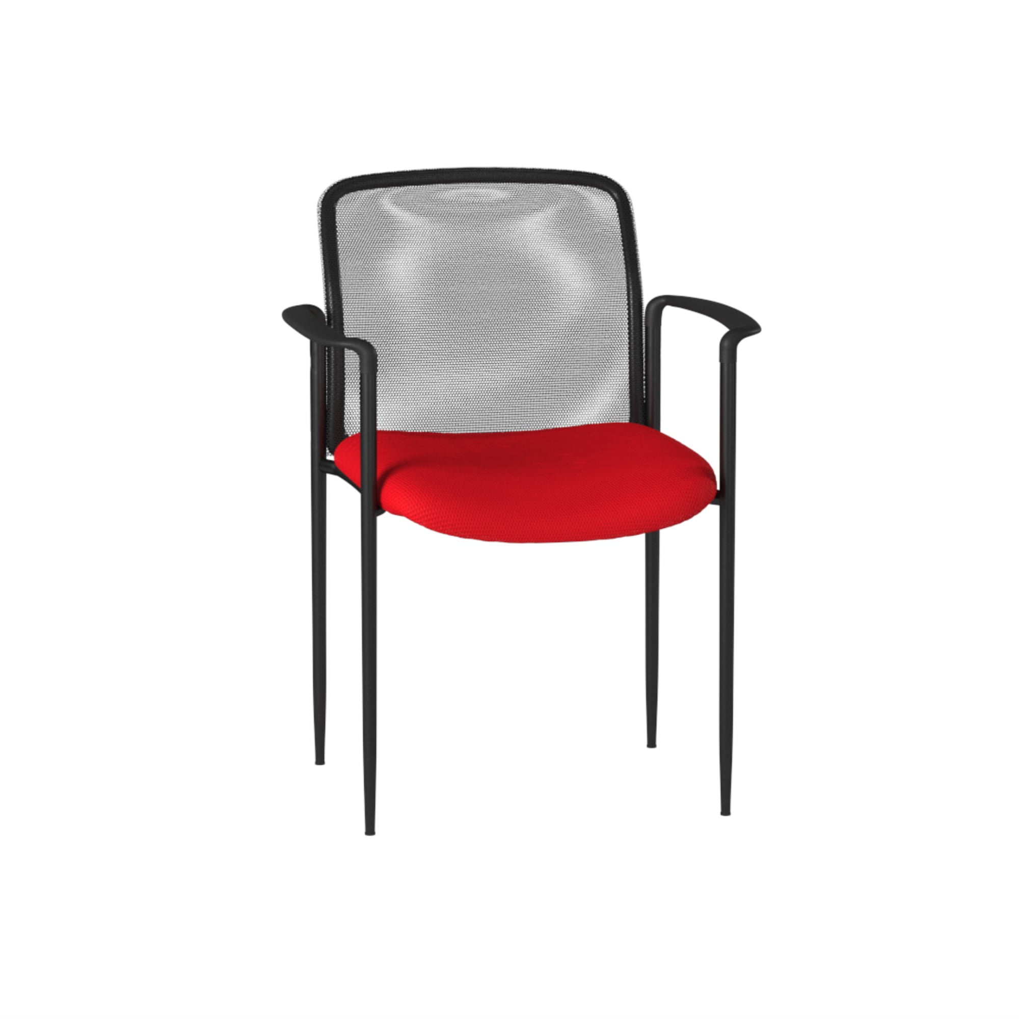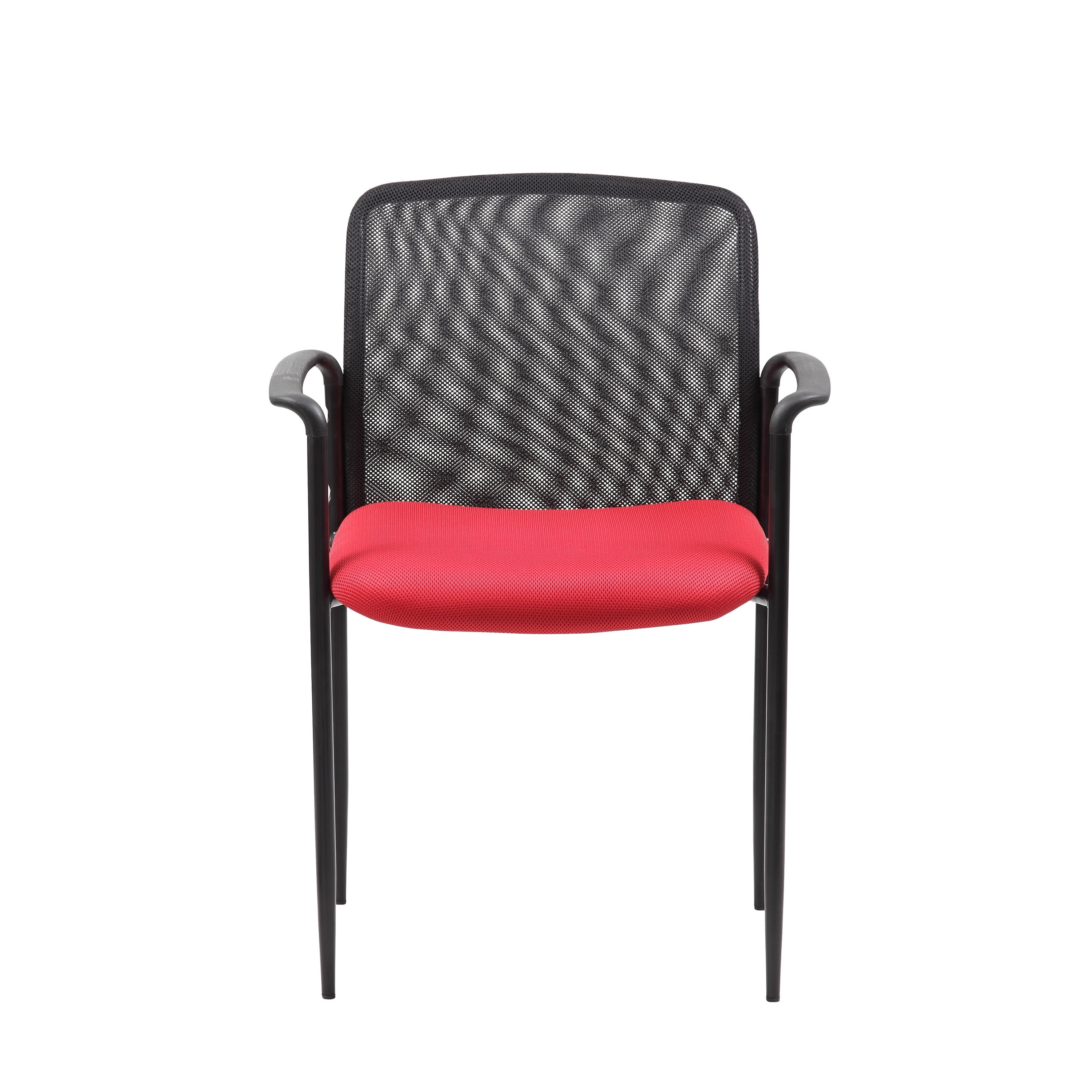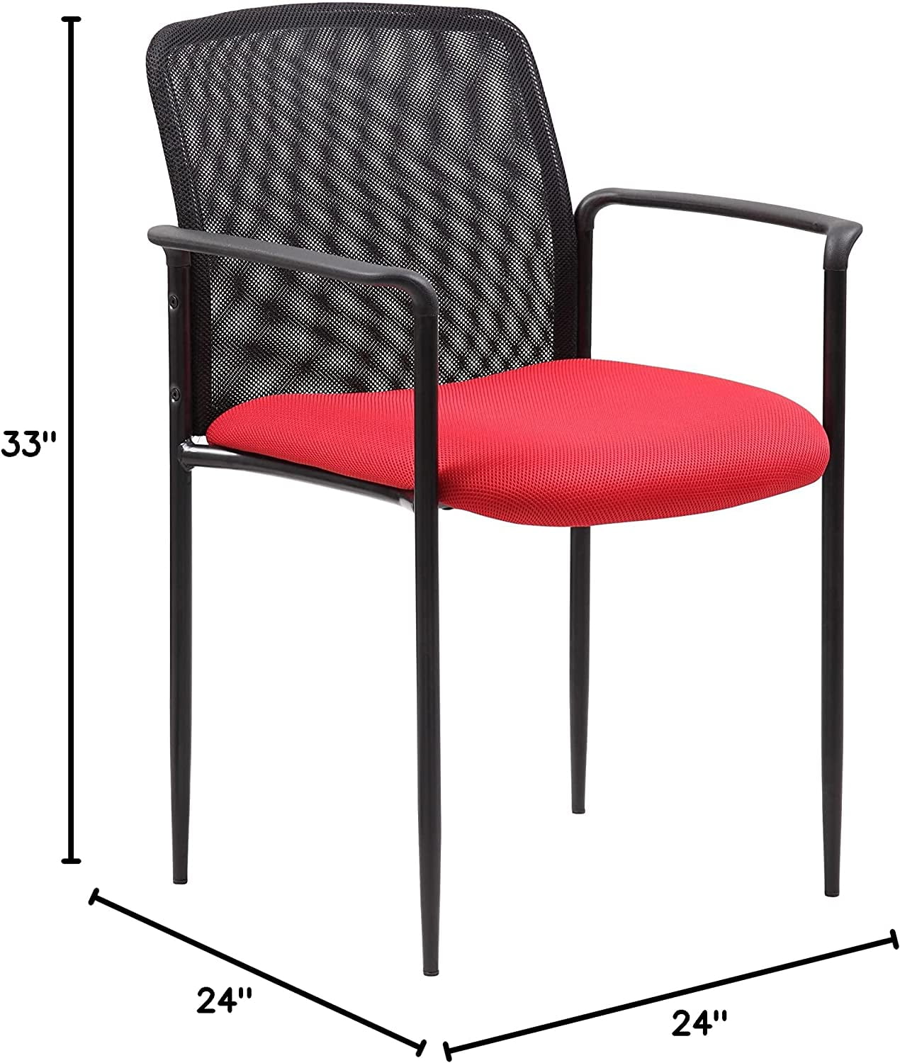 Color: Red Arm Dimension: 25.5″ H Black powder coated tubular steel frames Back Dimension: 16.75″ H x 18.75″ W Molded arm caps Stackable for space-saving storage Waterfall seat to reduce stress on legs Designer tapered legs Seat upholstered with blue mesh fabric Stacks 4 high max