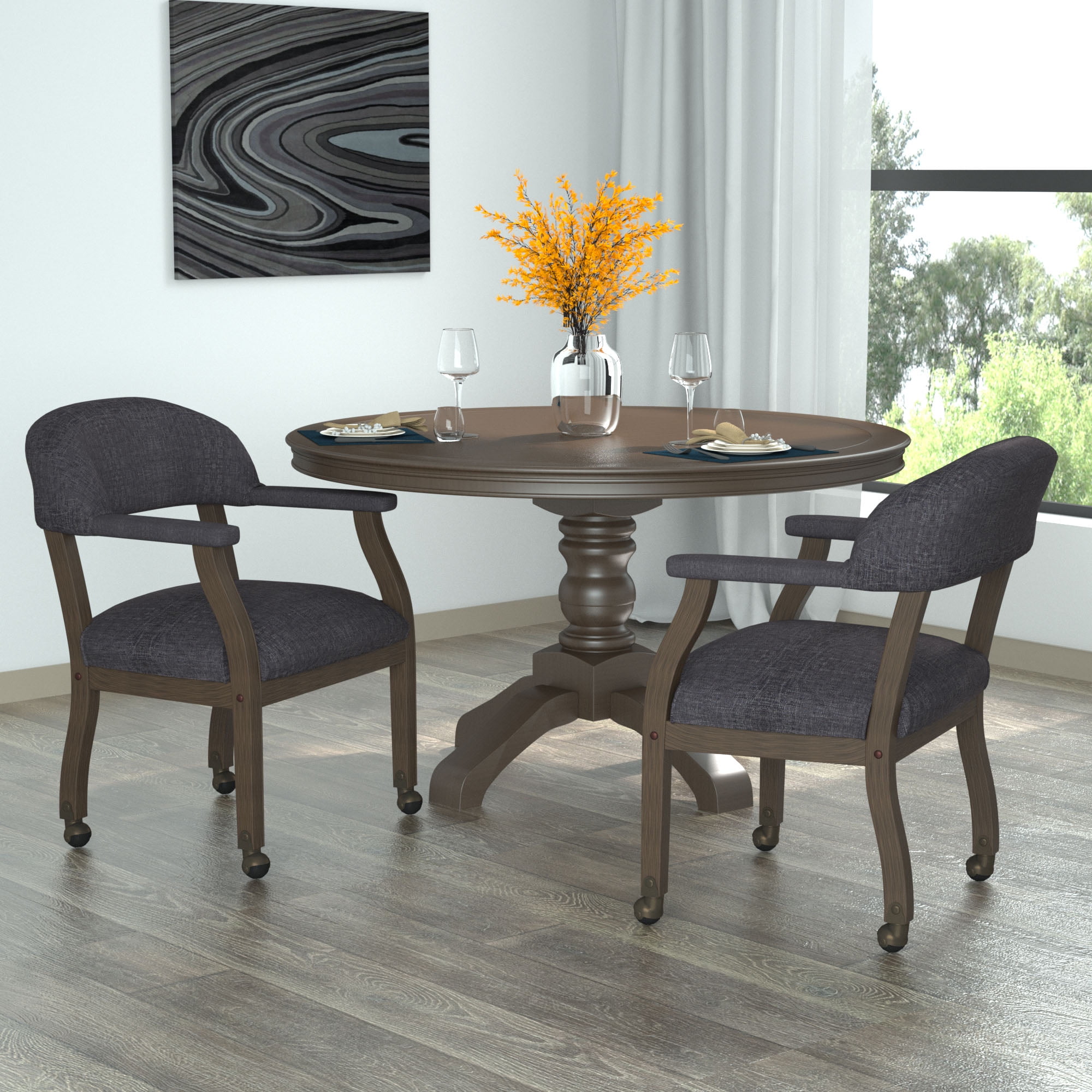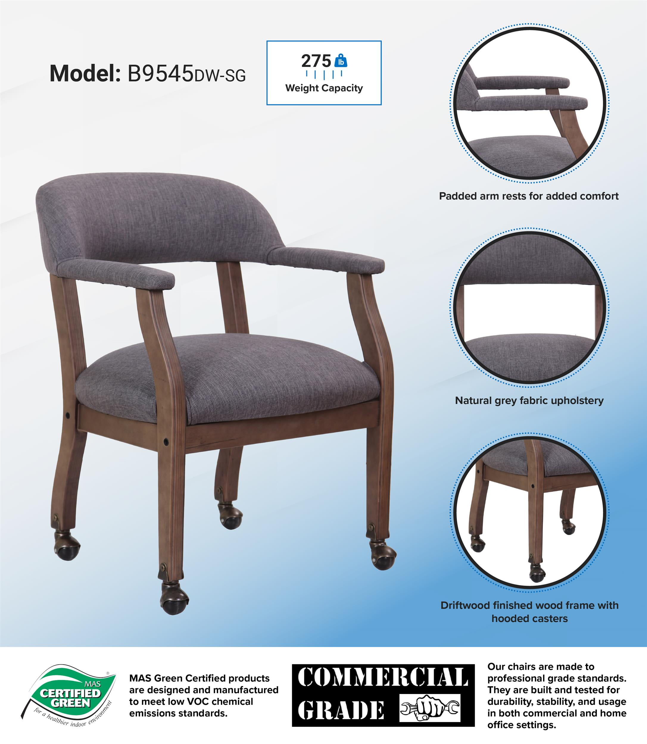 Classic Design – Timeless silhouette with a natural grey fabric finish complements both traditional and modern spaces. Durable Hardwood Frame – Solid wood construction ensures long-lasting strength and stability. Comfortable Seating – No-sag spring seat and padded arms provide a plush, supportive sitting experience. Ergonomic Back Support – Contoured back promotes good posture for added comfort during extended use. Brass Hooded Casters – Stylish and functional, allowing easy movement without compromising aesthetic appeal. Versatile Placement – Perfect for reception areas, conference rooms, home offices, or executive settings. MAS Certified Green Assembly required Overall dimensions: 24″W x 26″D x 31″H Seat height: 18.5″ Seat size: 22″W x 21″D Arm height: 25″ Back size: 24″W X 8″H