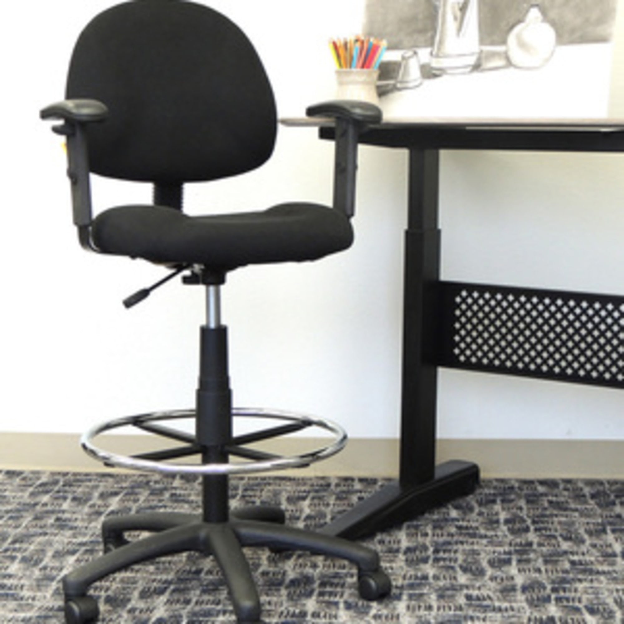 Work hard. Play hard. All of the above. Working from home at your standing desk or at the office, in the garage, at the kitchen counter or in the craft room-you deserve to be comfortable. The Boss Office & Home Sit to Stand Adjustable Desk Chairs were specifically designed for those who work or hobby intensively. Ergonomically designed and contoured with a thick-cushioned, padded seat and back, it provides the comfort and support you need to work or create for extended hours without feeling fatigued. This practical and reliable drafting stool comes in 3 options- without arms, with static loop arms, or with adjustable height arms. Regardless of choice, arms can easily be removed should you need. Its heavy-duty dual-wheel casters make moving and getting the job done easier. A favorite of many from uses ranging to shop stool or sound-board seating solution, study space, or sewing surface seat, the Boss stool is built to serve you.