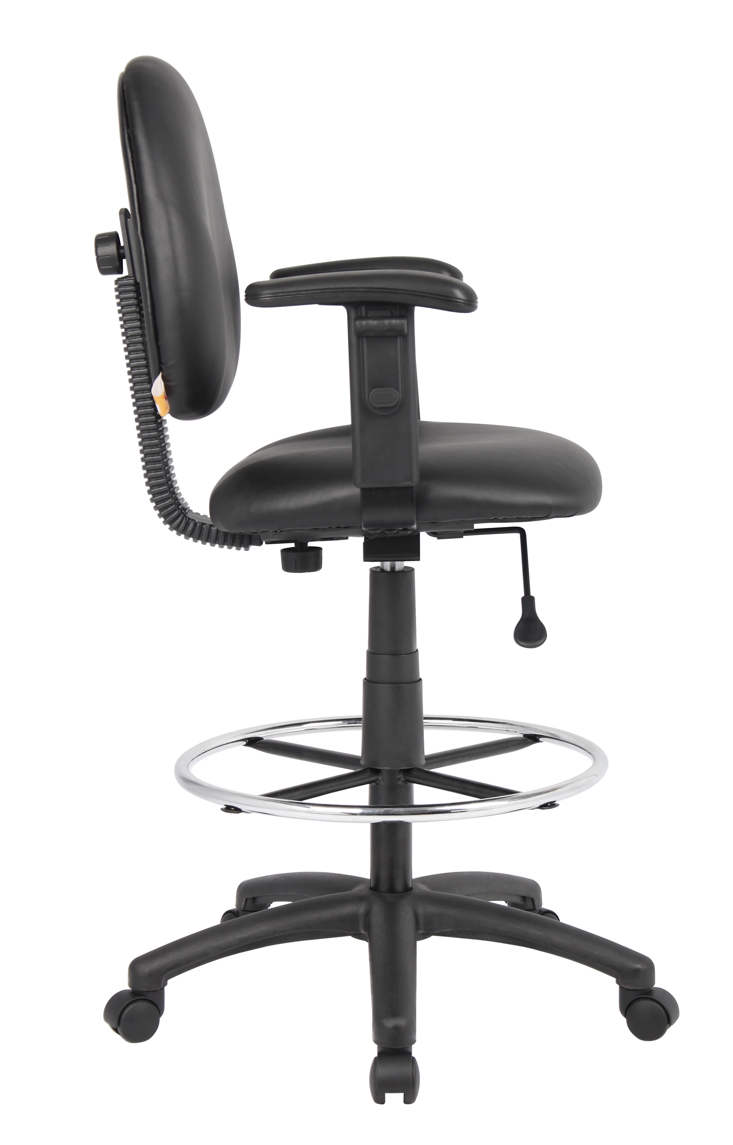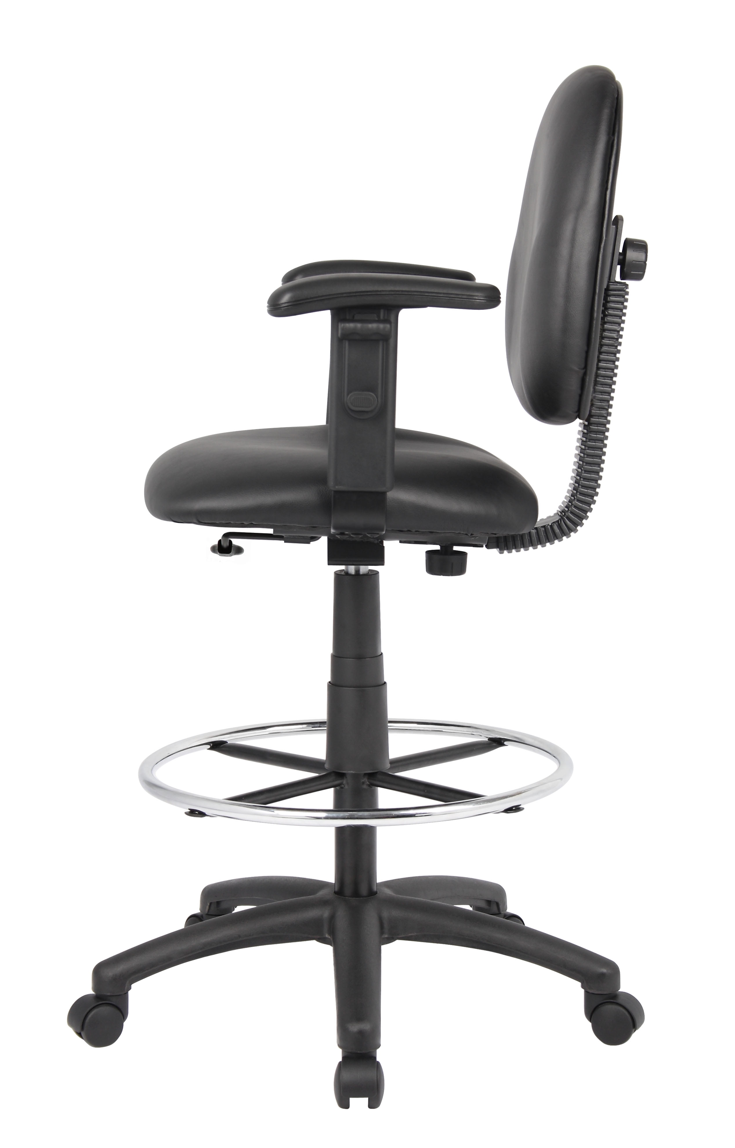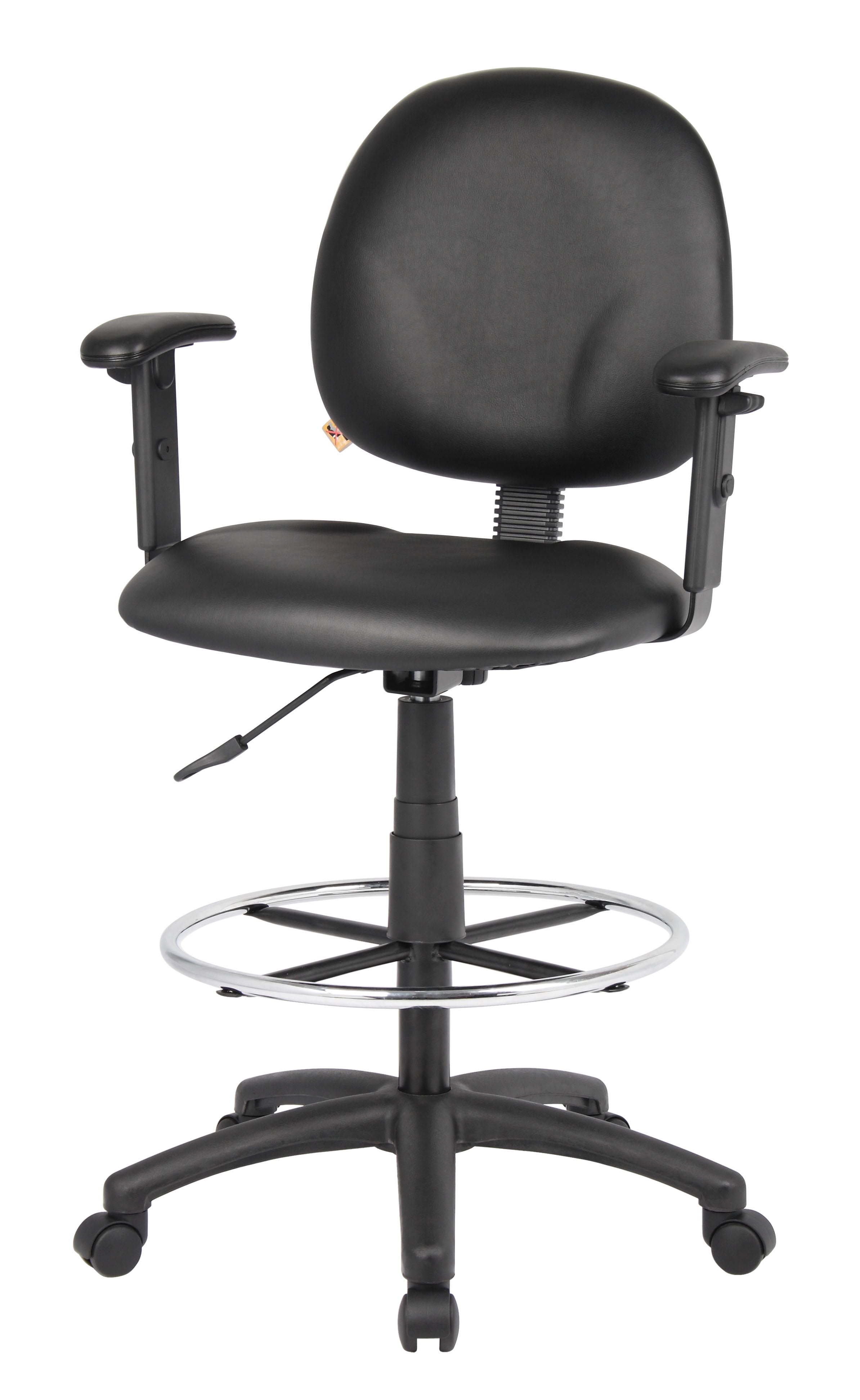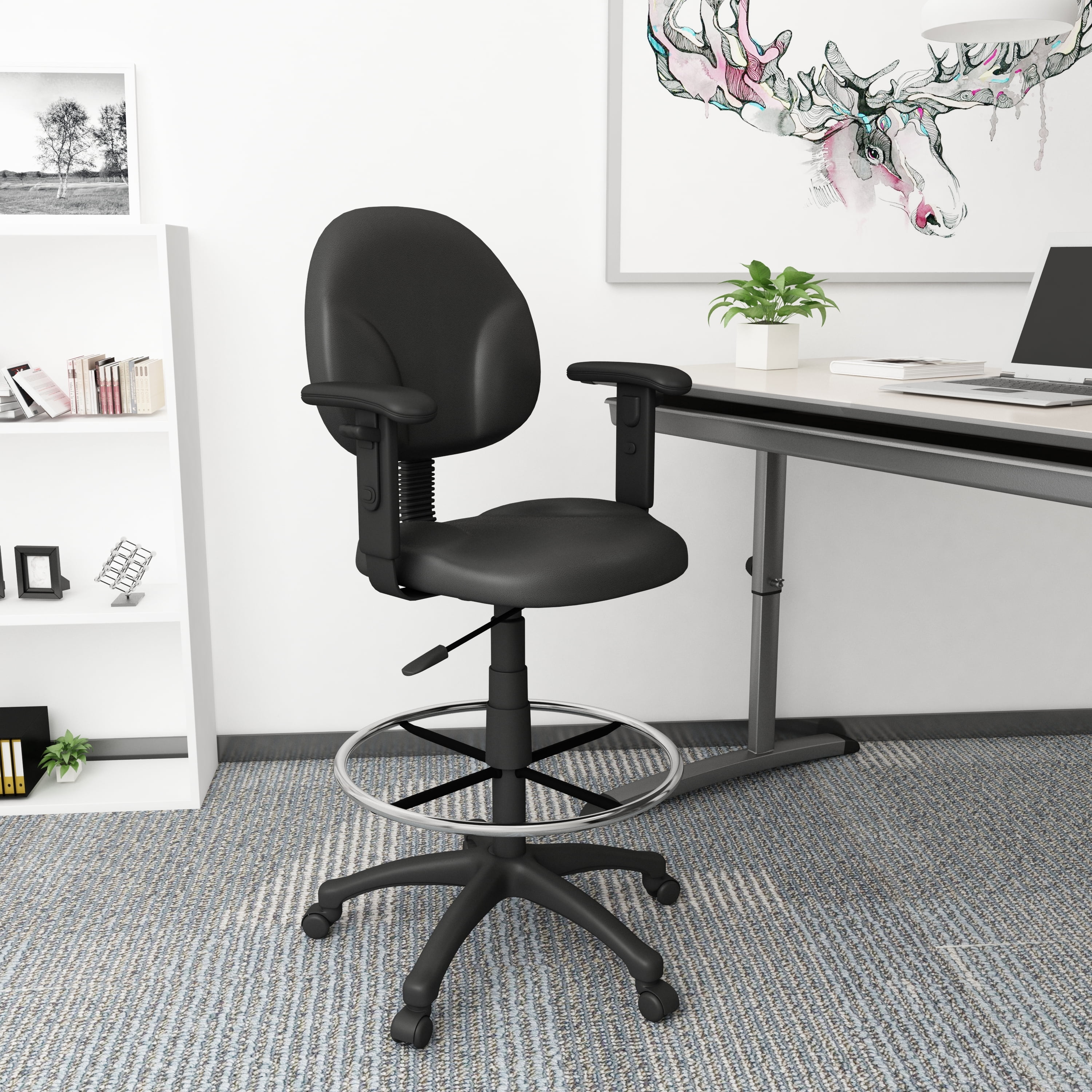 Equipped with a large 27″ nylon base for optimum stability, the Boss Black Caressoft Drafting Stools With Adjustable Arms & Footring by Boss Office Products offers a modern design that matches any workspace. The contoured back works to support the spine and hooded double-wheel casters make it a cinch to move the chair around the room as needed. There is a pneumatic gas lift for adjusting the height and arms to move into your desired position. The 20″ chrome foot ring also gives your feet a much-needed break. Users find this model in four fabric colors with the option to purchase model TU021 with gliders instead of casters. Features: Finish: Black Chair has contoured back and seat that provides support and helps relieve back strain Chair has extra large cushion seat and back Pneumatic seat height adjustment Heavy-duty nylon base for strength and durability Adjustable arm rests Assembly required Specifications: Product Dimensions: 41.5″ – 49.5″ H x 25″ W x 25″ D Product Weight: 42 lbs Seat Dimensions: 26.5″ – 31.5″ x 20″ W x 18″ D Weight Capacity: 250 lbs
