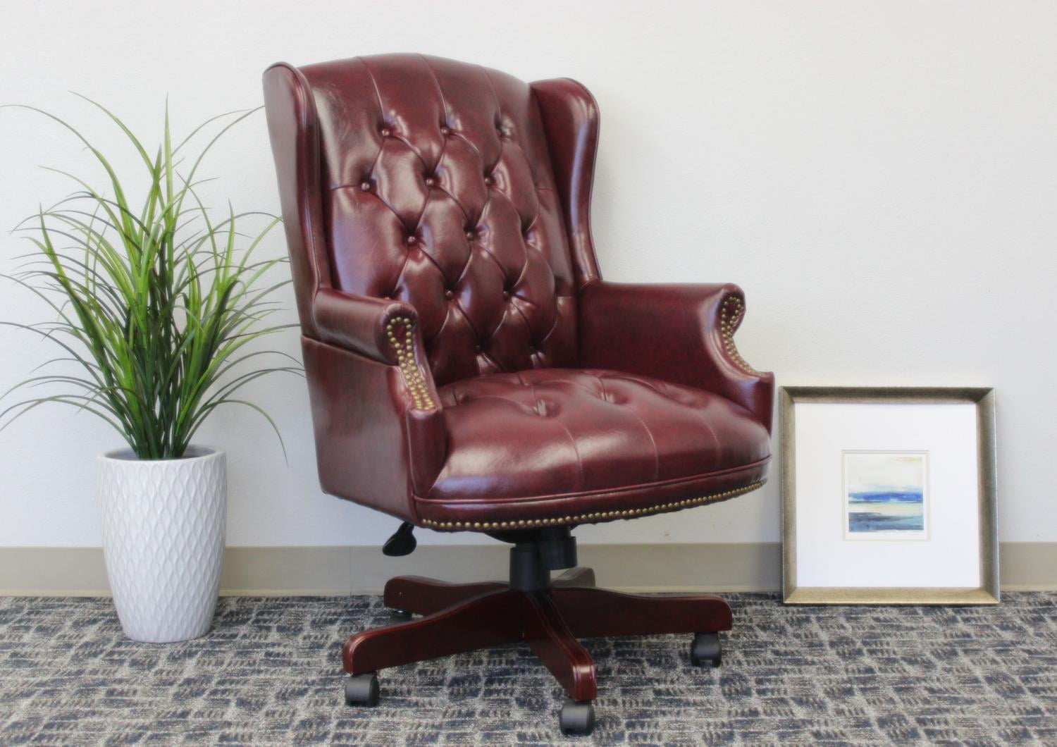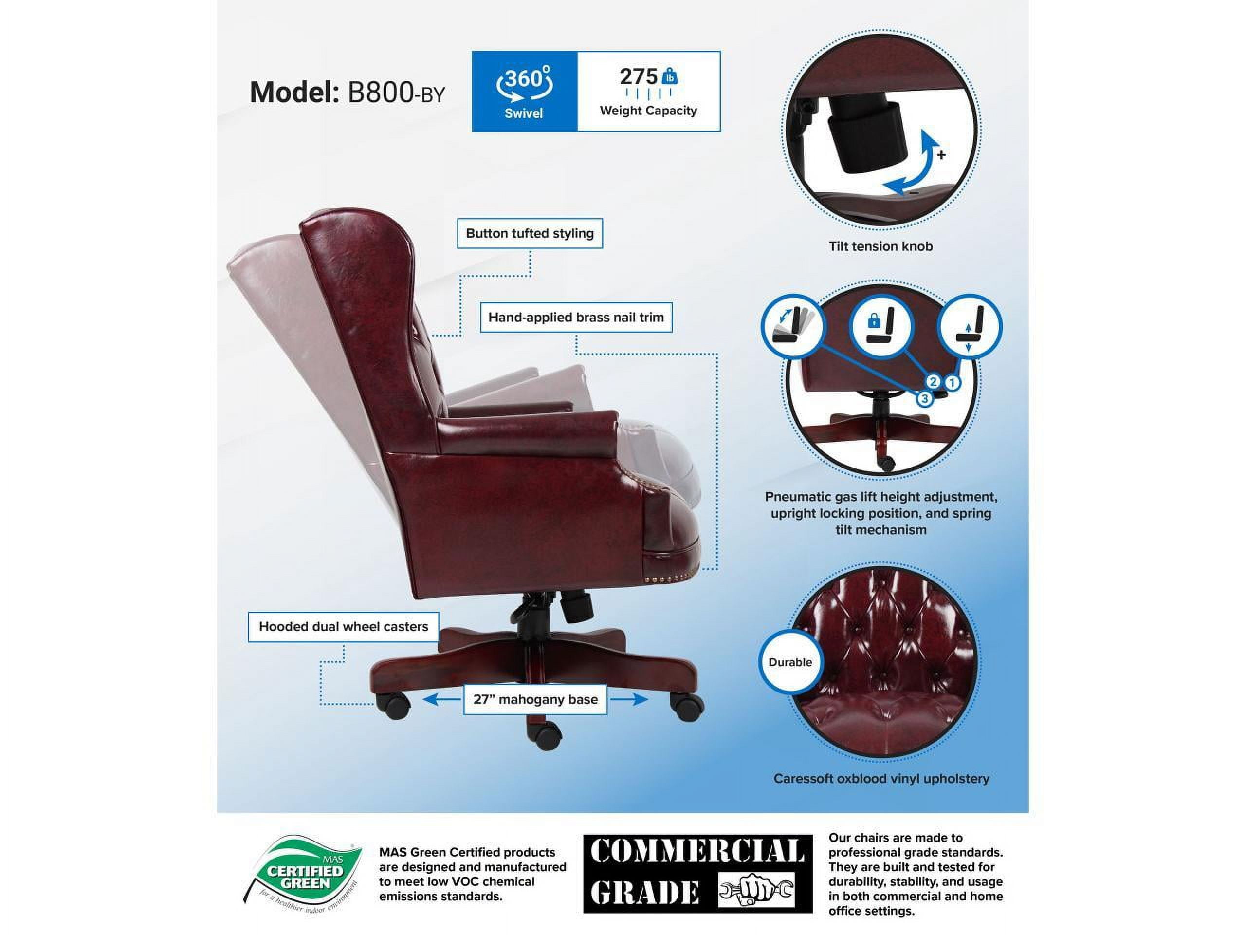 Caressoft™ Oxblood Vinyl Upholstery – Luxurious leather-like feel that’s soft, durable, and easy to maintain. Traditional Button Tufting – Classic design detail adds texture and timeless charm. Mahogany-Finished Wood Components – Rich wood tones elevate the chair’s elegance and presence. Hand-Applied Antique Brass Nail-Head Trim – Individually placed for a sophisticated, custom-crafted look. Pneumatic Gas Lift – Easily adjust seat height with a smooth one-touch lever. Adjustable Tilt Tension Control – Fine-tune the recline resistance to your ideal comfort level. Versatile Style – Perfect for home offices, studies, conference rooms, or executive suites. Classic Wingback Silhouette – Offers supportive posture with a distinguished visual appeal. MAS Certified Green for low VOC emissions Assembly required Overall dimensions: 30″W x 32″D x 41 – 44″H Seat height: 19″ – 22″ Seat size: 23″W x 20″D Arm height: 25 – 28″H Back size: 24.5″W X 31″H Weight capacity: 275 lbs.