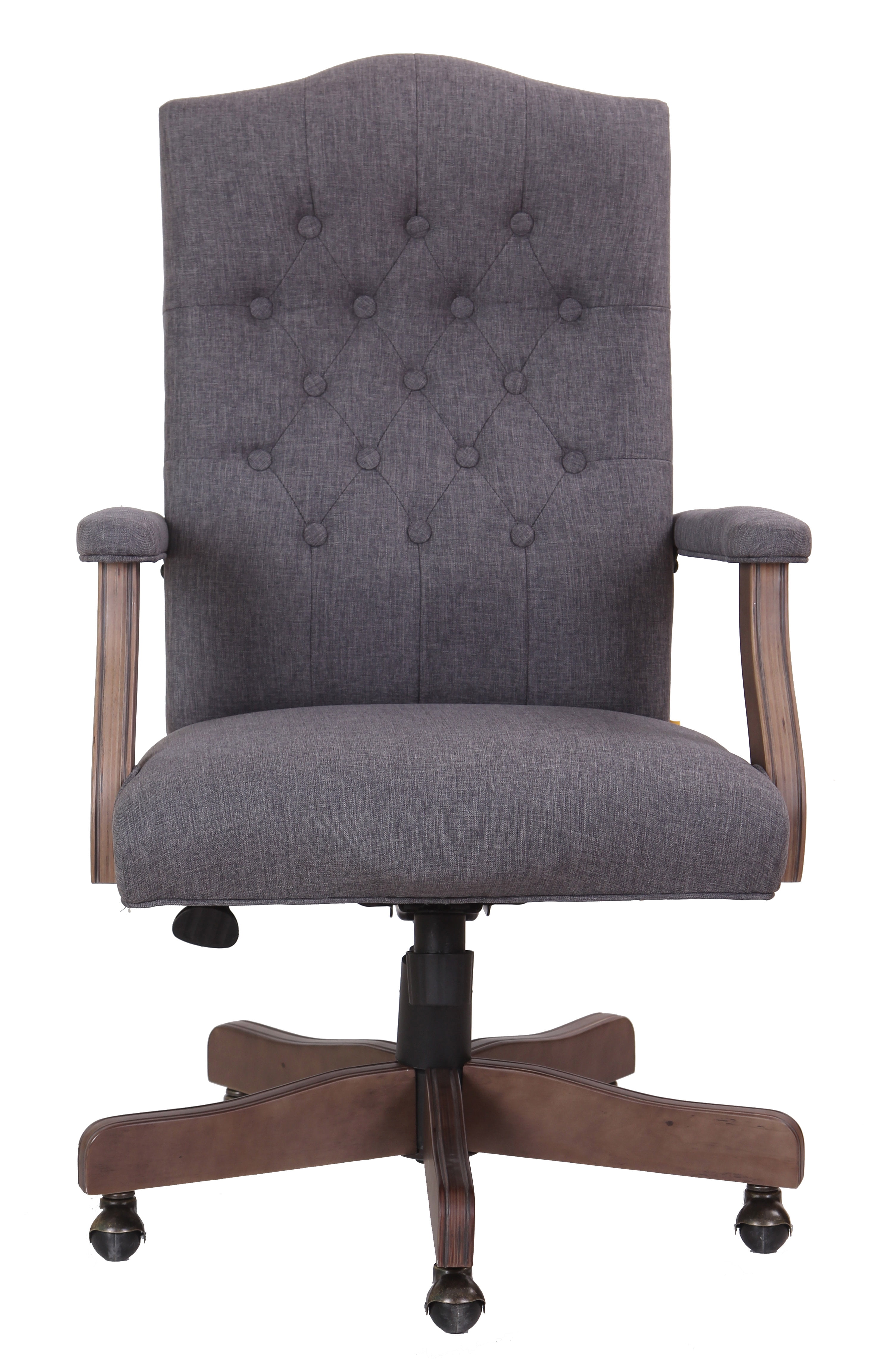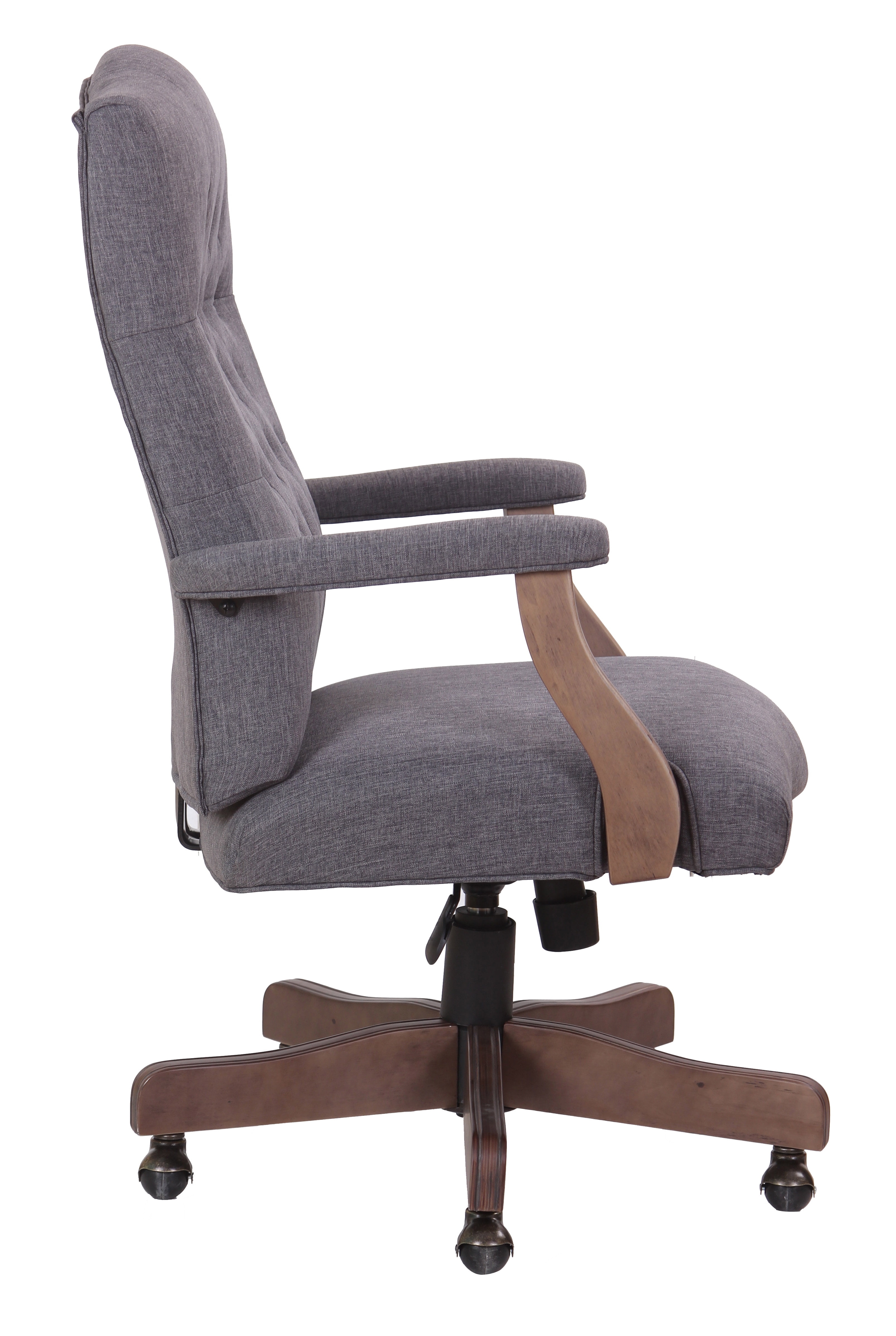 A classic executive chair design gets a modern face lift without sacrificing quality and comfort. The on-trend gray commercial grade linen upholstery and coordinating driftwood finish frame with antique brass finished caste make this high-back swivel office chair an obvious fit in your work place or home office. Adjust the height of the chair to accommodate your needs throughout the day. Crafted with a sturdy wood frame and featuring a wide base for durability, you can enjoy this chair at your desk for years to come. Features: Finish: Slate Gray Material: Commercial Grade Linen High-back with button-tufted styling Upholstered in Slate Gray commercial grade linen fabric Driftwood finish arms and base; Antique brass casters Tilt lock allows for upright locking position Seat height adjustment with pneumatic gas lift Adjustable tilt tension control to find your ease of recline Specifications: Product Dimensions: 43 – 47″ H x 27″ W x 28″ D Product Weight: 48 lbs Back Dimensions: 27.5″ H x 20″ W Seat Depth: 21″ Seat Width: 24″ Seat Height: 20 – 23″ H Arm Height: 27 – 31″ H