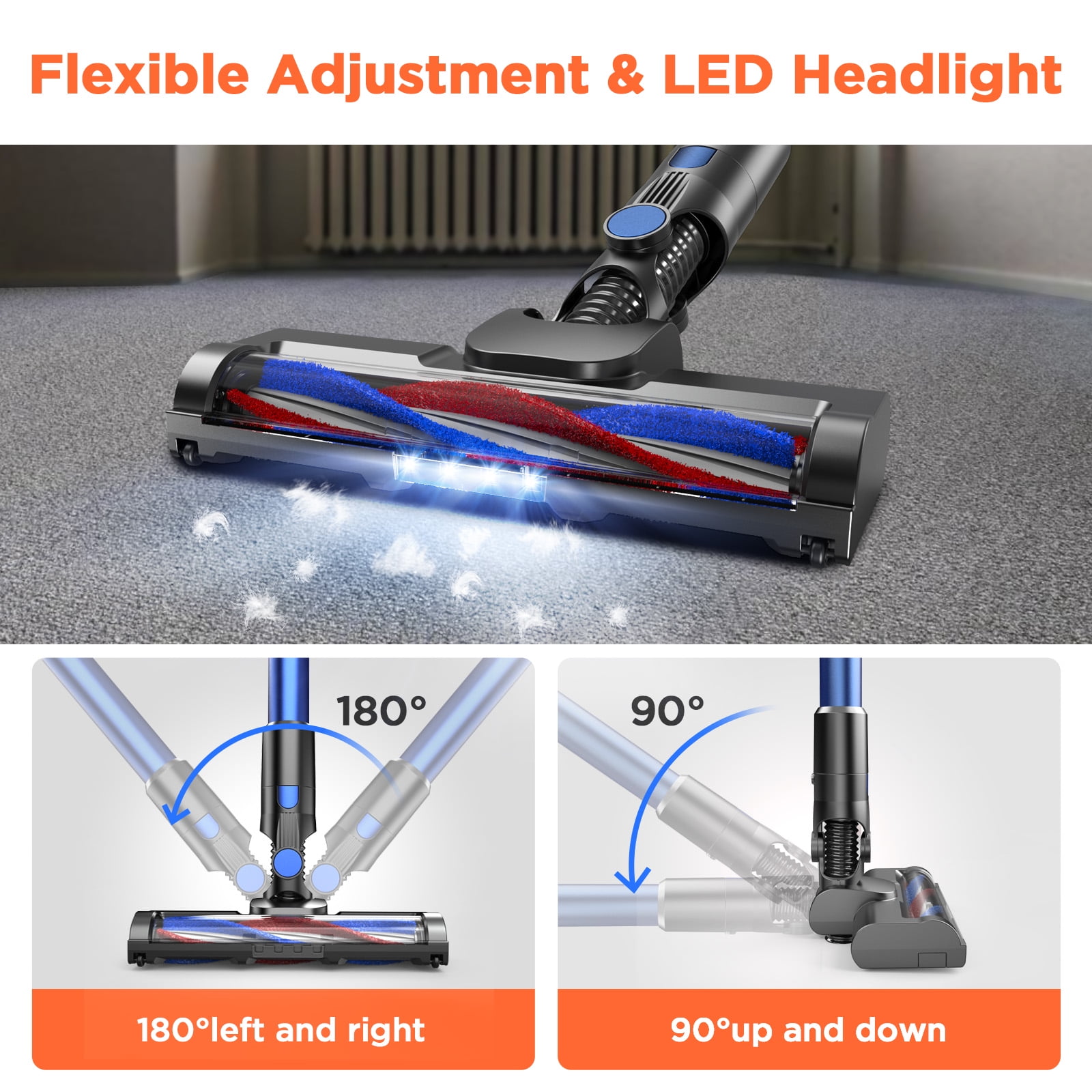 Powerful Suction Suction 150W Brushless Motor Newly Upgraded 2 in 1 Roller Brush 5 Stages High-Efficiency Filtration System 80,000 rpm/min 2024 Upgraded Brushless Super Long-lasting Battery Flexible LED Brush Head 4 Bright LED Lights 2 Charging Ways Detachable Separate Rechargeable Battery Up to 40Mins Runtime Two modes easy to switch Suitable for Hardwood floor 4 in 1 Handheld Vacuum Working Sound-level: ≤70 dB 0.8L Large Dust Cup Charging Time: 4-5 hours Cordless Vacuum Cleaner Cordless Vacuum 3 Year warranty