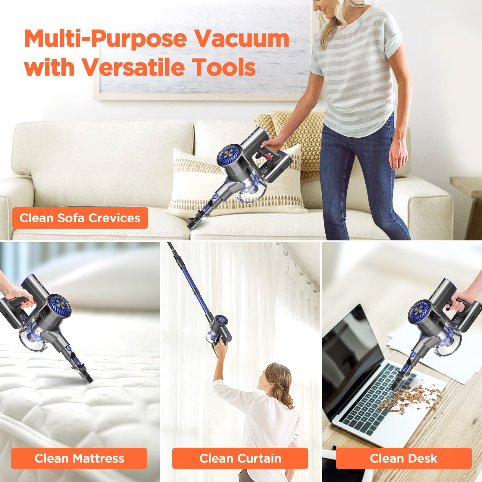 Bossdan Cordless Vacuum Cleaner offers a powerful suction with 150W advanced digital motor, effectively removing dirt and debris from various surfaces. With 2200mAh long-lasting battery providing over 35 minutes of runtime, clean large areas effortlessly. Bossdan cordless stick vacuum cleaner LED light ensure no dust is missed, even under furniture or in low light conditions, can easy tackle any cleaning task, from carpets to hard floors. Experience a new level of cleaning efficiency with our Hyper Power Suction Cordless Vacuum today! ✅ Hyper Power Suction — Outfitted with the advanced brushless motor, this cordless vacuum boasts a 25% more powerful suction, making stubborn dirt and dust removal effortless. ✅ Long-Lasting Runtime — With a high-capacity 2200 mAh battery, this cordless vacuum provides up to 35 minutes of continuous cleaning, allowing you to clean your entire home without interruption. ✅ 5-Stage Cyclone Filtration System — The advanced cyclone filtration system captures and separates dust and dirt from the air, ensuring that only fresh air is released back into your home. ✅ 4-in-1 Roller Brush — The versatile 4-in-1 roller brush works on various surfaces from hard floors to curtains and carpets without needing any brush replacement. Adjustable 180°swivel sideways and 90° up-down function easily clean in corners or hard-to-reach areas. ✅ Convenient & Noiseless Operation — This vacuum cleaner with super-light materials effectively reduces noise and offers a quiet cleaning experience. An ideal gift for family and friends who value cleanliness and tranquility at home. 【Warm Tip】: To ensure your vacuum maintains strong suction, please clean the filter regularly. Also, make sure the filter is completely dry before reinstalling it. 【Notes before using】: 1. Use the Original Adapter: Ensure you’re using the original adapter to avoid charging issues. 2. Check Connection Points: Inspect the charger and battery connection pins for any foreign objects or oxidation. Clean with a dry cloth if needed. 3. Monitor Indicator Lights: Look for a flashing red light, which indicates the machine is in protection mode. If you encounter any issues regarding battery life, please feel free to contact us, and we will to provide a solution.