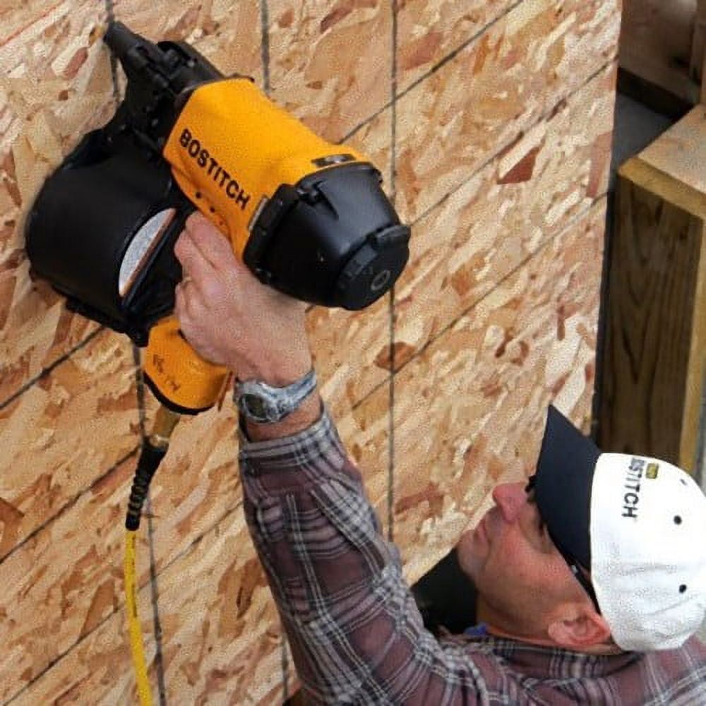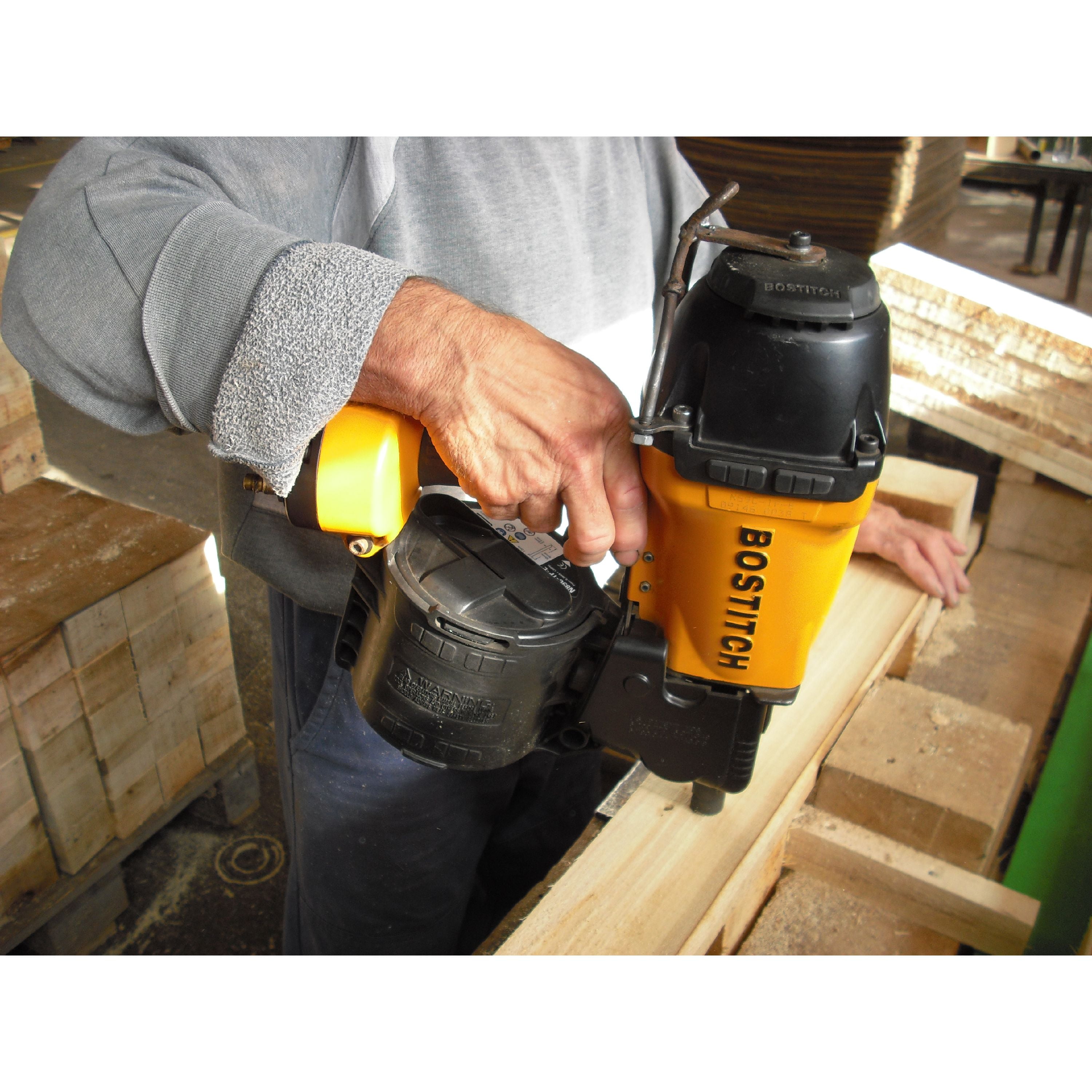 This Bostitch 15-degree coil framing nailer is lightweight and easy to manage. Adjust nails to your desired depth with the push of a button. Direct exhaust away from your face for convenience. Depend on this 15-degree coil framing nailer for high production. Brand Name: Bostitch Gauge: 15 Ga. Angle: 15 deg Product Type: Nailer Kit: Yes Minimum Recommended Operating Pressure: 70 psi Minimum Fastener Size: 2 in. Compatible Fasteners: Round Head Weight: 8.1 lb Maximum Recommended Operating Pressure: 120 psi Magazine Capacity: 300 Loading Type: Bottom Maximum Fastener Size: 3-1/2 in. Fastener Type: Coil Collation Type: Wire Weld Lightweight magnesium design for added durability Driving power to tackle tough engineered lumber applications Patented push button adjustable depth guide sets nail to desired depths quickly and conveniently Coil magazine holds up to 300 nails for high production applications Drives 15 degree Coil Framing Nails Perfect for sheathing, siding, trusses, engineered lumber, exterior decks and fencing applications Pneumatic