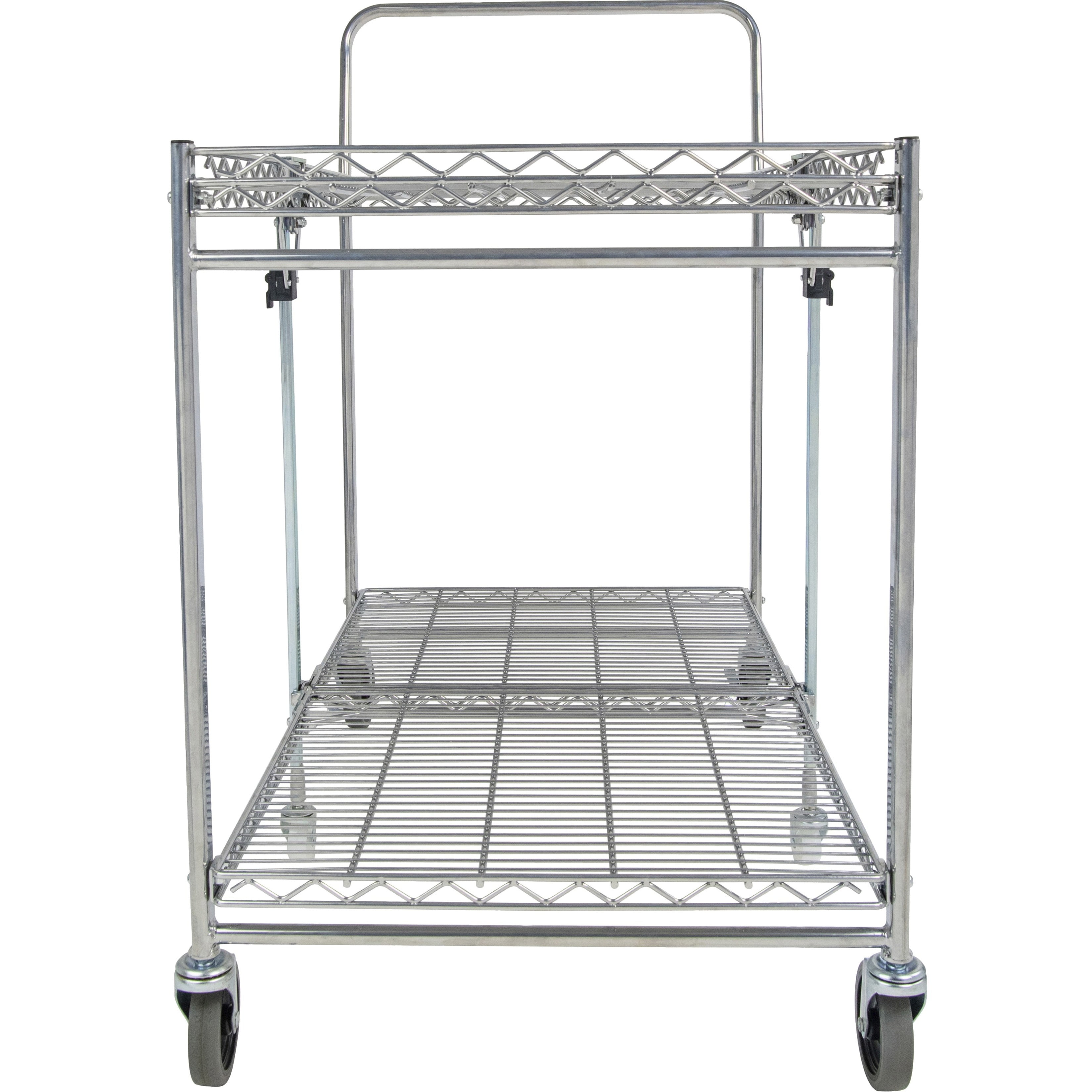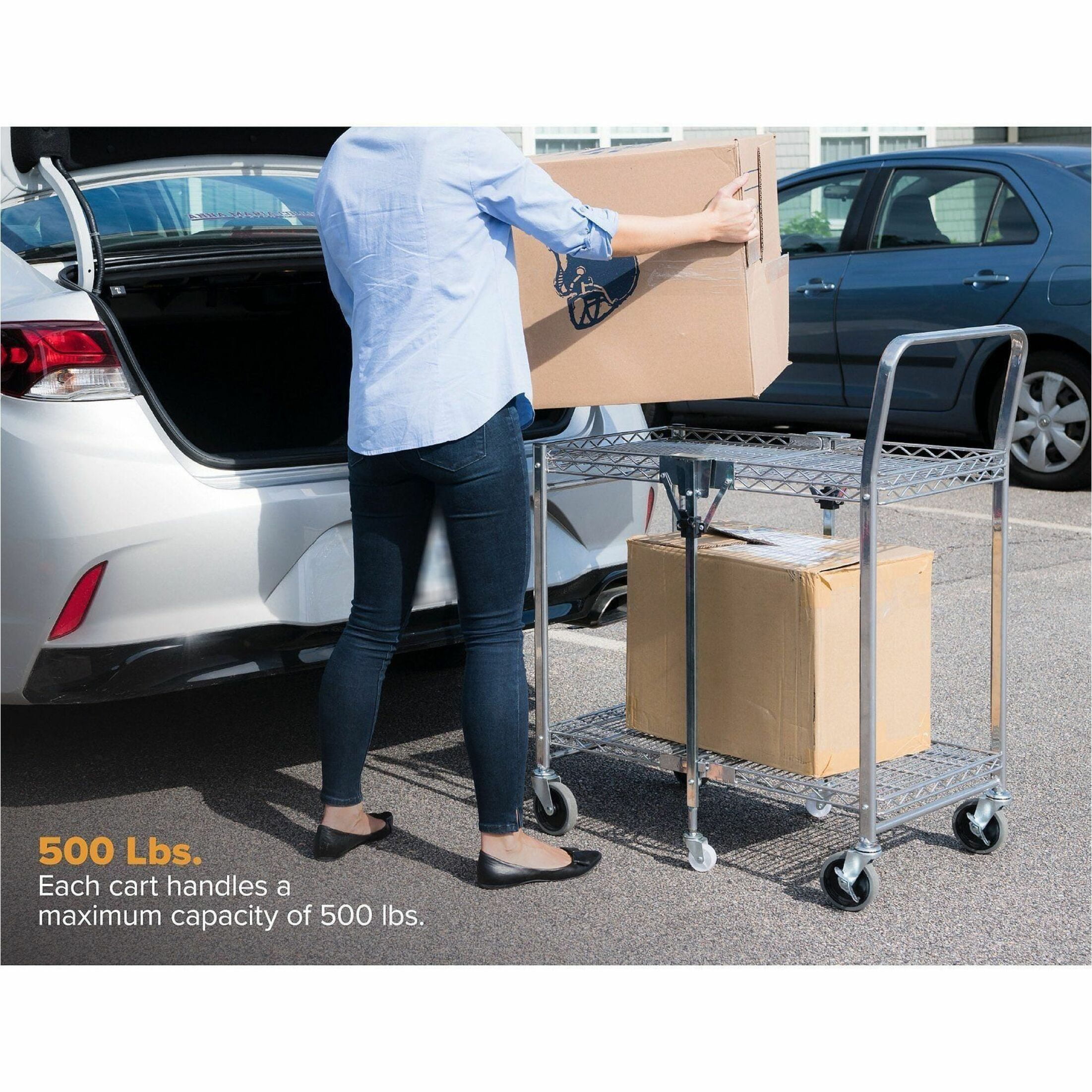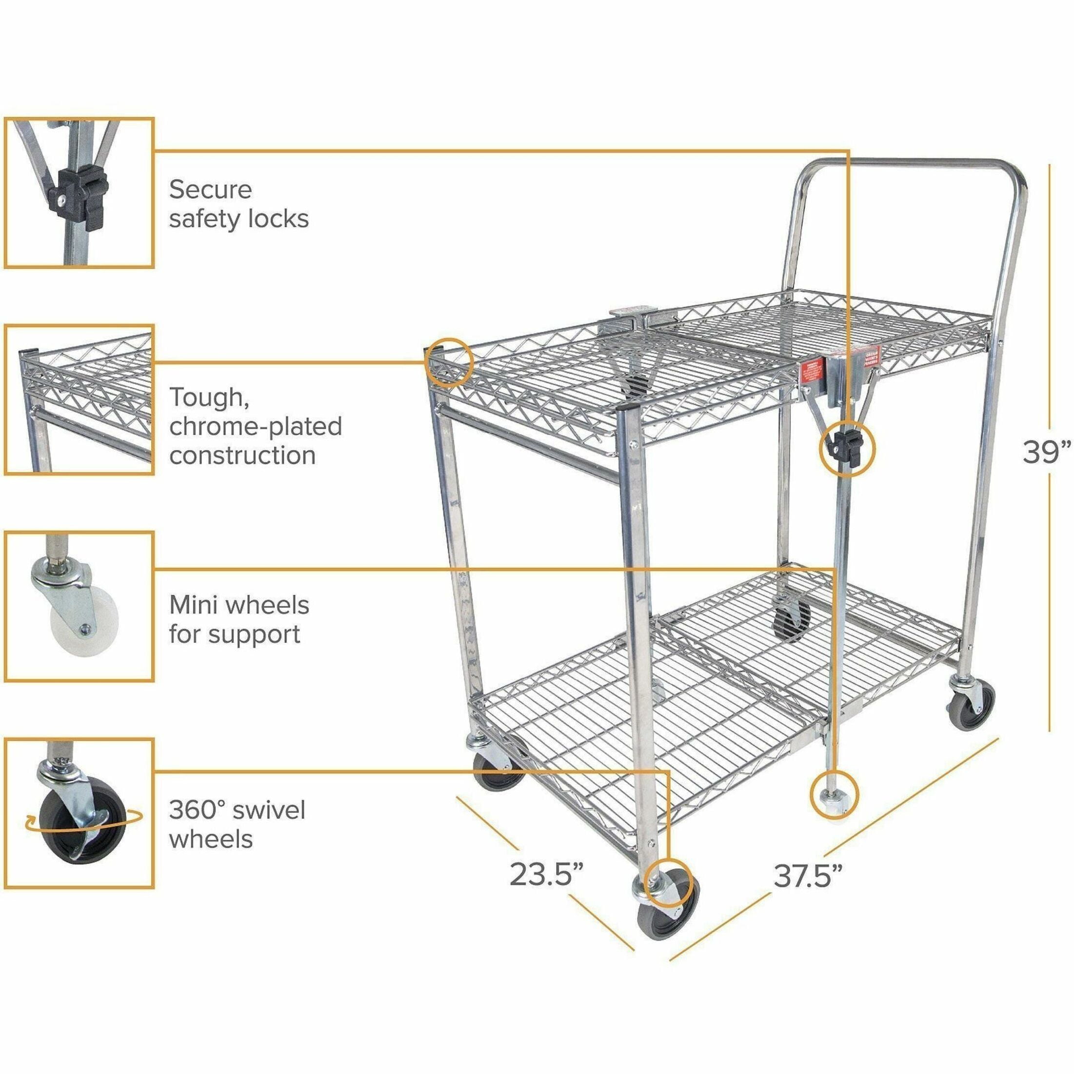 Ideal for use in retail stores, offices, garages, hospitals and more Patented folding design takes up 4x less space Handles a maximum capacity of 500 lbs. Dual shelves provide 1300+ square inches of storage space Double chrome coated construction for ultimate durability