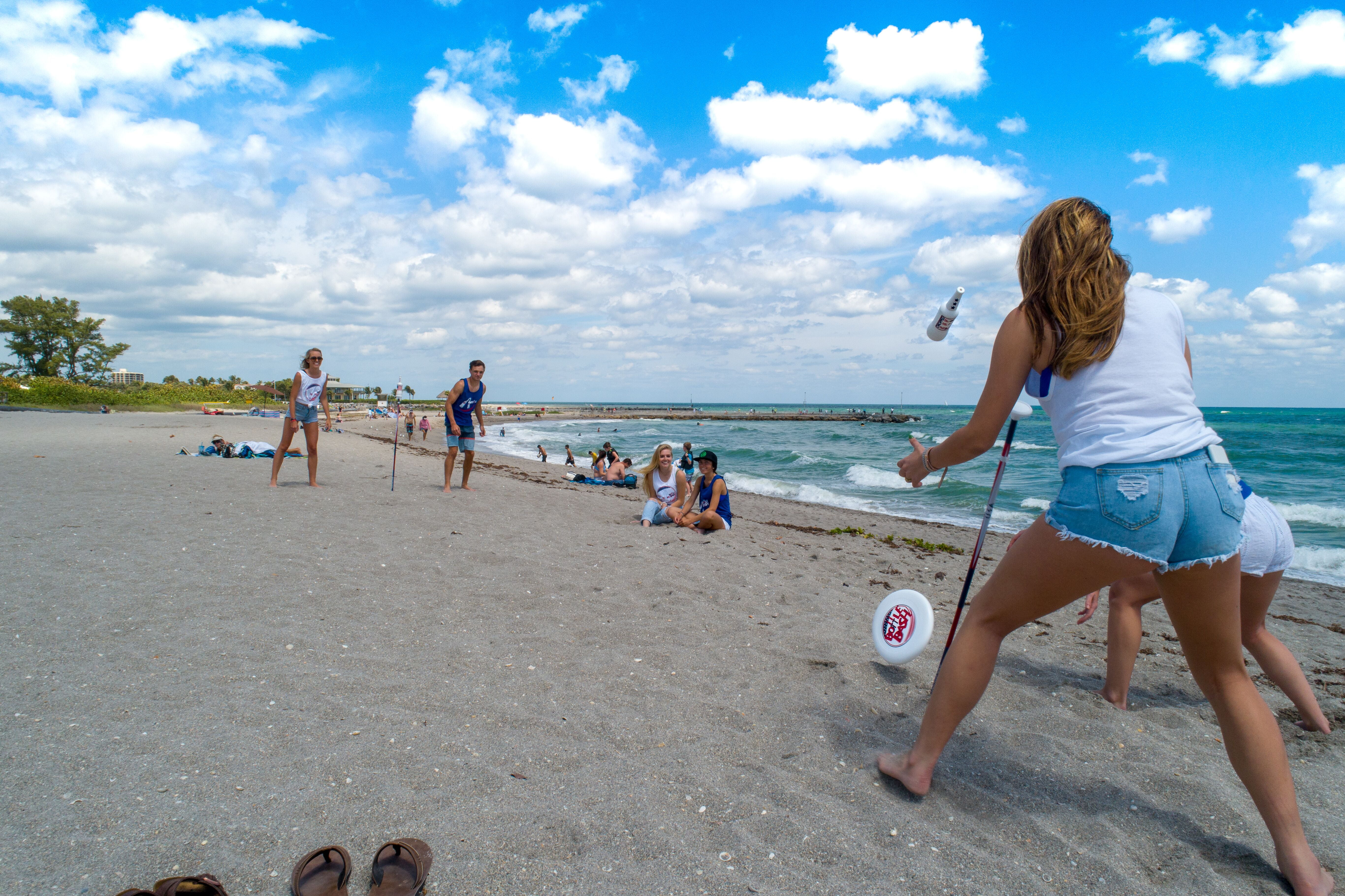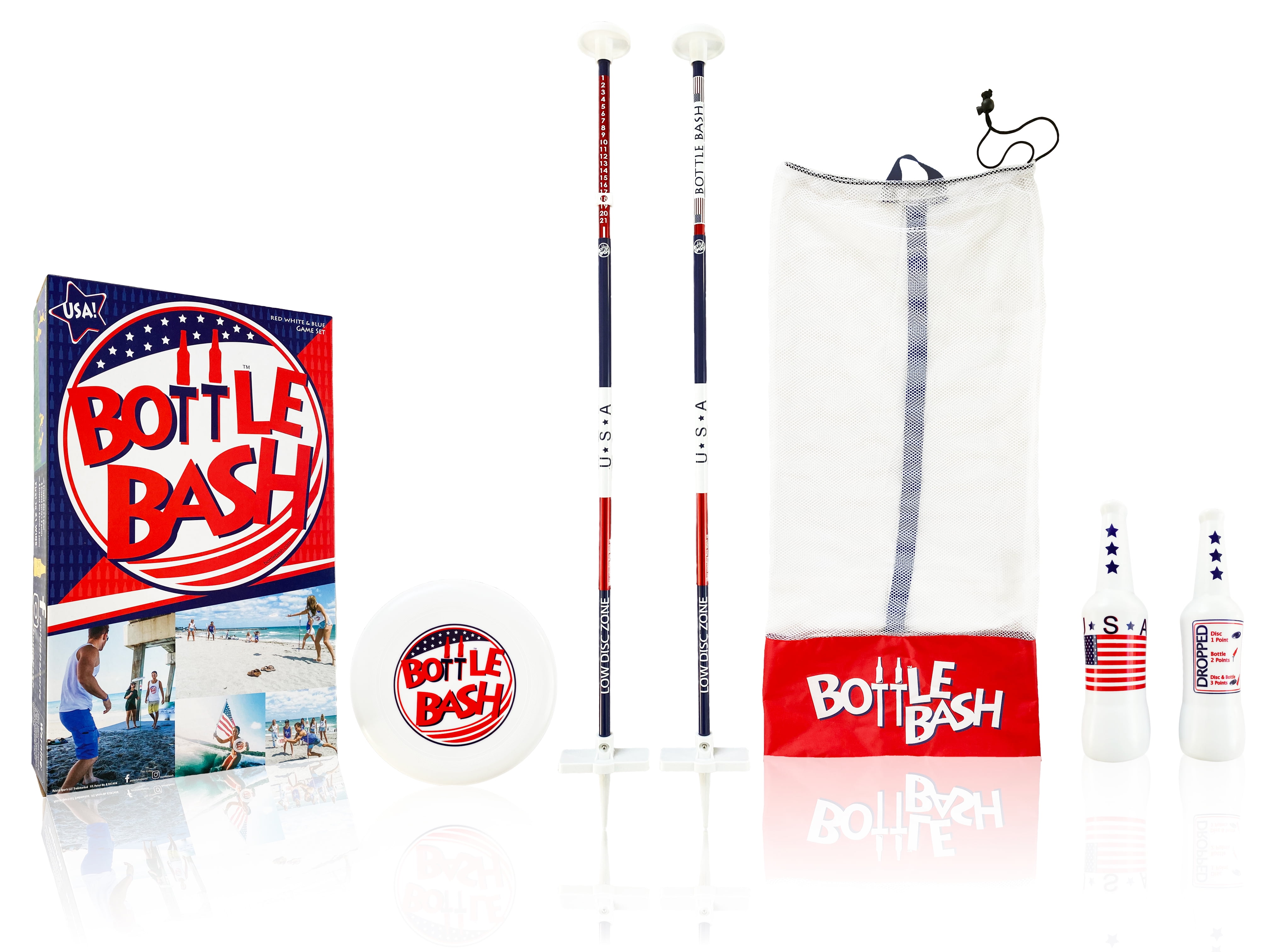 Built to Last, Tournament Style Components, Designed to Play Anywhere Bottle Bash game set designed with countless engineering hours, the most rugged plastics and the highest quality aluminum poles available. Game set includes the following: Game set completely designed with patriotic USA Red, White, and Blue artwork (2) Non-breakable life like bottles that weigh over 6 ounces (2) Adjustable auluminum poles for use on sand, in the water or grass that will not rust or break under game play (2) Built in scoring systems on the poles for convenient game scorekeeping (2) Detachable ground spikes that allow ultimate flexibilty on inserting the poles into a variety of soft surfaces (2) Detachable pole caps that provide the perfect bottle placement on top of the pole (1) High quality tournament style flying disc that weighs 175 grams at 10.5 inches in diameter (1) Convenient mesh carrying bag to store and transport your game along with your essentials