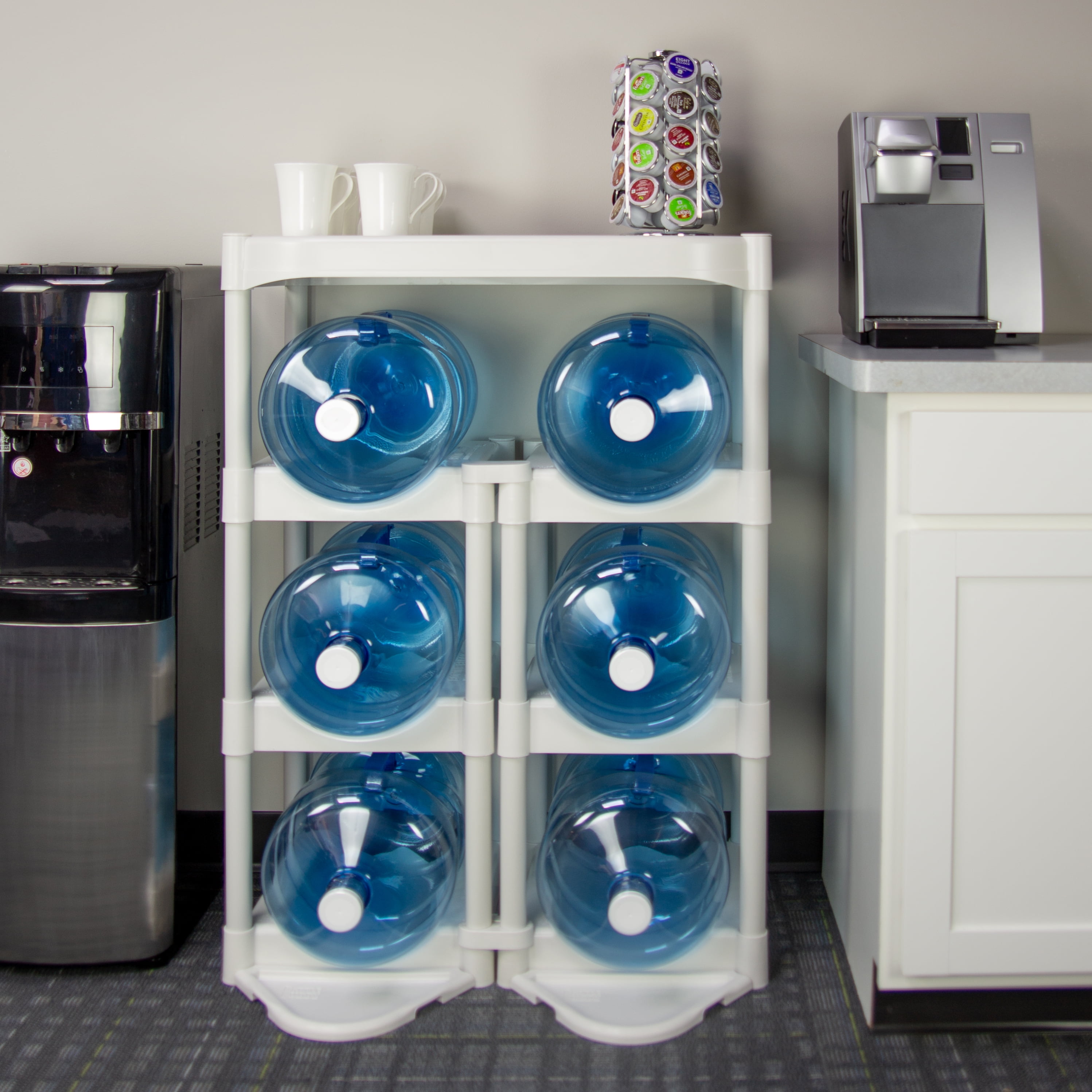 Holds 3 or 5-gal water bottles Holds up to 6 water bottles – Bottles are not included Each tray holds 50 lbs. Heavy Duty shelf holds 80 lbs. Perfect for the office or the home All plastic products will never chip, rust, peel, or corrode Floor Protector keeps floors dry Durable construction Easy to assemble, no tools required