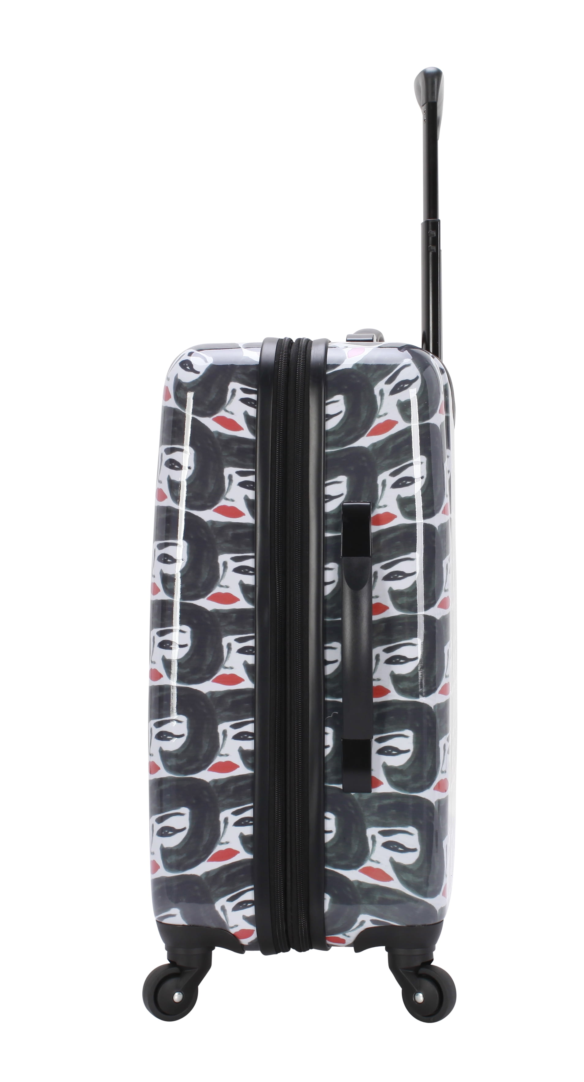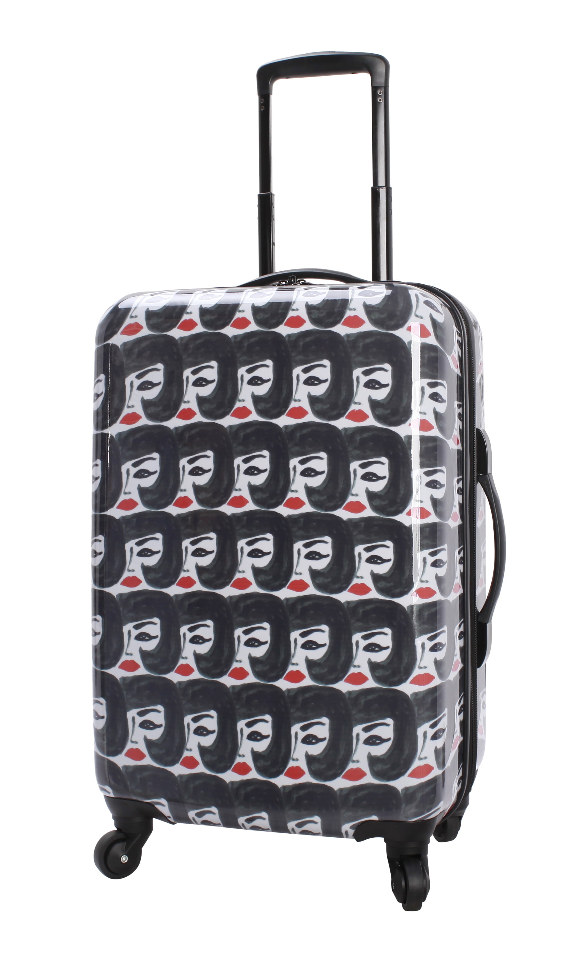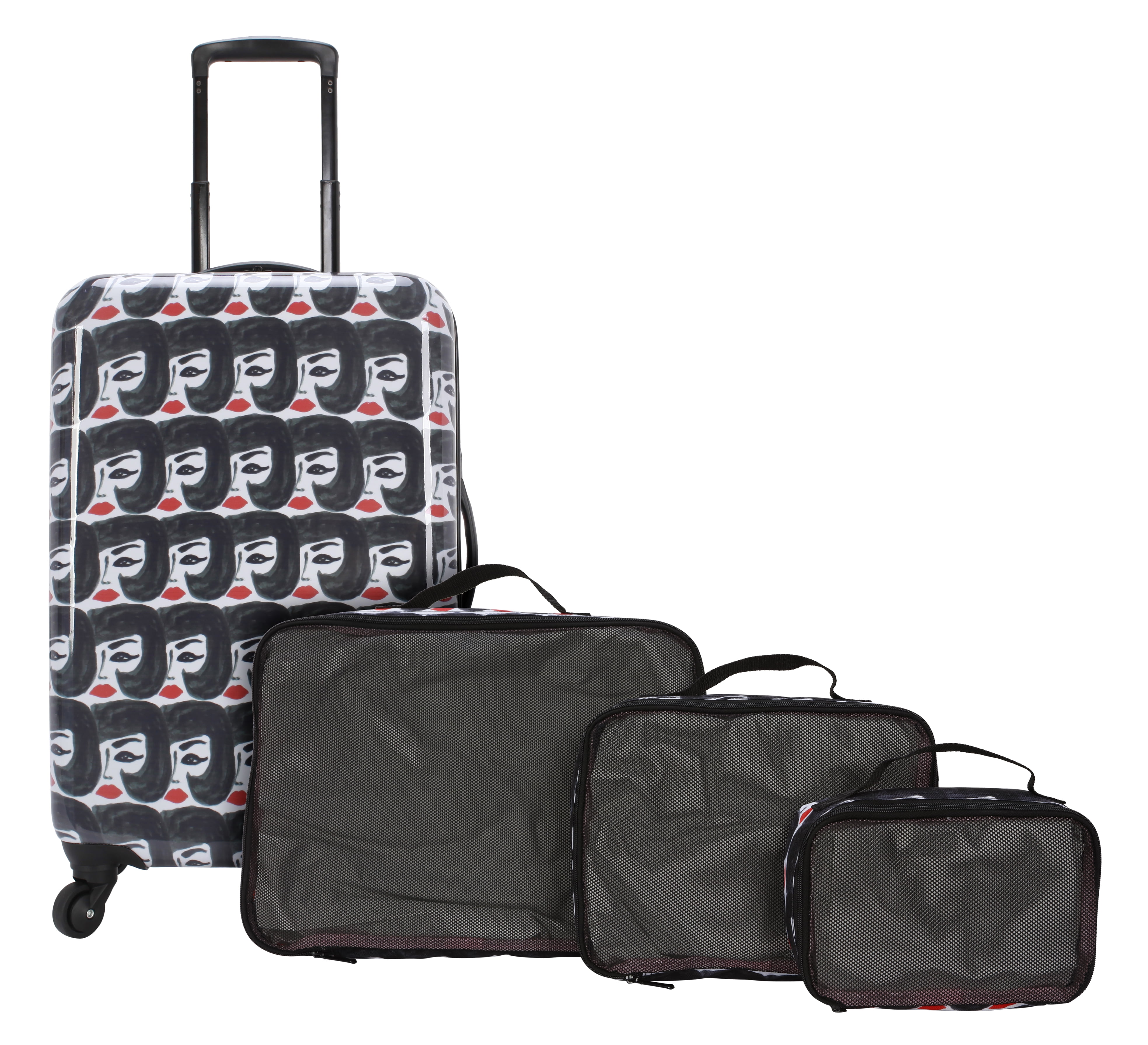 Bouffant & Broken Hearts Carry-on luggage set in Party Mix Print 6-piece set includes: 21″ Hardside luggage, coordinating 18″ backpack, 16.50″ duffel and matching 3 sizes in packing cubes The backpack includes 2 zippered outside pockets, 2 mesh side pocket and an inside laptop sleeve. The duffel includes a trolley sleeve and inside pocket Carry-on luggage has an inside zippered compartment, along with 2 compression straps, 4 – 360 spinner wheels for easy transport, a telescopic handle, top carry handle and a side handle Weekender has 2 top carry handles, an adjustable shoulder strap and an inside zippered pocket Dimensions for each: 21″ Hardside carry-on luggage 10″ L x 14.6″ W x 23″H with wheels, Weekender duffel 9″ L x 26″ W x 16″ H, Backpack 5.50″ L x 13.50″ W x 18″ H, packing cubes (3 pc set) Large 2.50″ L x 18″ W x 11″ H, Medium 2.50″ L x 13″ W x 9″ H, Small 2.50″ L x 10″ W x 6″ H