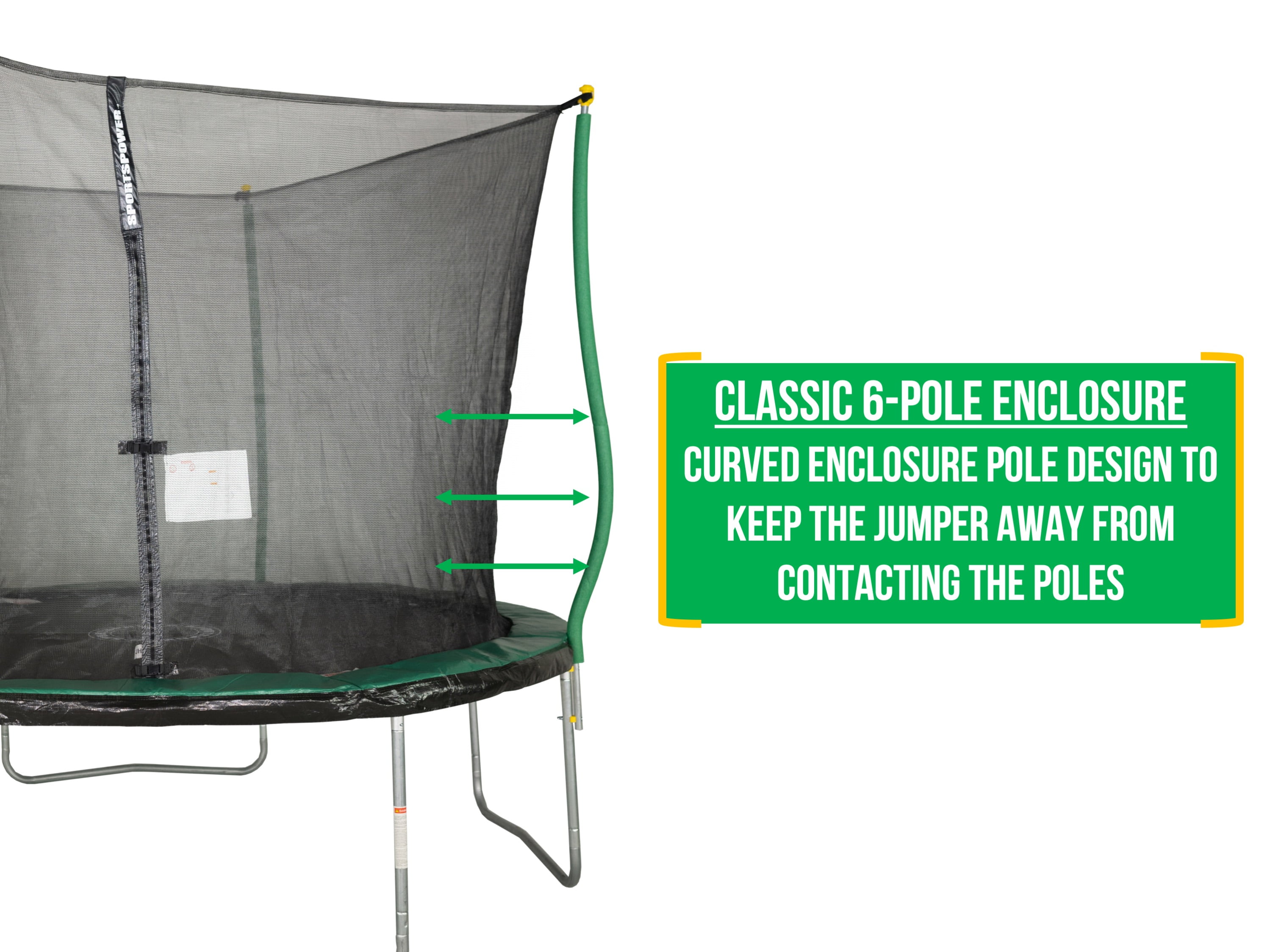Bounce Pro 10′ Trampoline, Flash Light Zone, Classic Safety Enclosure Rust-resistant galvanized steel frame The TenCate Permatron® jump mat withstands over 5000 hours of UV testing UV-resistant polyethylene enclosure netting to prevent falling out 6 padded poles deliver a sturdy enclosure frame Padded spring cover adds additional safety and helps prevent contact with springs Patented double welded plates leg weld to reinforce joints and prevent bending/breaking Steel ‘U-leg’ design for stability Spring loading tool included Impact Activated Flash Light Zone Dimension: Length 10 Ft / 304.8 cm Height 6.01 Ft / 183 cm