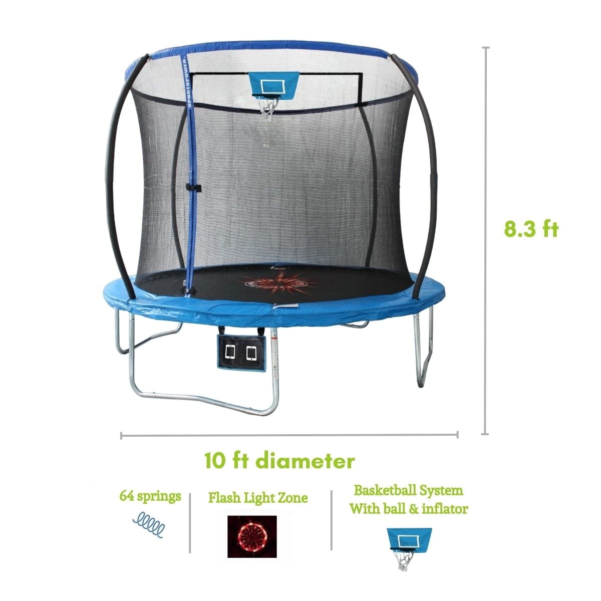 10ft Diameter which is perfect size for smaller yards and younger kids. Great for outdoor fun. Heavy Duty, rust resistant galvanized steel frame to provide long-lasting, safe play Patented SteelFlex Safety Enclosure provides extra safety and better aesthetics Jump Mat & enclosure netting tested to 2x the industry standard for UV resistance, to ensure durability Play features include a fabric basketball backboard, flash light zone (batteries required, not included) and a phone safety pouch