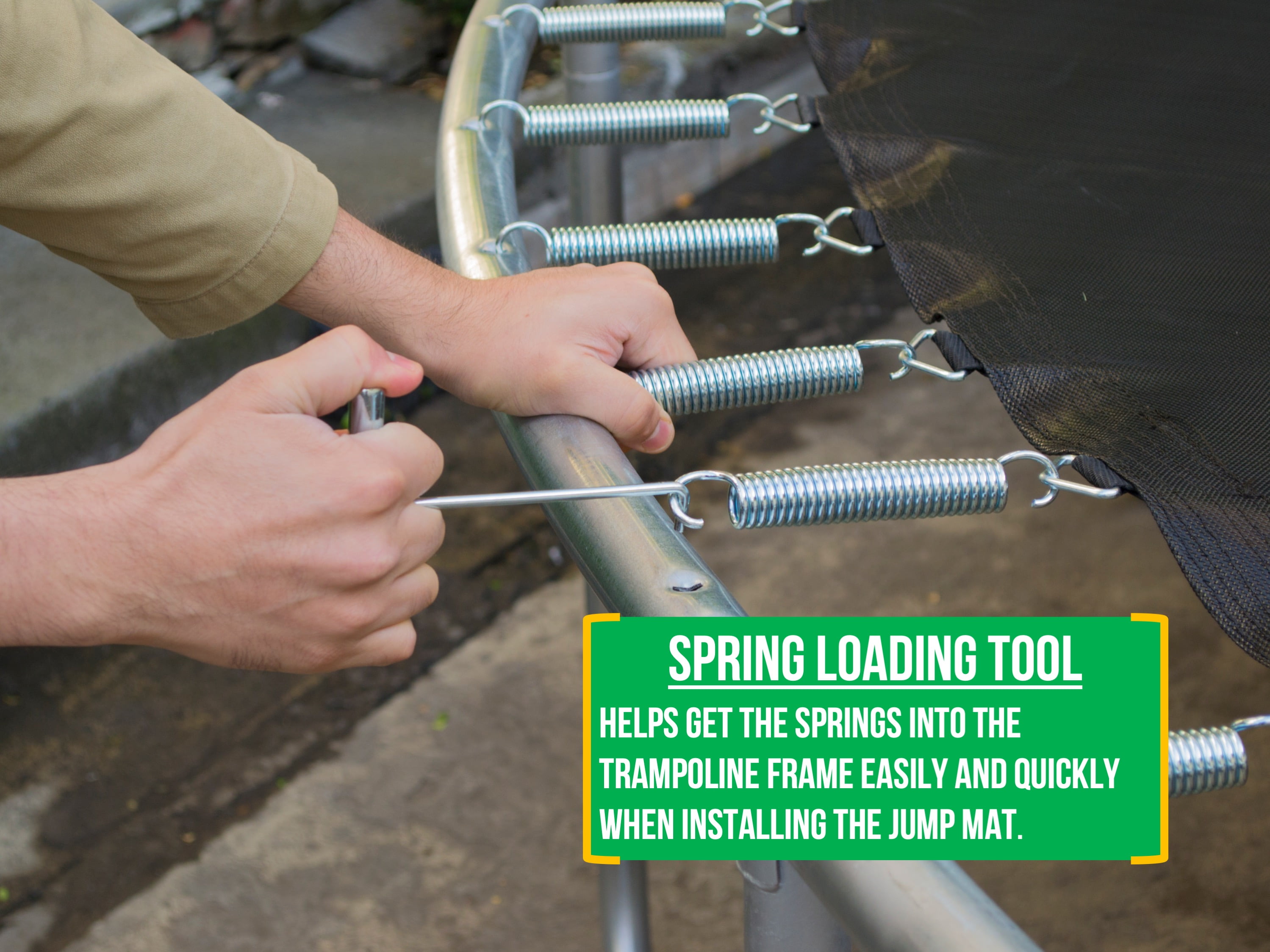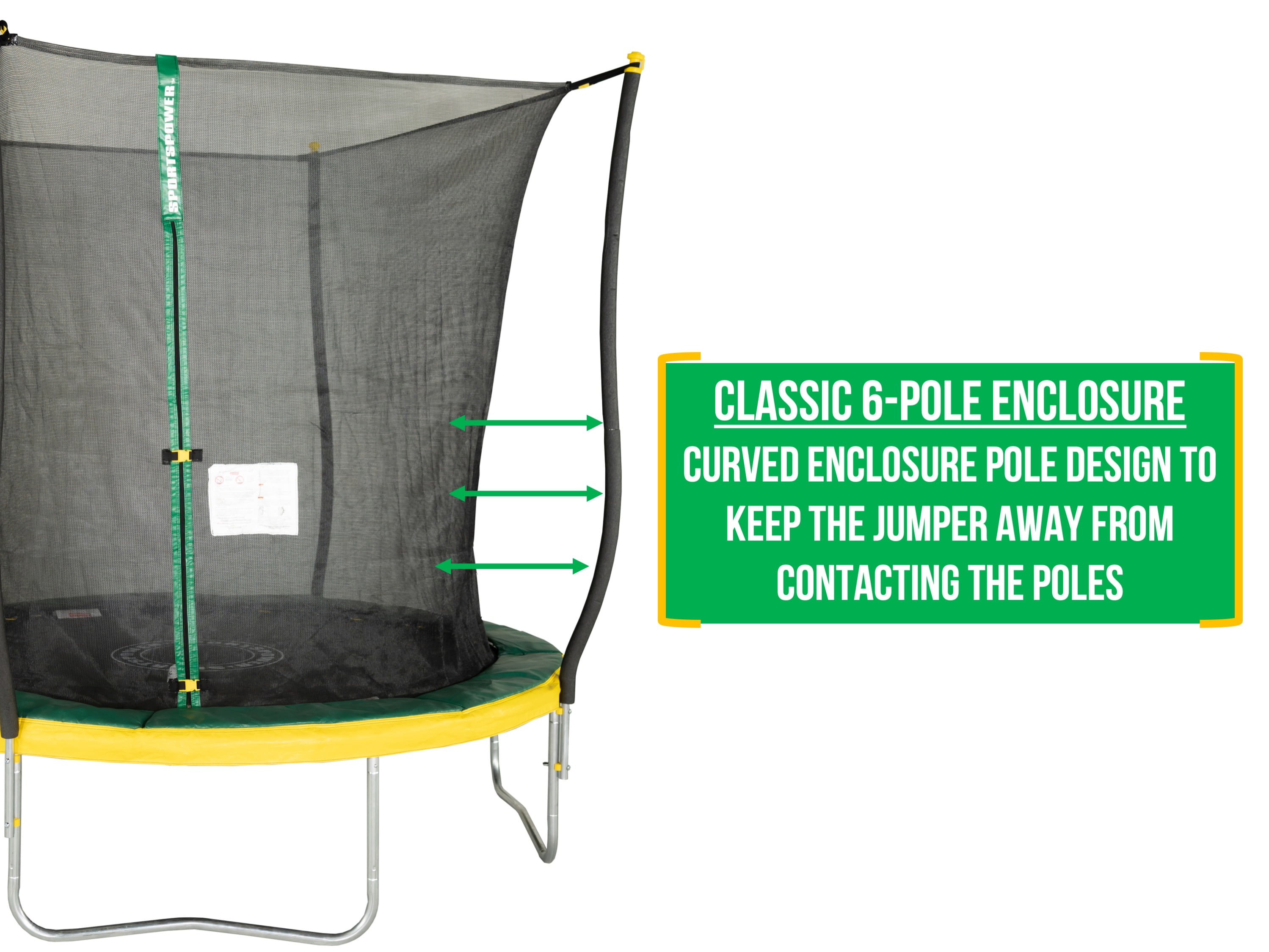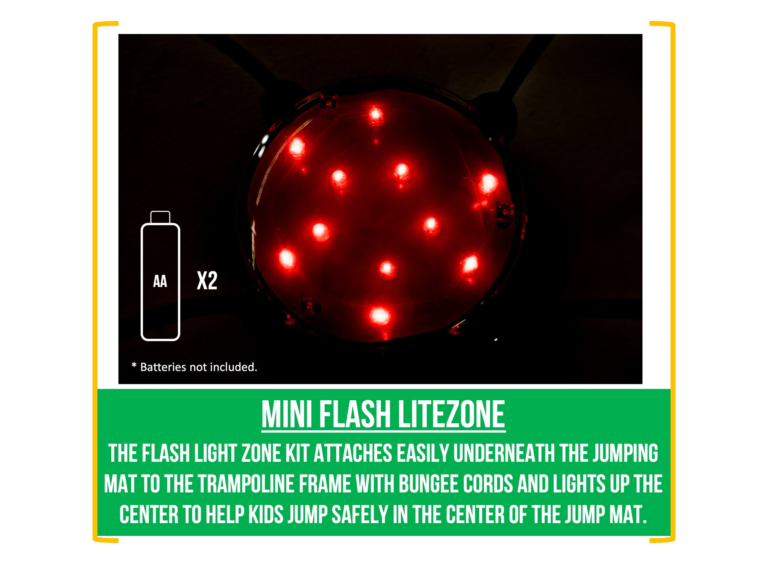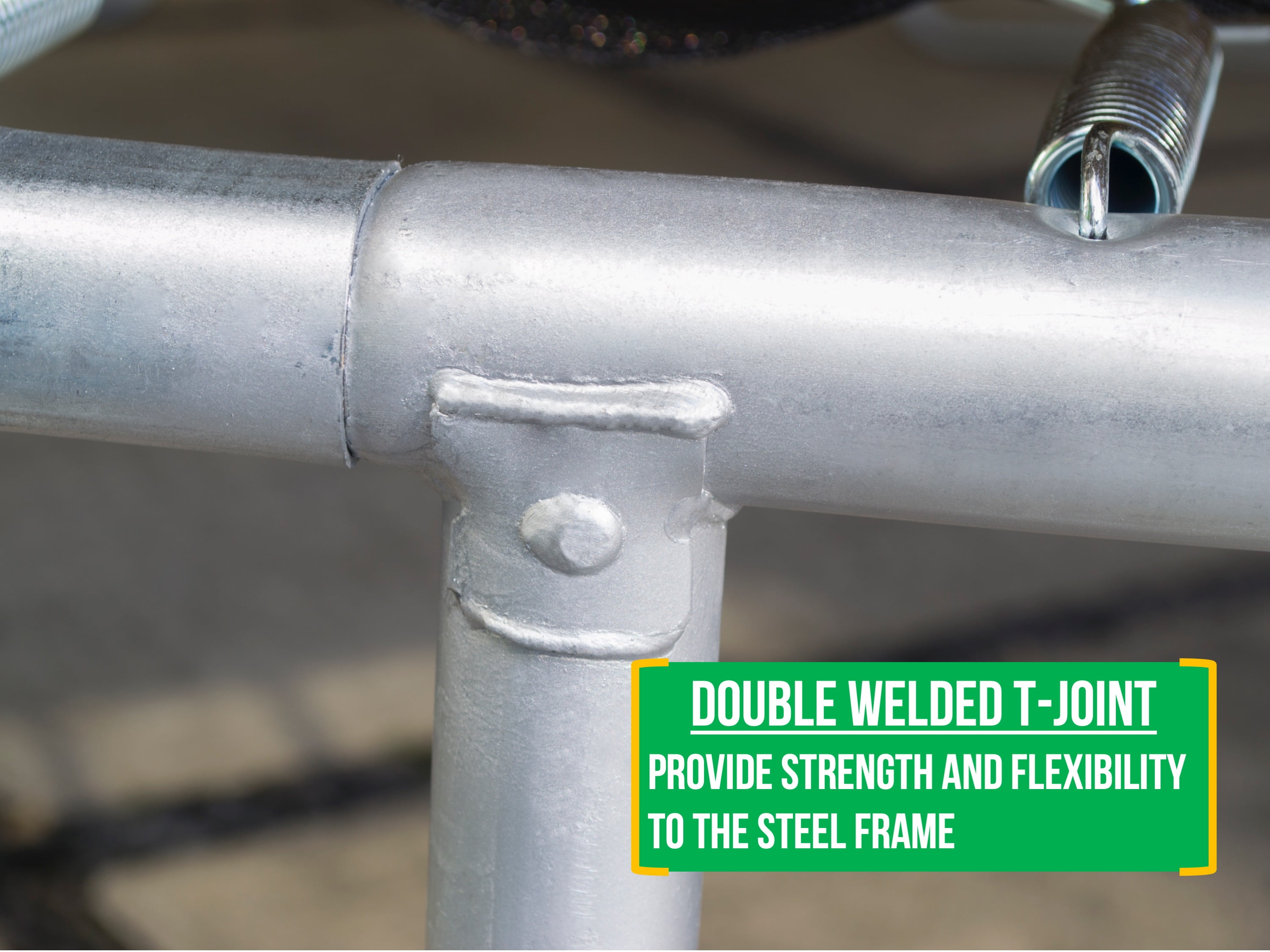 Rust-resistant galvanized steel frame USA engineered TenCate Permatron – jump mat withstands over 5000 hours of UV testing UV-resistant polyethylene enclosure netting to prevent falling out 6 padded poles deliver a sturdy enclosure frame Padded spring cover adds additional safety and helps prevent contact with springs Patented double welded plates leg weld to reinforce joints and prevent bending/breaking Steel, U-leg- design for stability Spring loading tool included Mini Flash Litezone