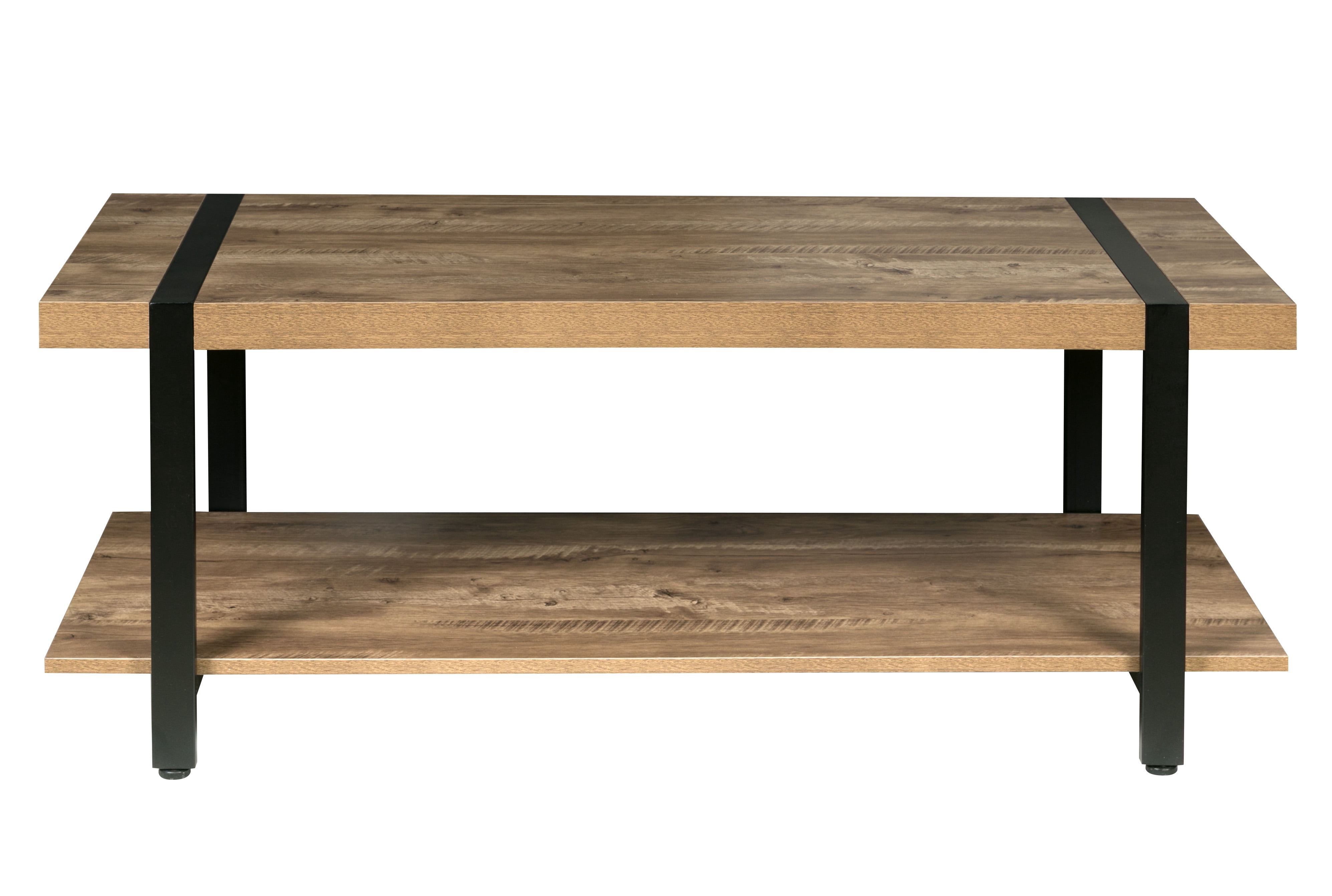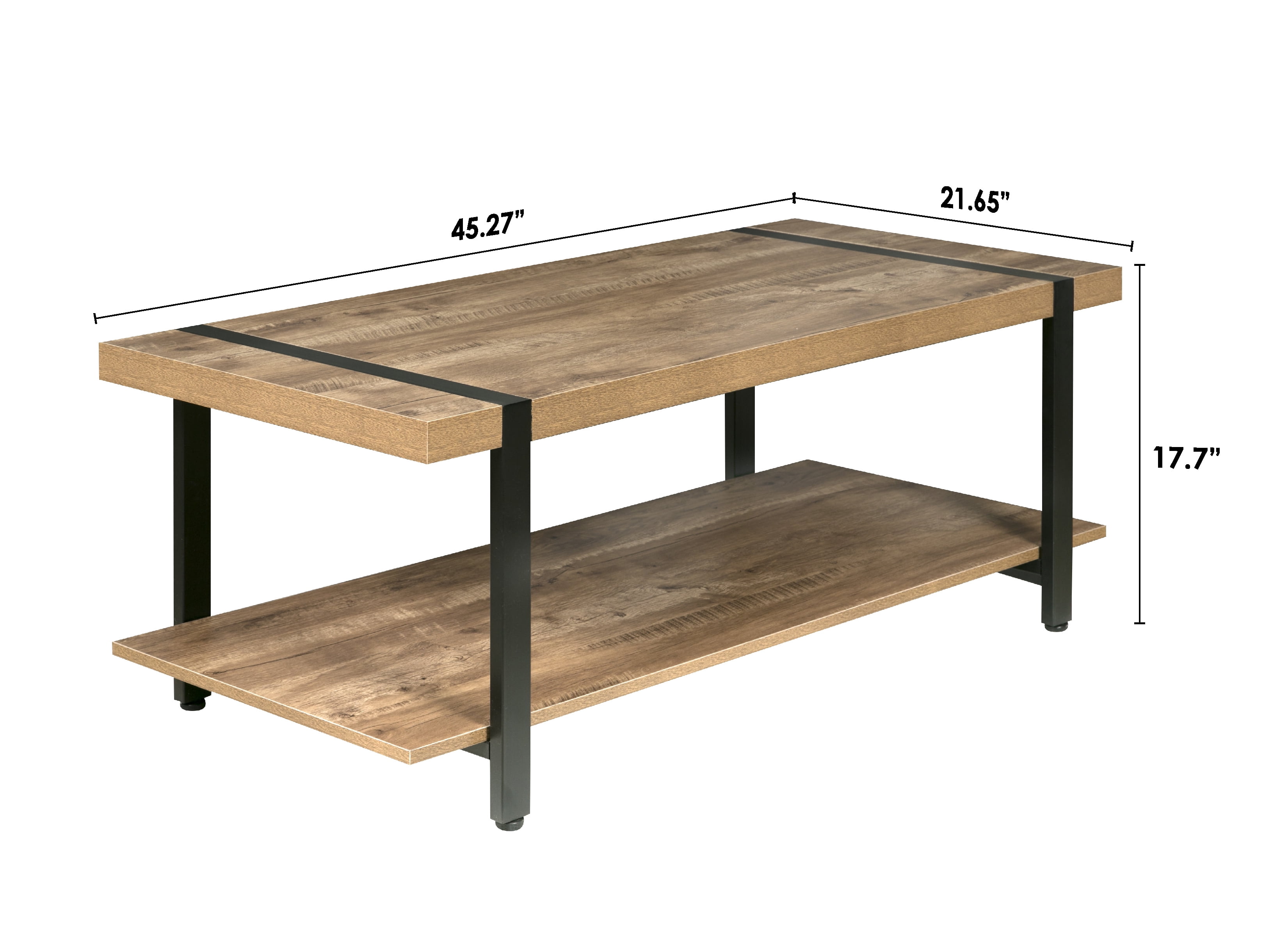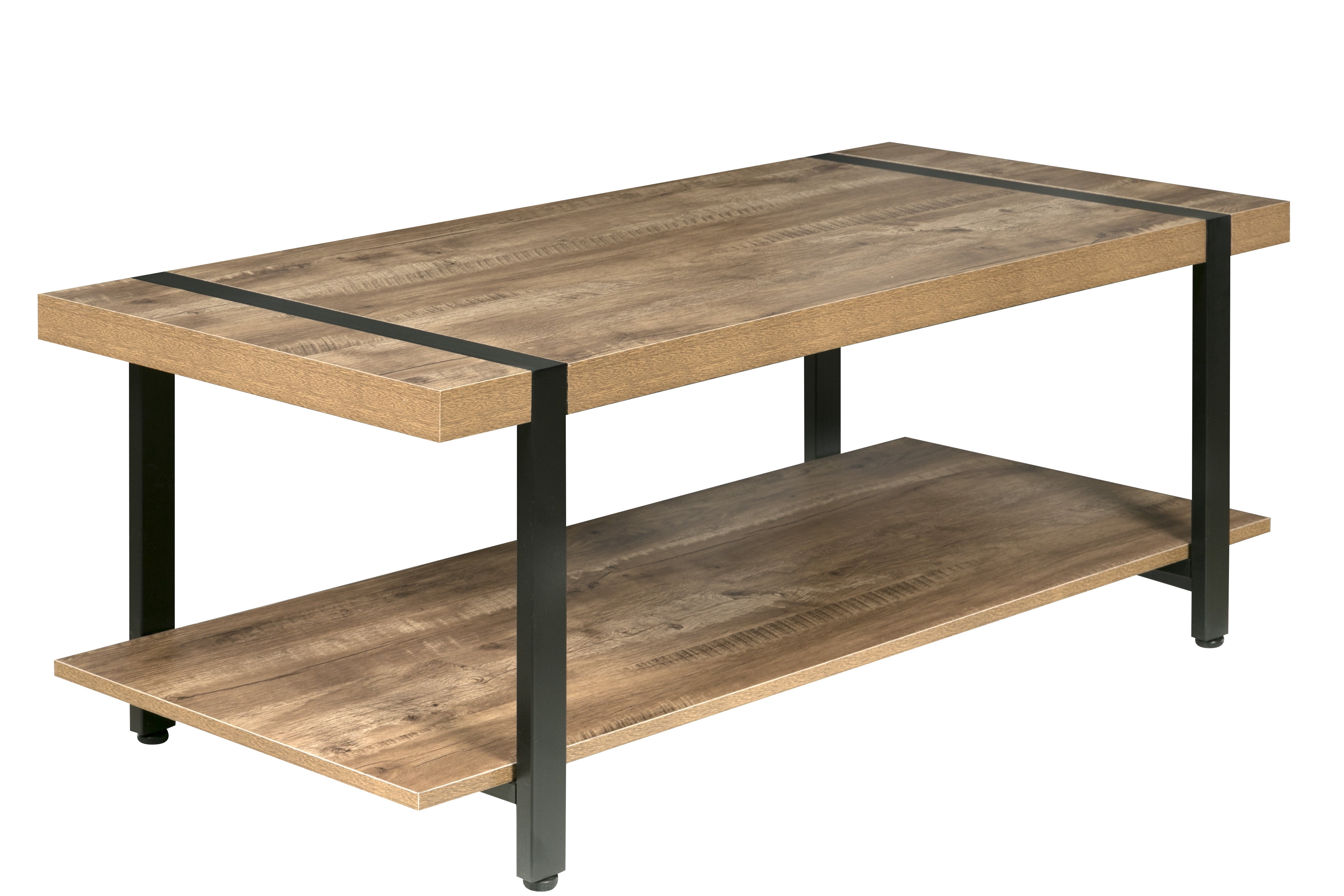 Enhance your living room with the industrial styling of this attractive coffee table from the Bourbon Foundry Collection. With a thick black steel frame and chunky wood-finished tabletop, this table offers the rustic look of work done by blacksmiths of days past. The wide bottom shelf offers plenty of storage space for books, games, or knickknacks. Rich wood finish with black steel accents: a perfect balance between rustic and contemporary Minimalist design; built with thick particle board and black steel Metal frame is inset seamlessly into the wood tabletop; adjustable feet to optimize stability Features lower shelf for storing books, newspapers, decorations Dimensions: 45.27″W x 21.65″D x 17.7″ H – 110 LB weight capacity